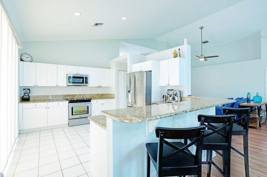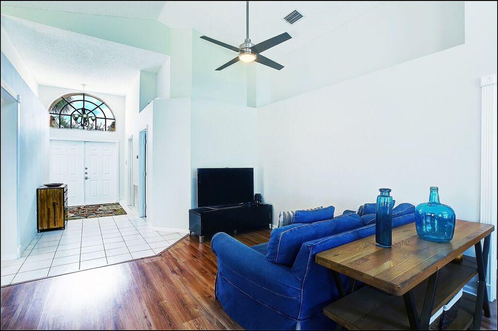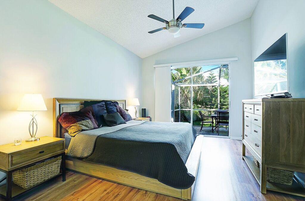 Spacious light and bright home backs onto green space. 3/2 with updated kitchen and appliances. Walk in closets in master. Vaulted ceilings. Freshly painted. Newer appliances. Screened lanai overlooks green space. Plenty of backyard space. Fantastic community amenities include Olympic pool, kiddie pool, picnic bq pavilion, fitness center, tennis, bball. Includes cable, HBO & Internet.