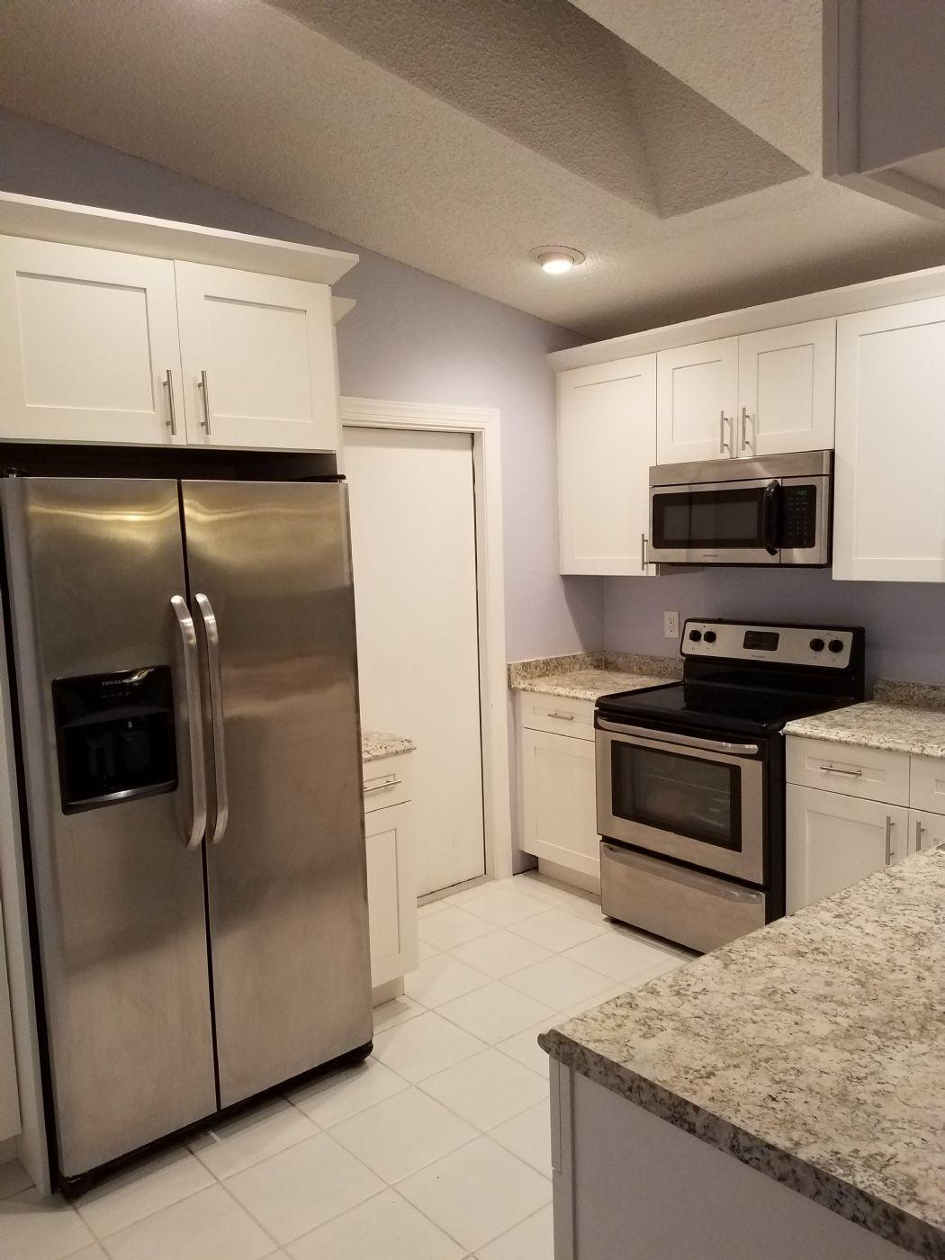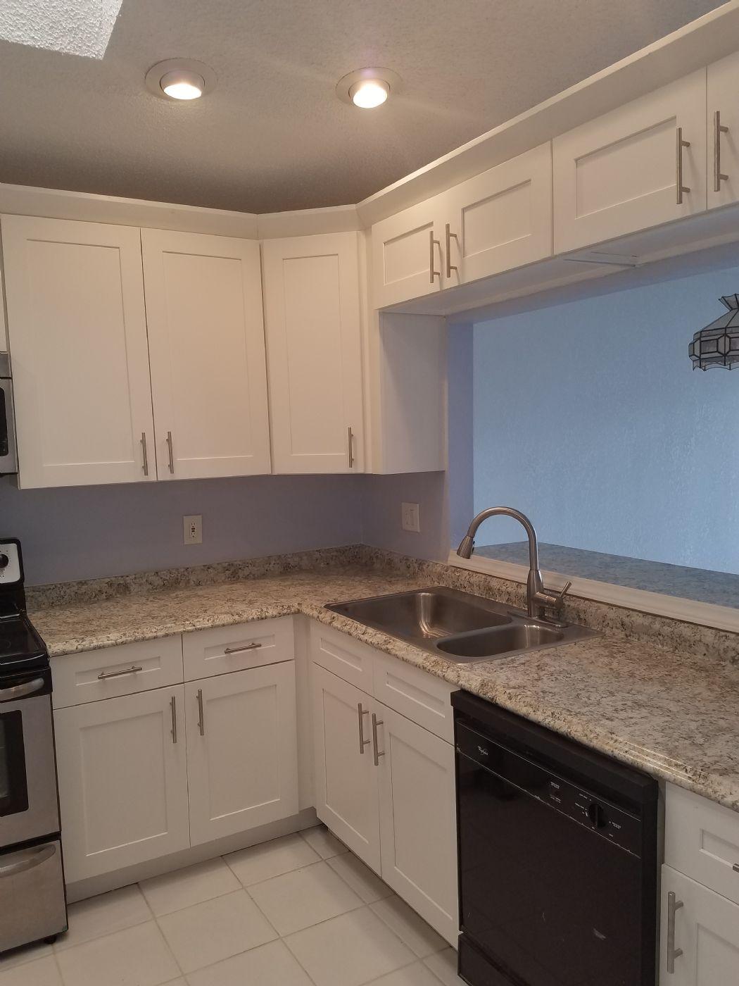 Beautifully upgraded lake side home with vaulted ceilings and sky lights. Stainless steel appliances, spotless Kitchen upgrades with new shaker style cabinets, and a granite styled counter top with serving bar. Luxurious master bath has a roman tub and modern vanity. Master bedroom is appointed with Corner windows with gentle lake setting views. Tile floors in kitchen, dining, and great room finish the new look and the captivating wood laminate flooring brighten all the bedrooms. Covered screened in porch perfect for entertaining and barbeques. It's a great place to live as everything is close to where you will live.