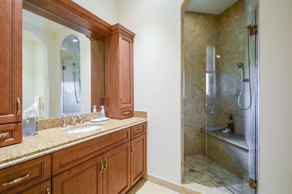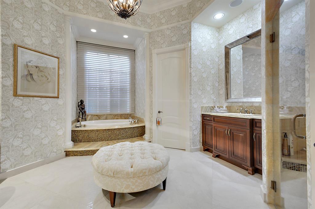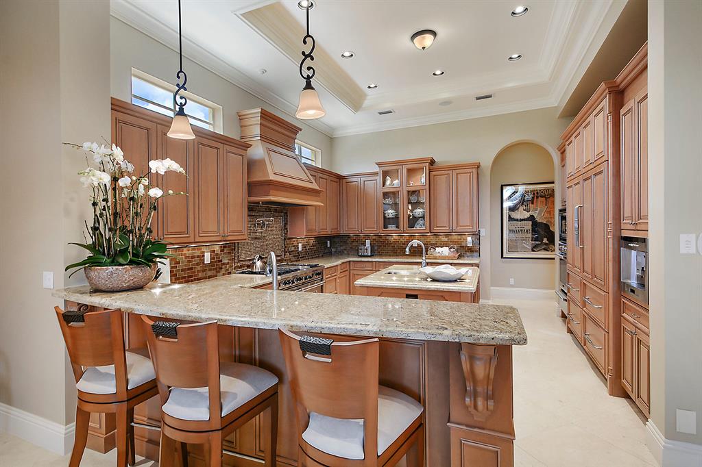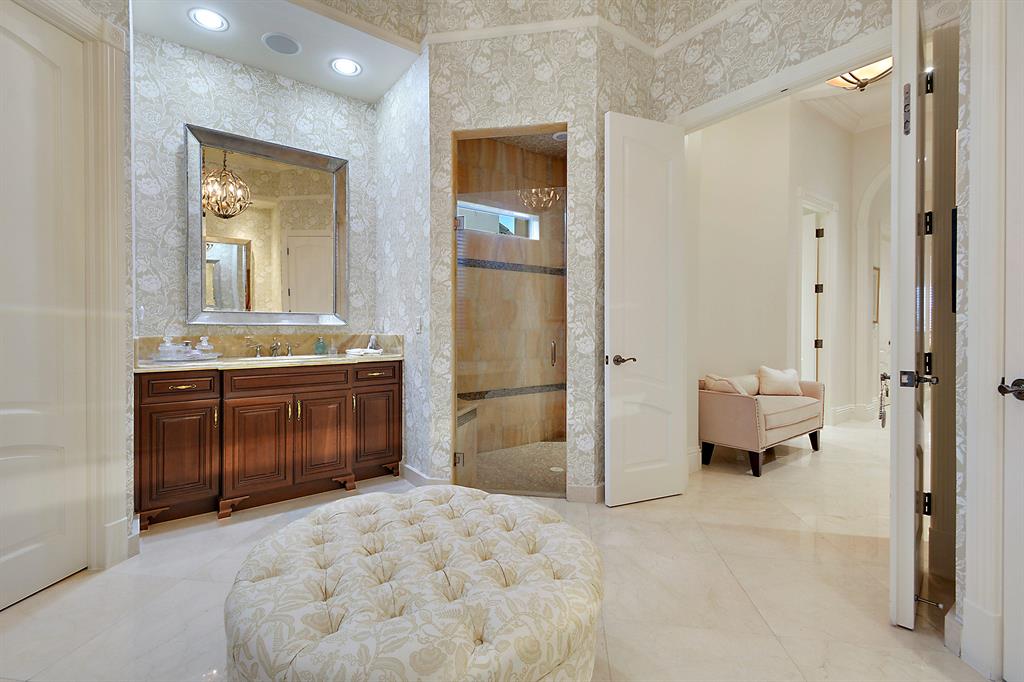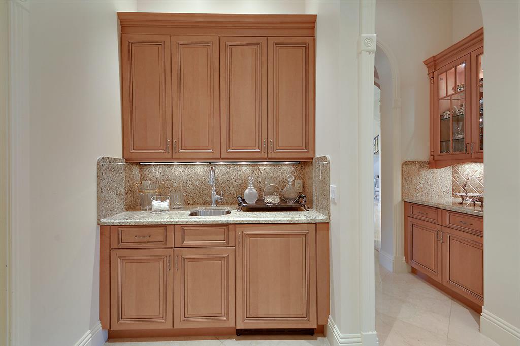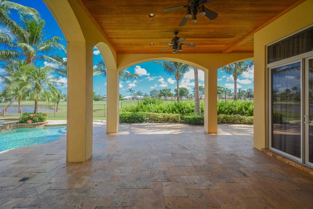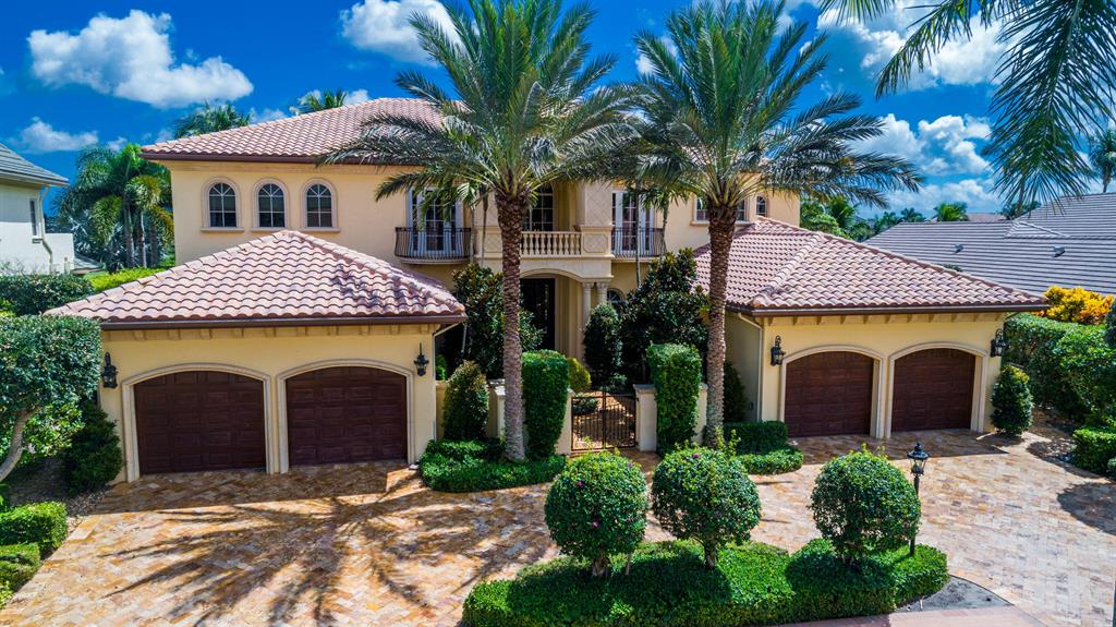 The epitome of sophistication and elegance, this beautiful classic Palm Beach inspired estate features a formal living room, dining room and gourmet chef's kitchen, breakfast room and large family room all designed for effortless entertaining or casual living. The master wing includes a grand master suite with luxurious his and her marble baths, generous closets and customized wood paneled library. An additional guest suite is located on main floor. Four en suite guest bedrooms, a home theatre and loft area, and additional laundry are on the second floor. An outdoor entertainment area is lushly landscaped with breathtaking panoramic golf course vistas and features a resort style pool, covered loggia and summer kitchen. Other amenities include hurricane resistant windows and doors,