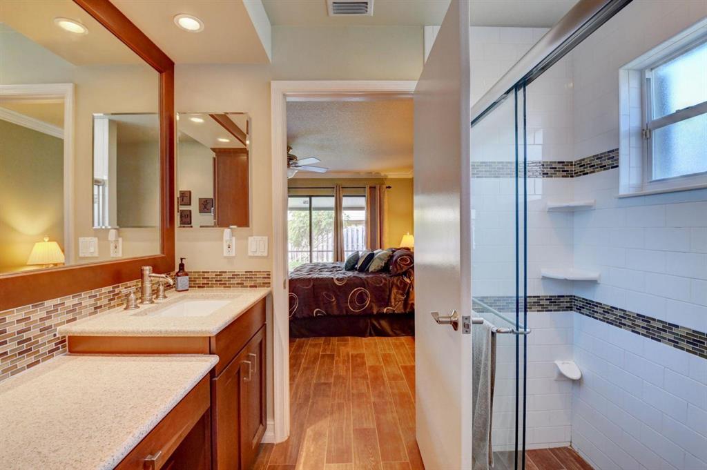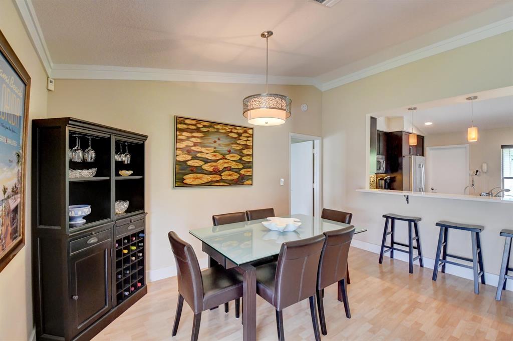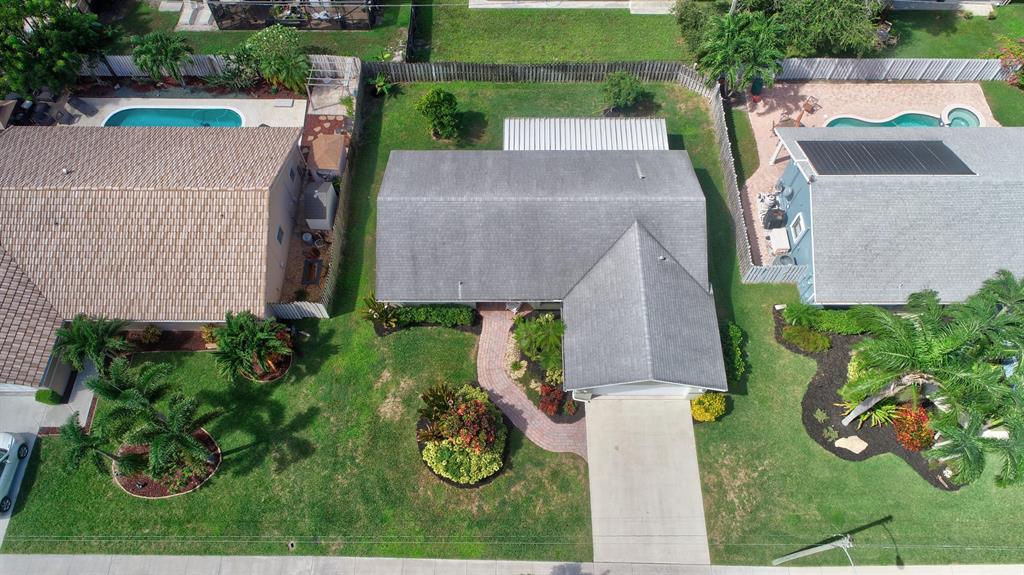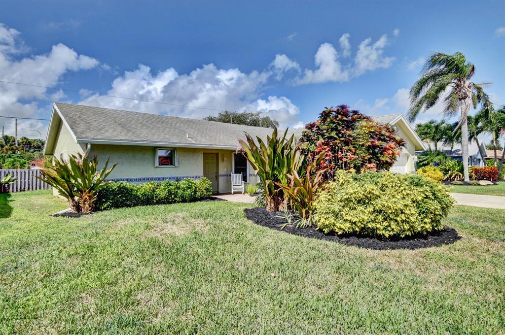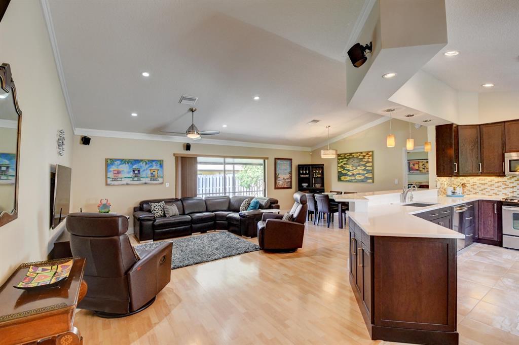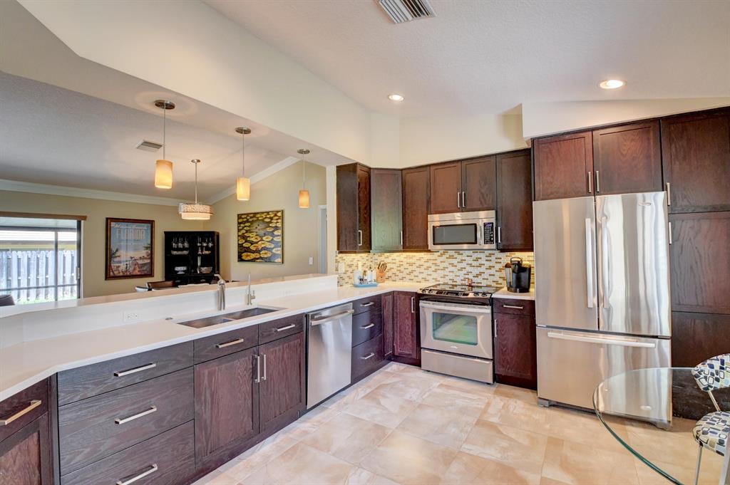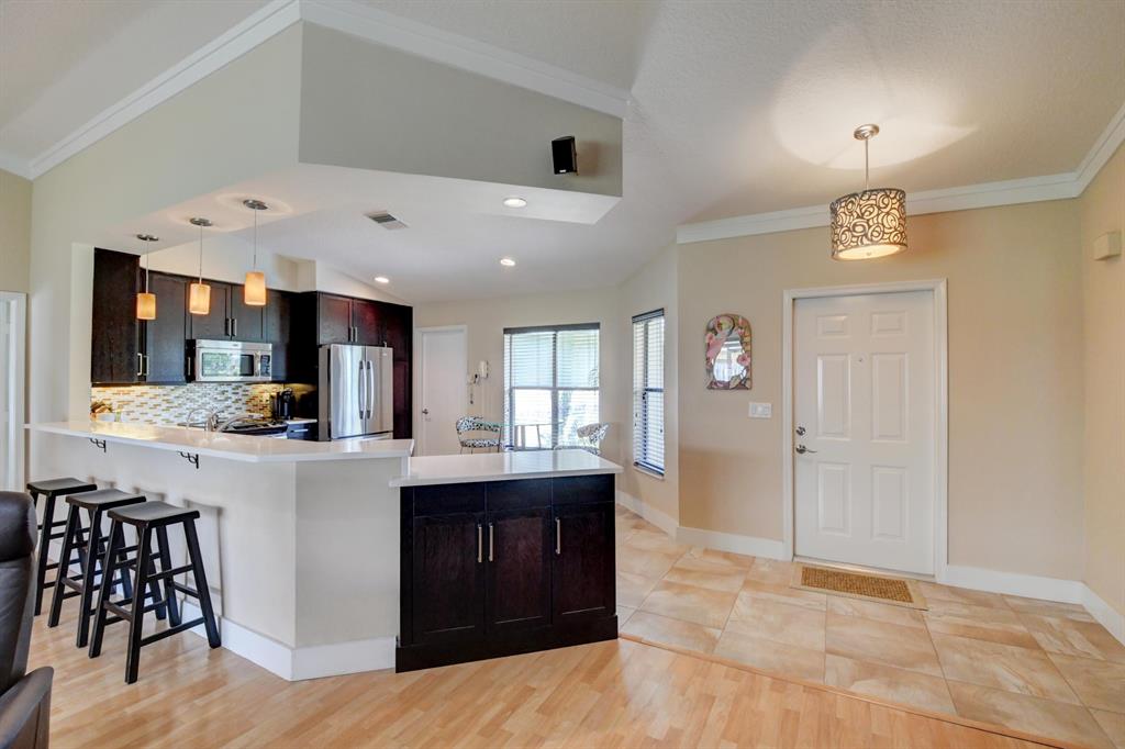 This house lives large! Great room/open kitchen concept with beautiful renovated kitchen that is a dream - whether you cook or entertain with take-out! Espresso cabinets, white quartz/Silestone counters, mosaic backsplash, stainless appliances including French door refrigerator, soft close cabinets and chic pendant lights over the counter with bar seating - all add up to an extra special kitchen. Both bathrooms are also renovated and ready to be enjoyed - nice soothing neutral tones. New updated wood-plank style tile flooring in master bedroom/bath. House has crown molding in the living area and master bedroom, plantation shutters and for hurricane protection - accordion shutters. The floor plan is split - master is private and to one side. Room for a pool. More details click here