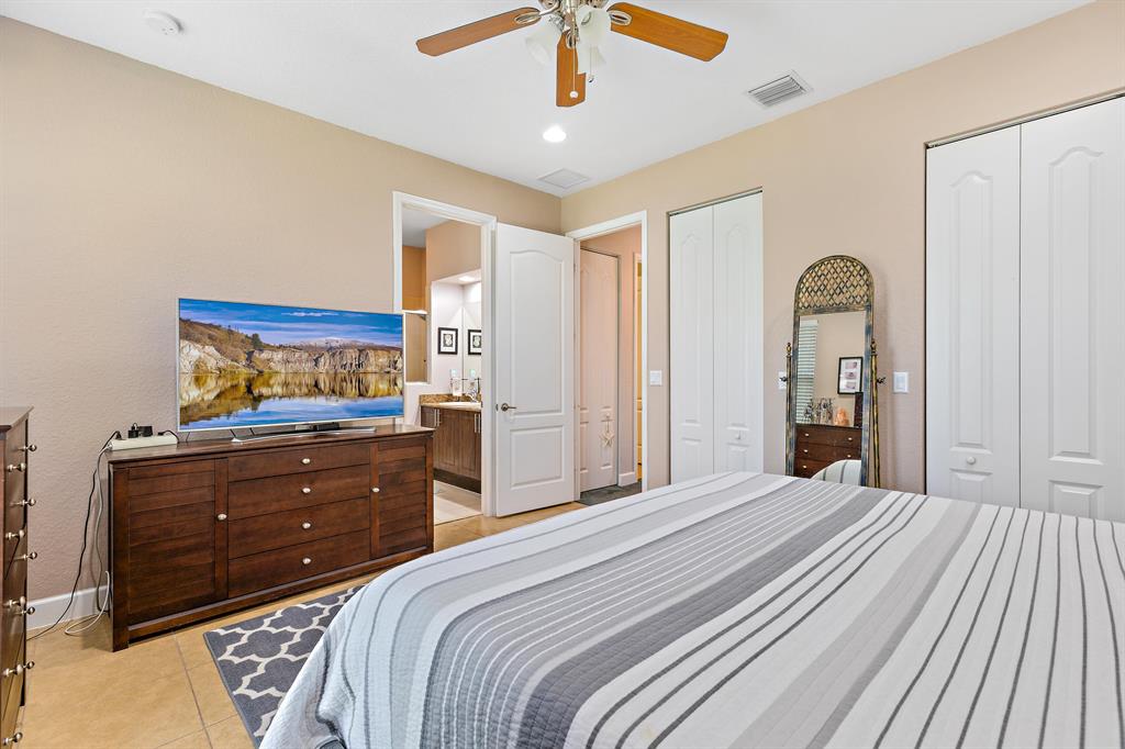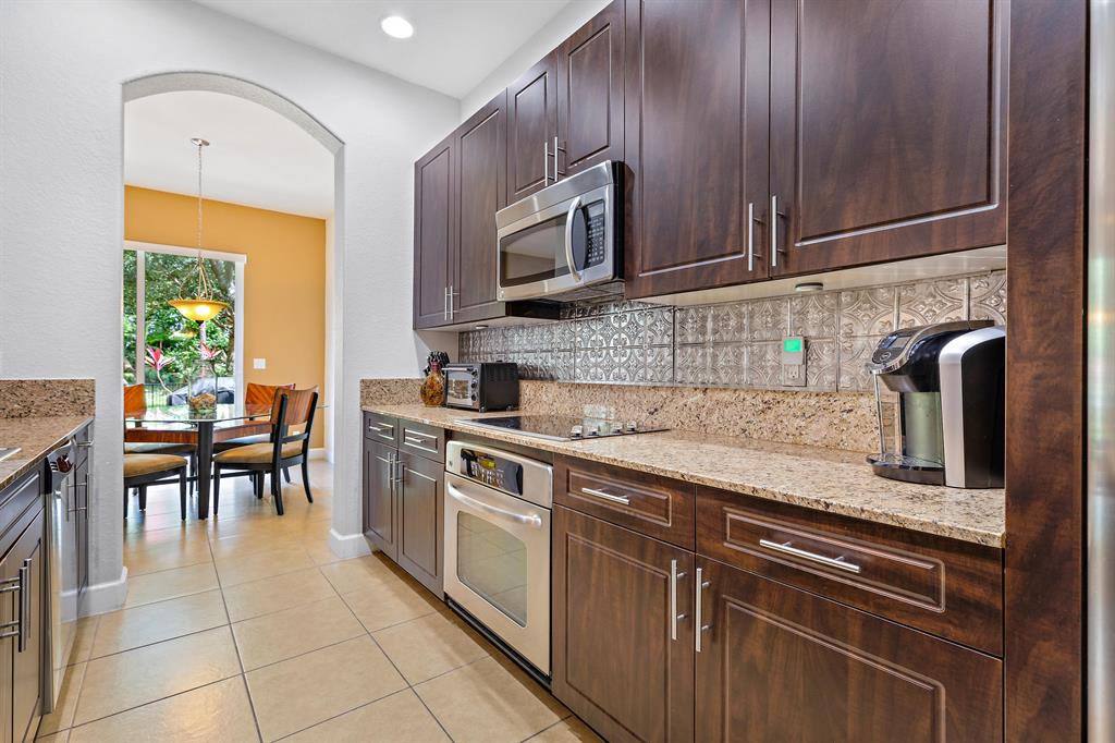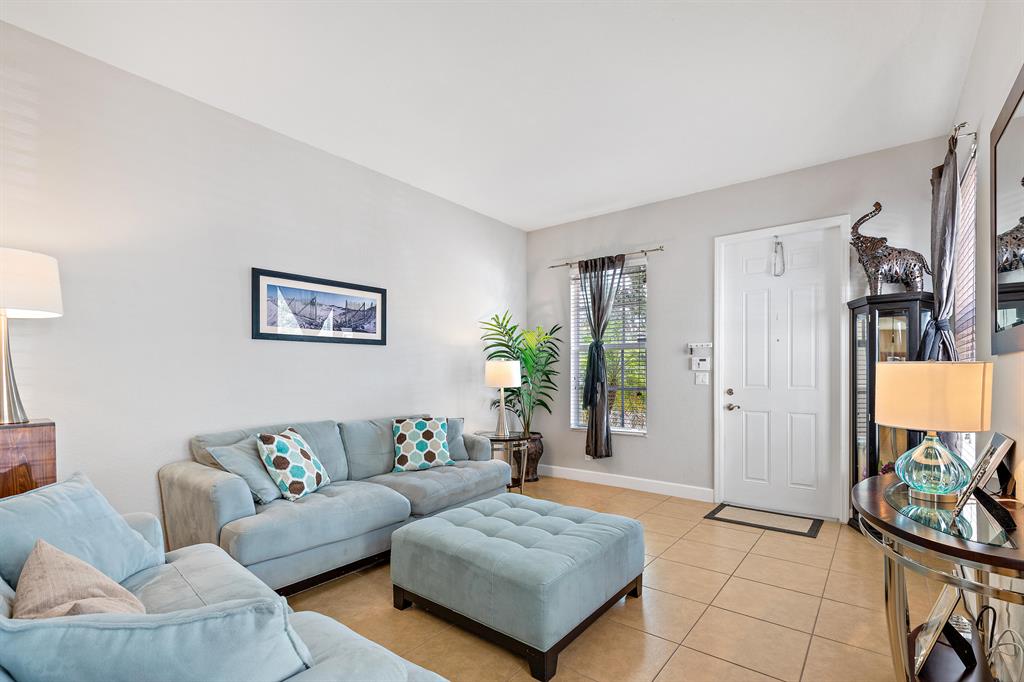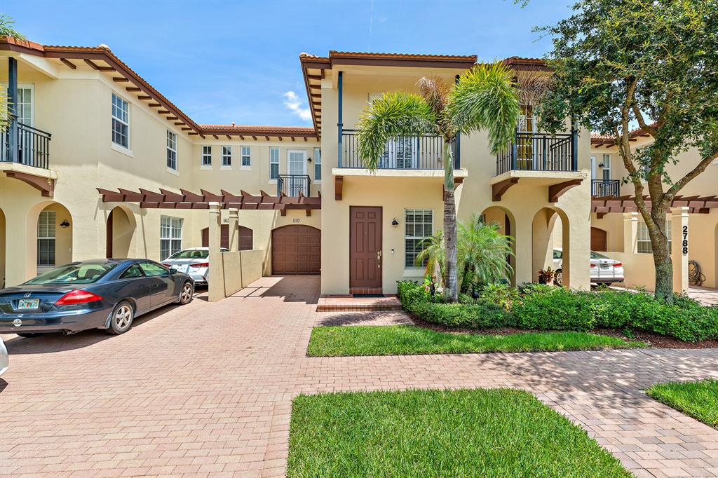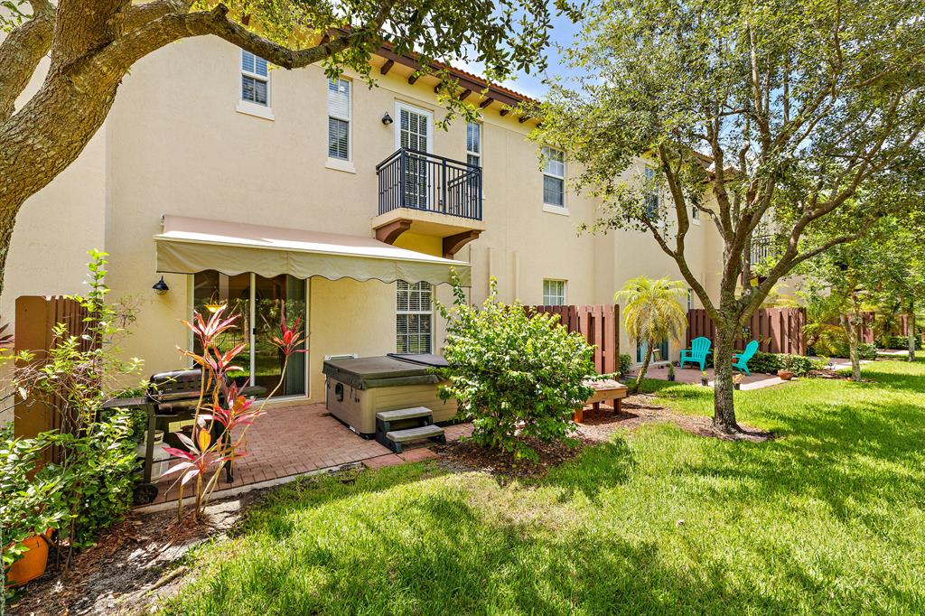 Beautiful 3/3.1 townhome with garage! This large townhome has high ceilings, 8' doors, tiled thru-out with carpet on stairs and hallwy. Two Master Suites and a 3rd bedroom and bath. Powder room is on the first floor. Formal living room. Family room just off of kitchen and overlooks back patio and landscape. This home has impact windows, AC is less than a year old, new washer, new electric shade on patio. The community has new gate coming and is all paid for! Mediterranean community with pool, beautifully landscaped, walking/jogging path. (Hot tub shown does not work)