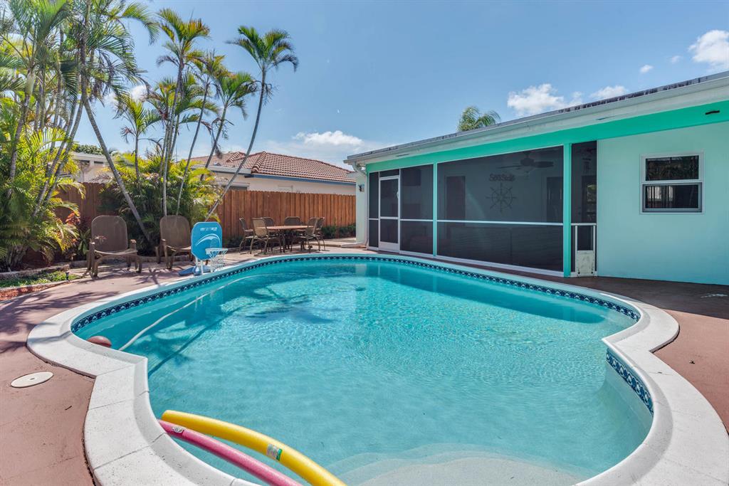 Beautifully updated, 4 bedroom 2 bathroom house in the heart of Boca Square. Large size pool and spacious backyard with a covered, screened-in patio area. Custom built outdoor hot shower. Pavers in the front and back of the house provide several areas to sit and relax. One and half size garage with built in custom shelves and work bench. Tons of updates inside including recessed lighting, gorgeous floors, and top of the line stainless steel appliances. Very efficient 4.5 Ton Carrier AC is one year old and was put in along with all new ducts throughout the house plus a UV light. Impact windows throughout. Very limited inventory and this house is absolutely move-in ready.