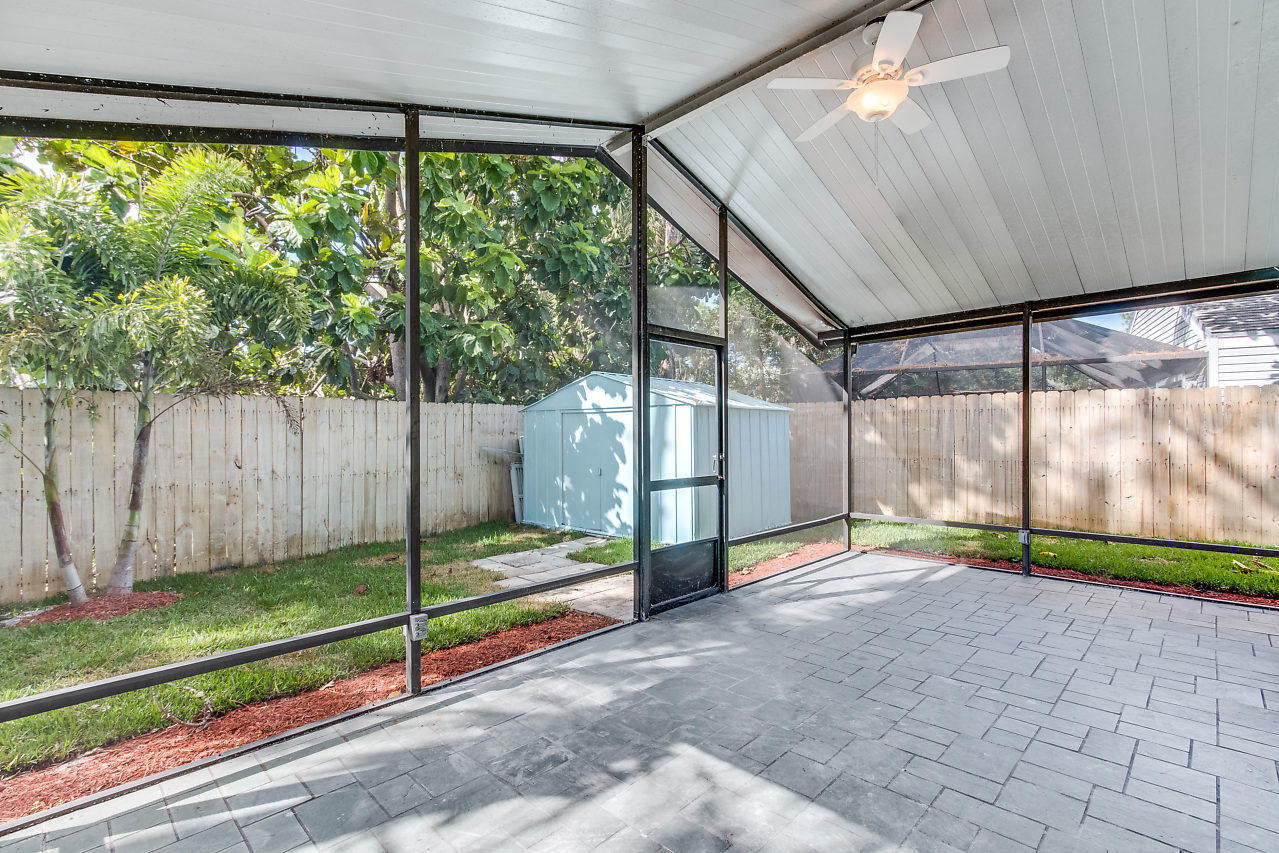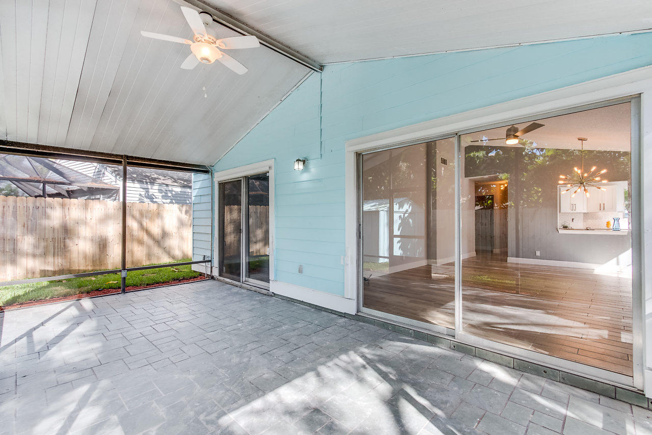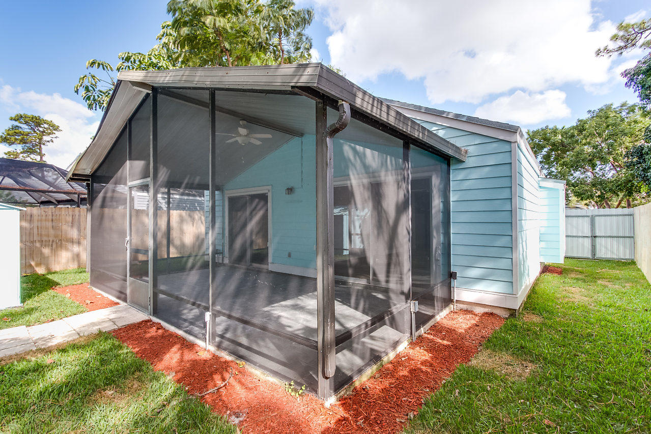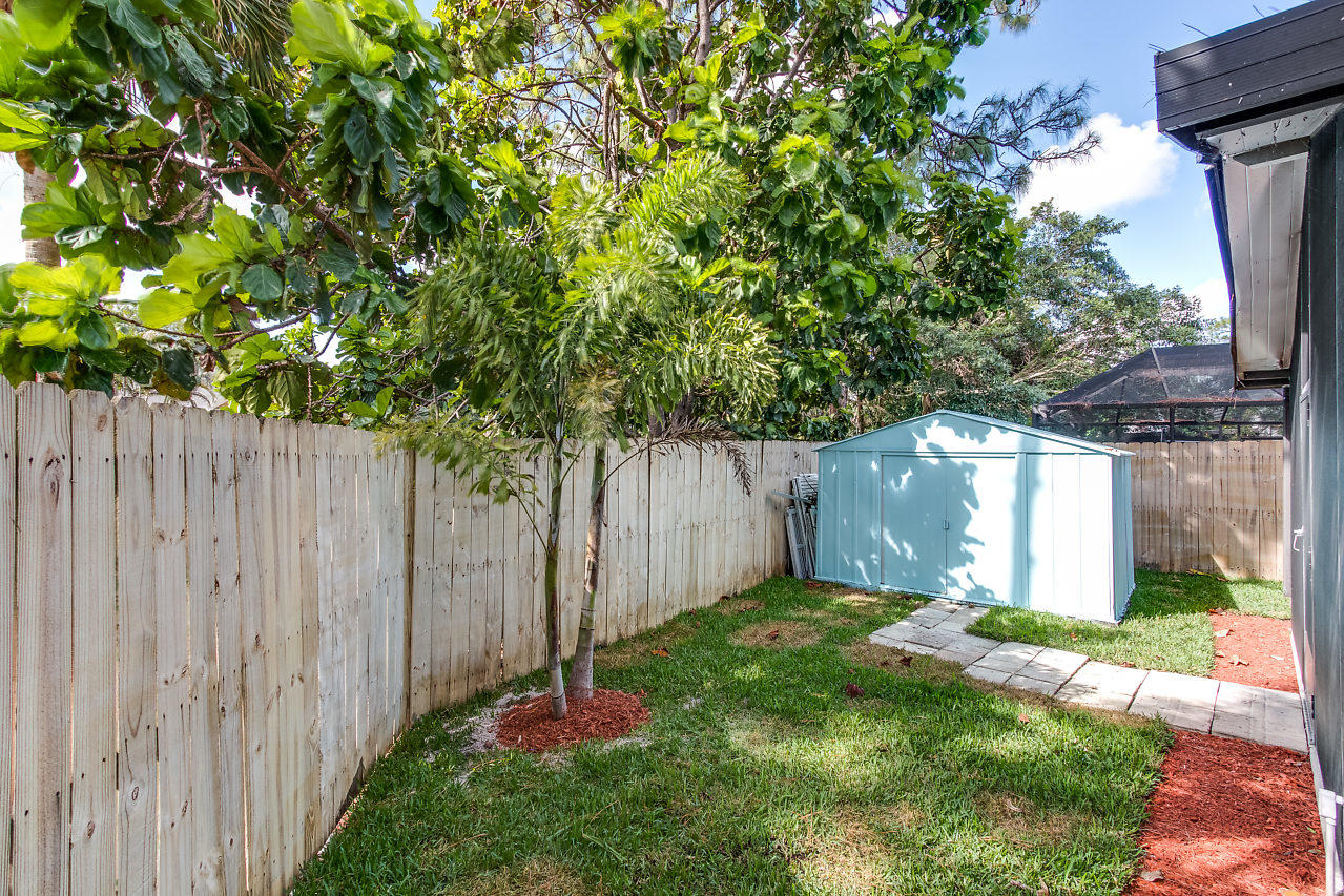 COMPLETELY REMODELED TOP TO BOTTOM WITH DESIGNER HOME MATERIALS!! This 3 bedroom, 2 bath, 2 car garage single story, single family home has been completely renovated top to bottom, inside and out! Beginning on the outside the property borders common area space. The landscape is all new with newly planted sod, plants and a brand new, complete sprinkler system! The yard is fully privacy fenced in with a 10x8 storage shed and a large screened in covered patio. The exterior siding of the home was completely redone and freshly painted. The garage door and opener are brand new. The entire interior of the home is new as well with high-end materials. A brand new Carrier AC system with smart Nest thermostat, brand new hot water heater, designer lighting fixtures, wood plank tile throughout!