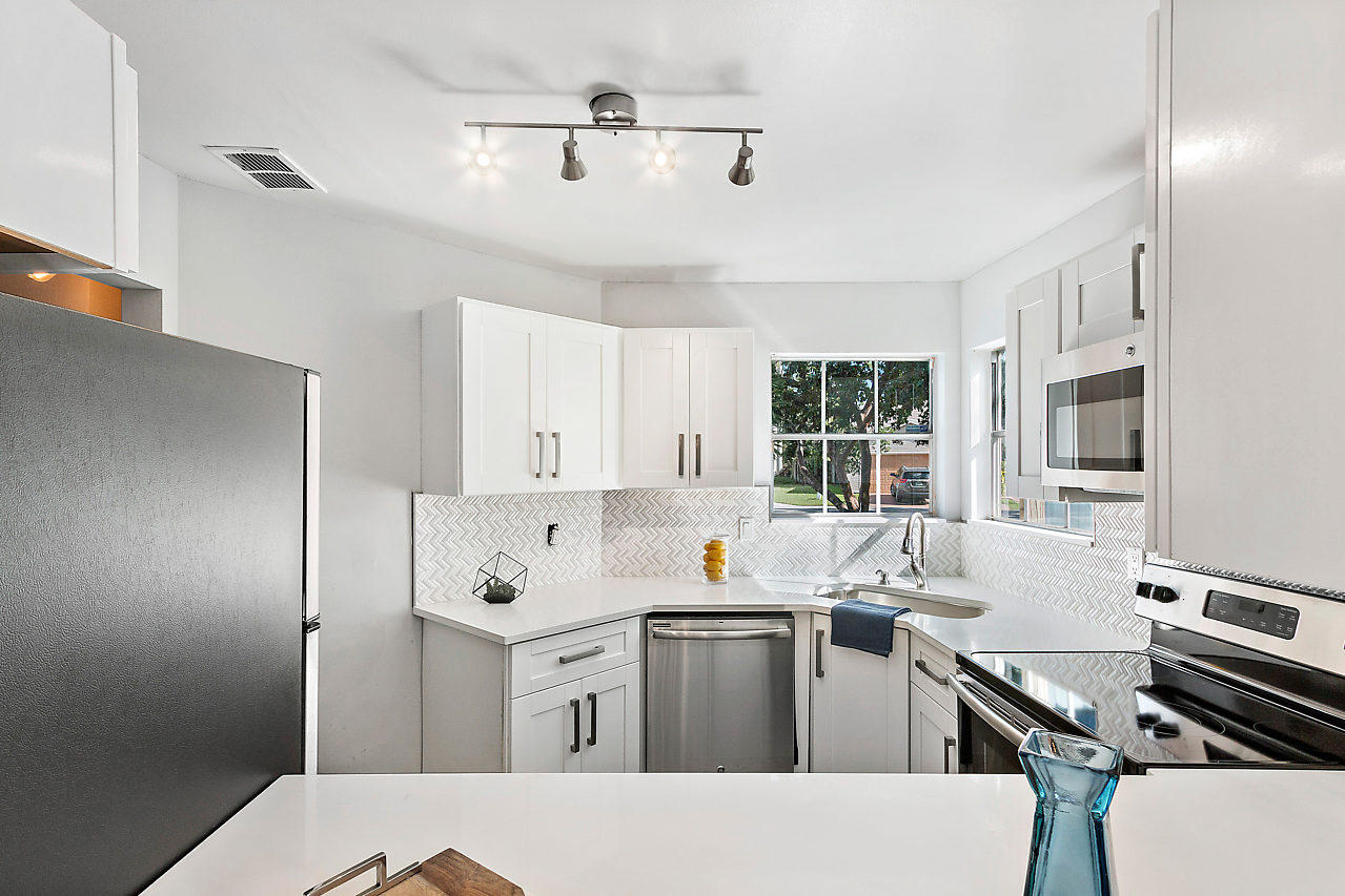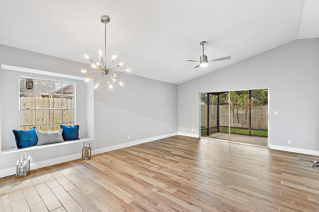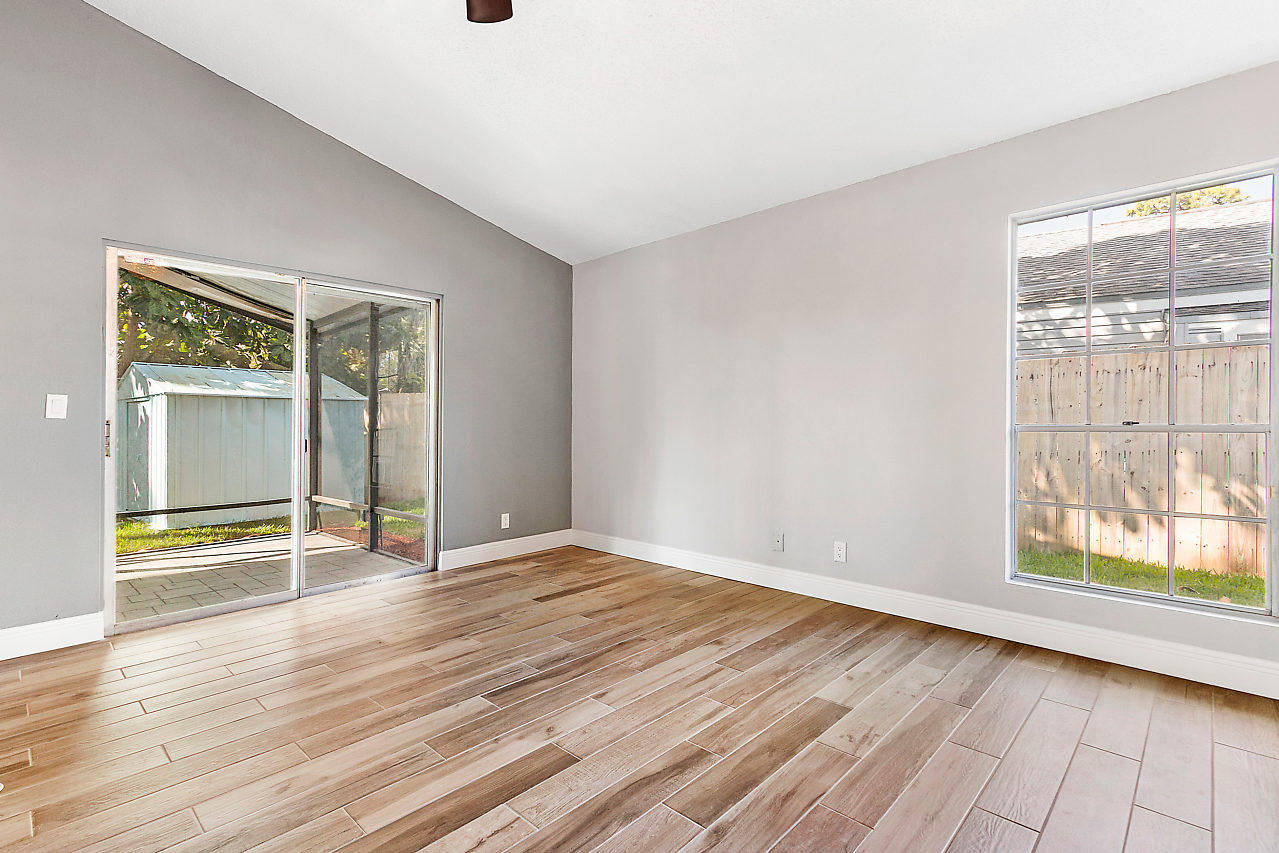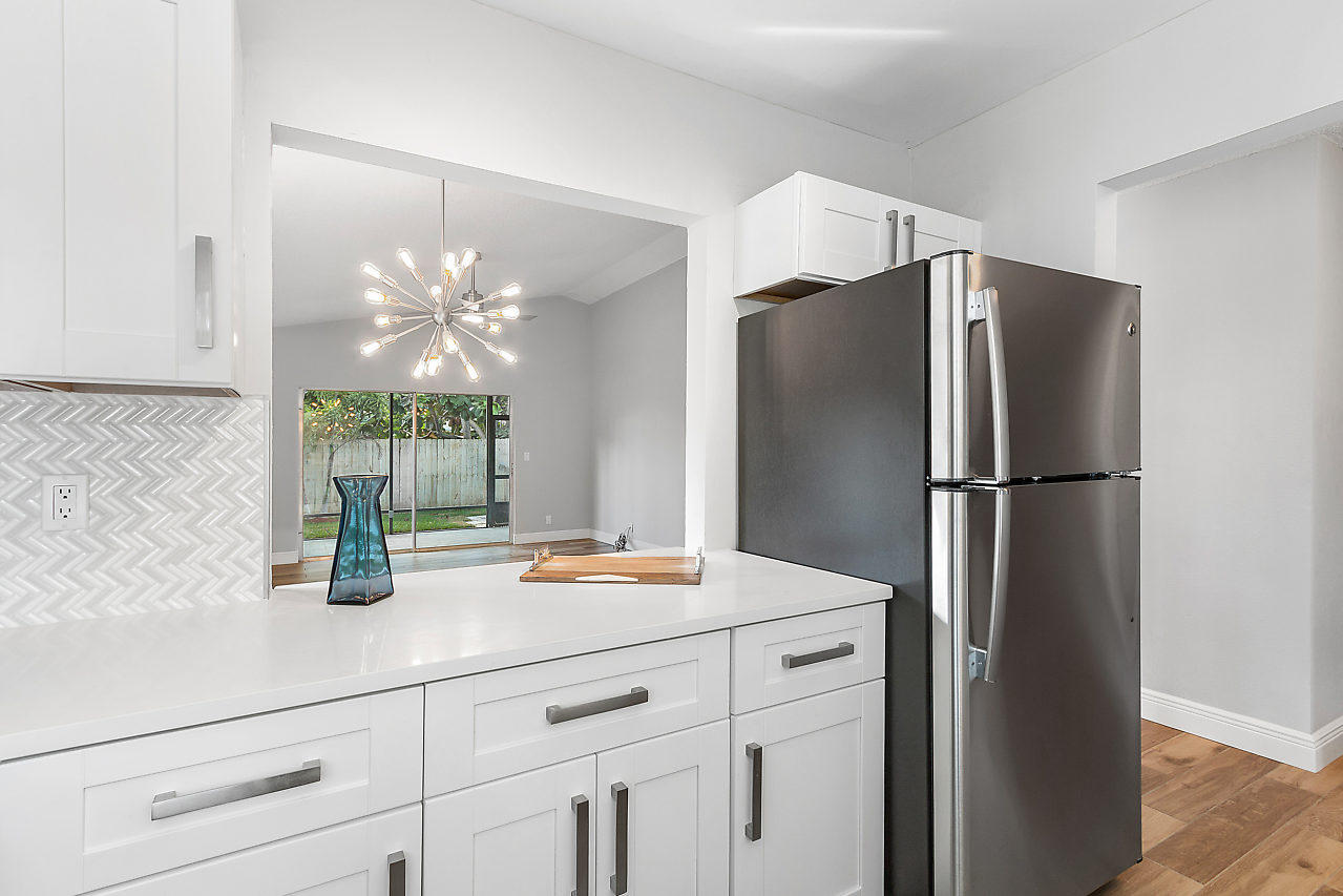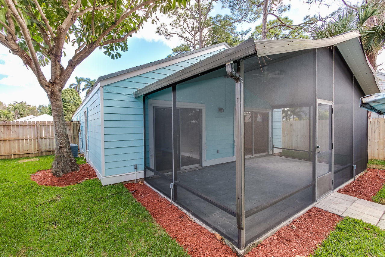 COMPLETELY REMODELED TOP TO BOTTOM WITH DESIGNER HOME MATERIALS!! This 3 bedroom, 2 bath, 2 car garage single story, single family home has been completely renovated top to bottom, inside and out! Beginning on the outside the property borders common area space. The landscape is all new with newly planted sod, plants and a brand new, complete sprinkler system! The yard is fully privacy fenced in with a 10x8 storage shed and a large screened in covered patio. The exterior siding of the home was completely redone and freshly painted. The garage door and opener are brand new. The entire interior of the home is new as well with high-end materials. A brand new Carrier AC system with smart Nest thermostat, brand new hot water heater, designer lighting fixtures, wood plank tile throughout!