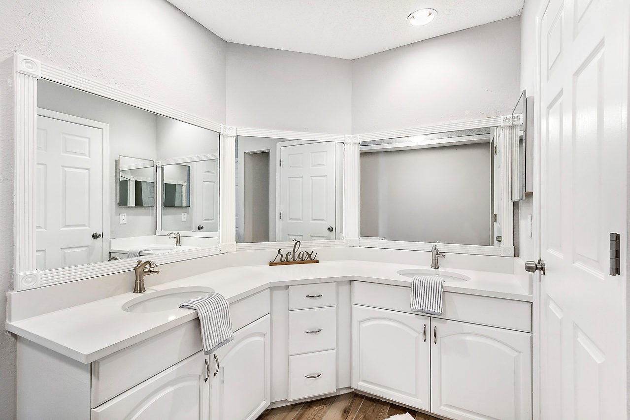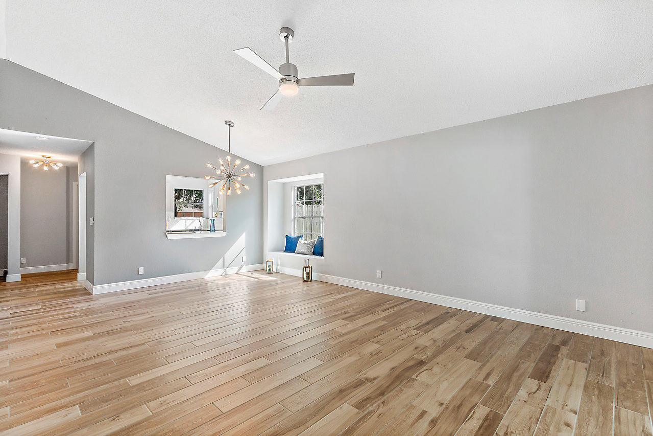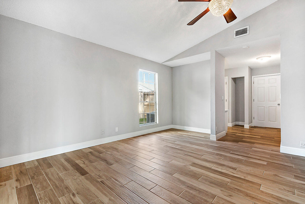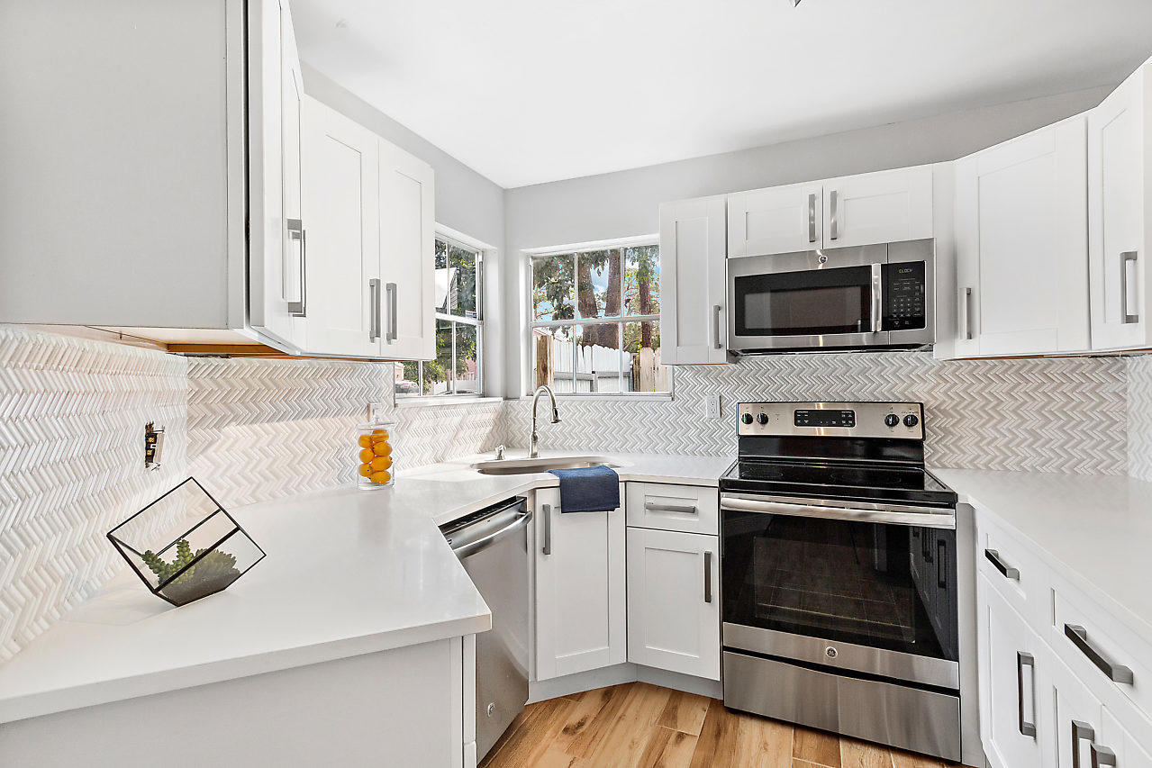 COMPLETELY REMODELED TOP TO BOTTOM WITH DESIGNER HOME MATERIALS!! This 3 bedroom, 2 bath, 2 car garage single story, single family home has been completely renovated top to bottom, inside and out! Beginning on the outside the property borders common area space. The landscape is all new with newly planted sod, plants and a brand new, complete sprinkler system! The yard is fully privacy fenced in with a 10x8 storage shed and a large screened in covered patio. The exterior siding of the home was completely redone and freshly painted. The garage door and opener are brand new. The entire interior of the home is new as well with high-end materials. A brand new Carrier AC system with smart Nest thermostat, brand new hot water heater, designer lighting fixtures, wood plank tile throughout!