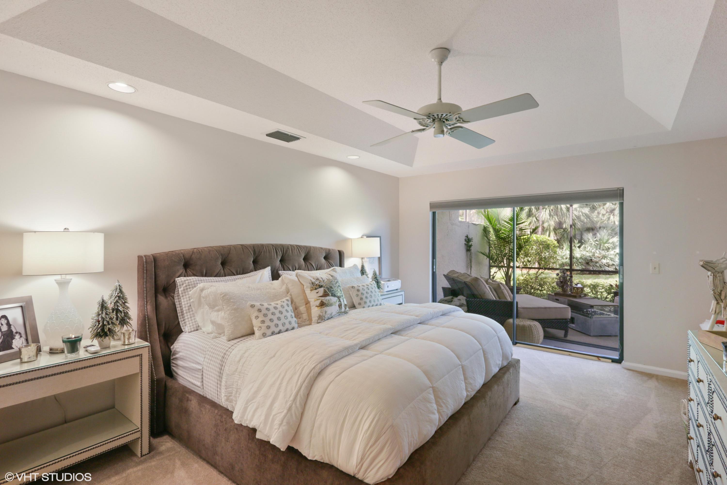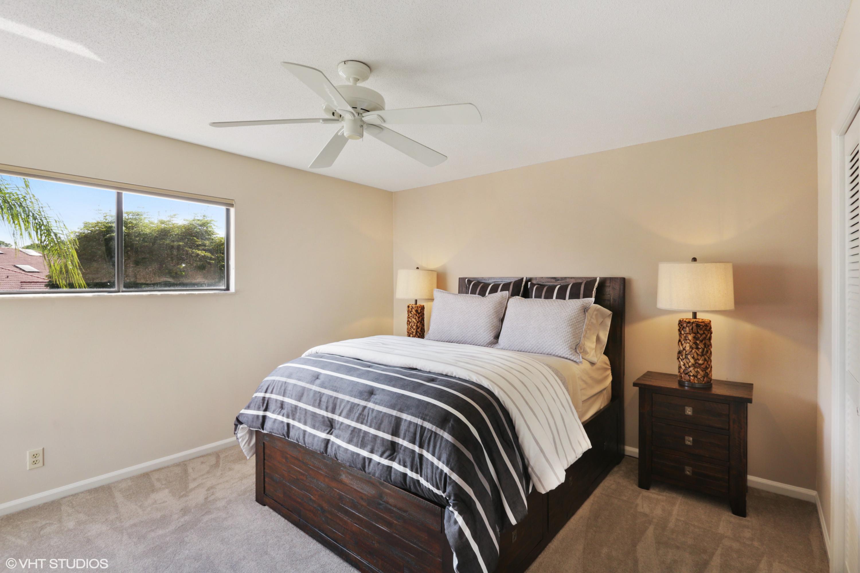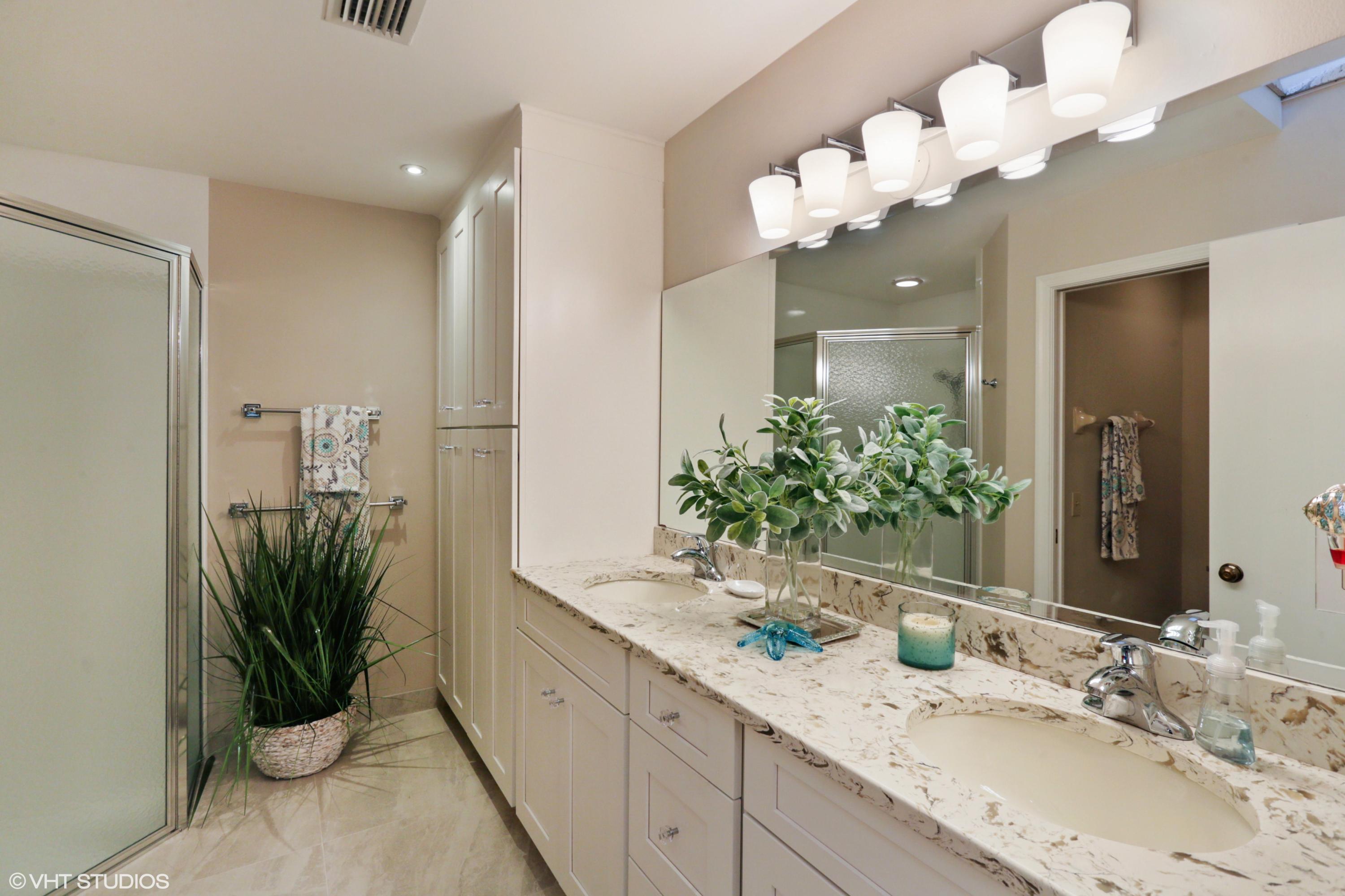 Spacious Breakers West townhouse with 3BR, 2.5 BA, 2-car garage and amazing privacy. Recently updated with new kitchen, flooring, & baths in popular grey and white palette. Dramatic Great Room with sliding doors & transom windows above opens to screened patio overlooking open space, towering palms and pines. 1st floor Master suite has tray ceiling, sliding doors to patio, His and Her closets. Updated Master Bath with white cabinetry, quartz counters and chrome plumbing fixtures. 2 Guest BR upstairs share updated bath. Bedroom 2 opens to rooftop deck. HOA includes landscaping, security, alarm monitoring, basic cable, roof & exterior maintenance, and ext building insurance. Also avail for annual unfurn lease @ $3,200/mon. Breakers West has club memberships available but are NOT mandatory.