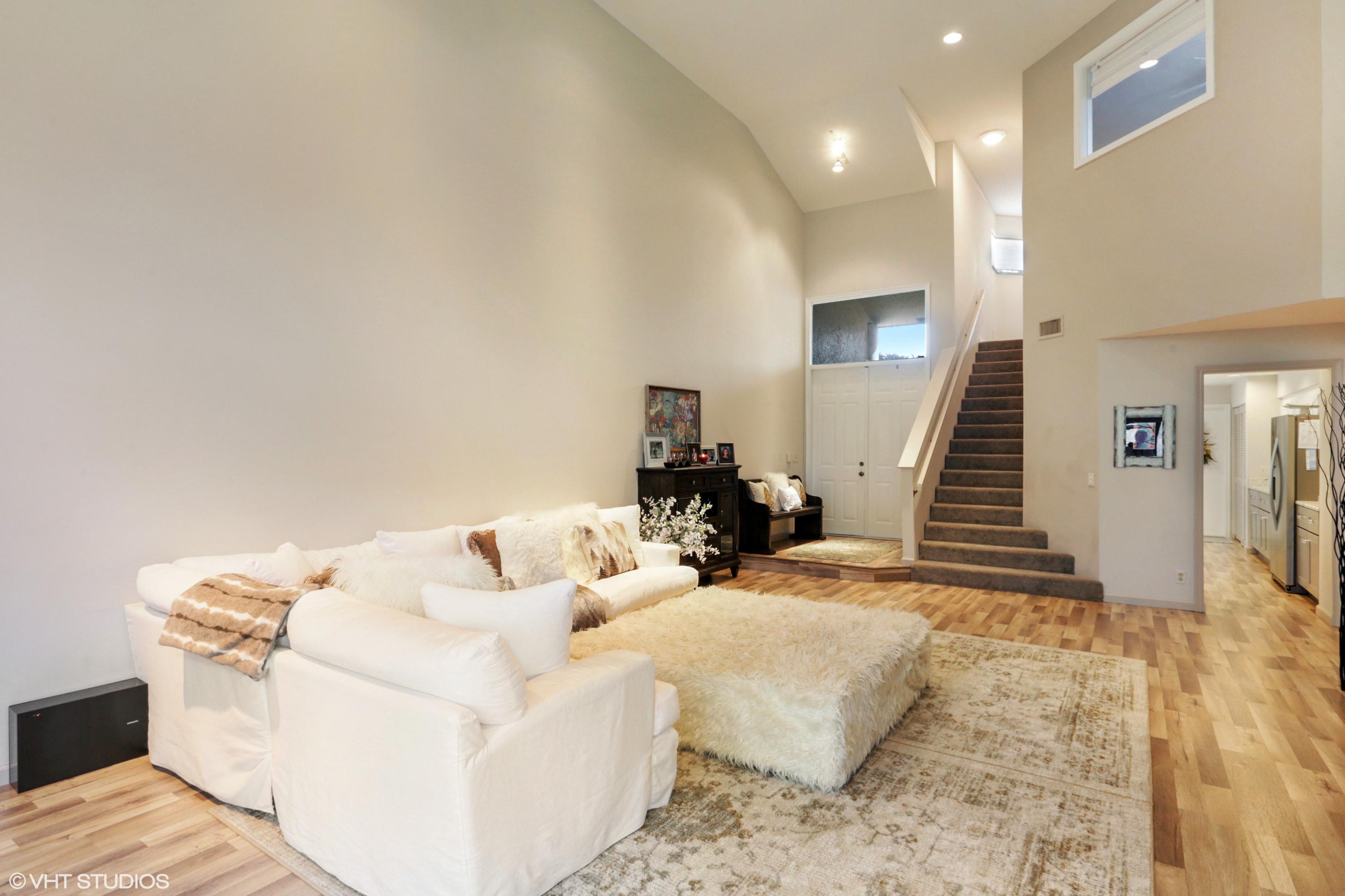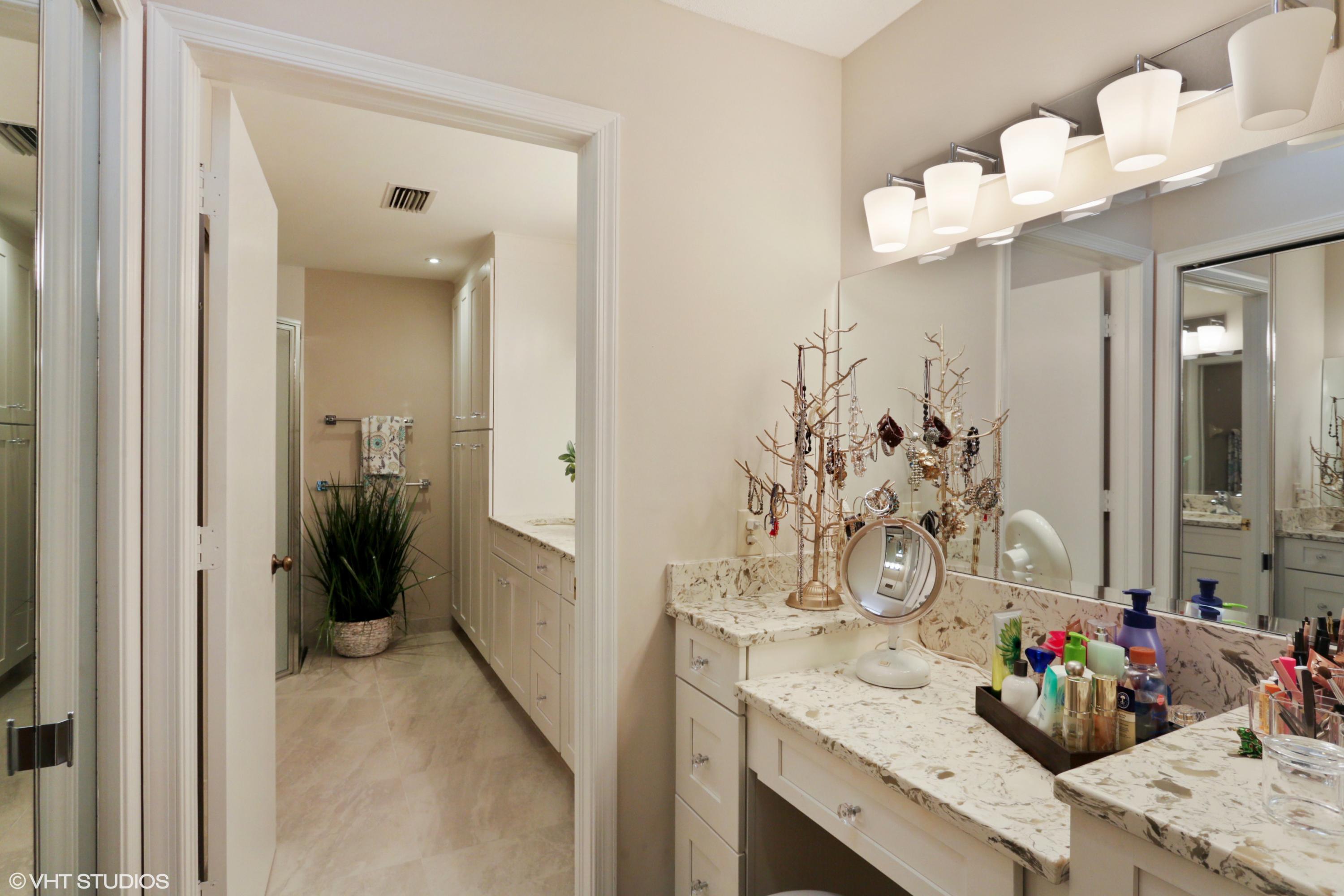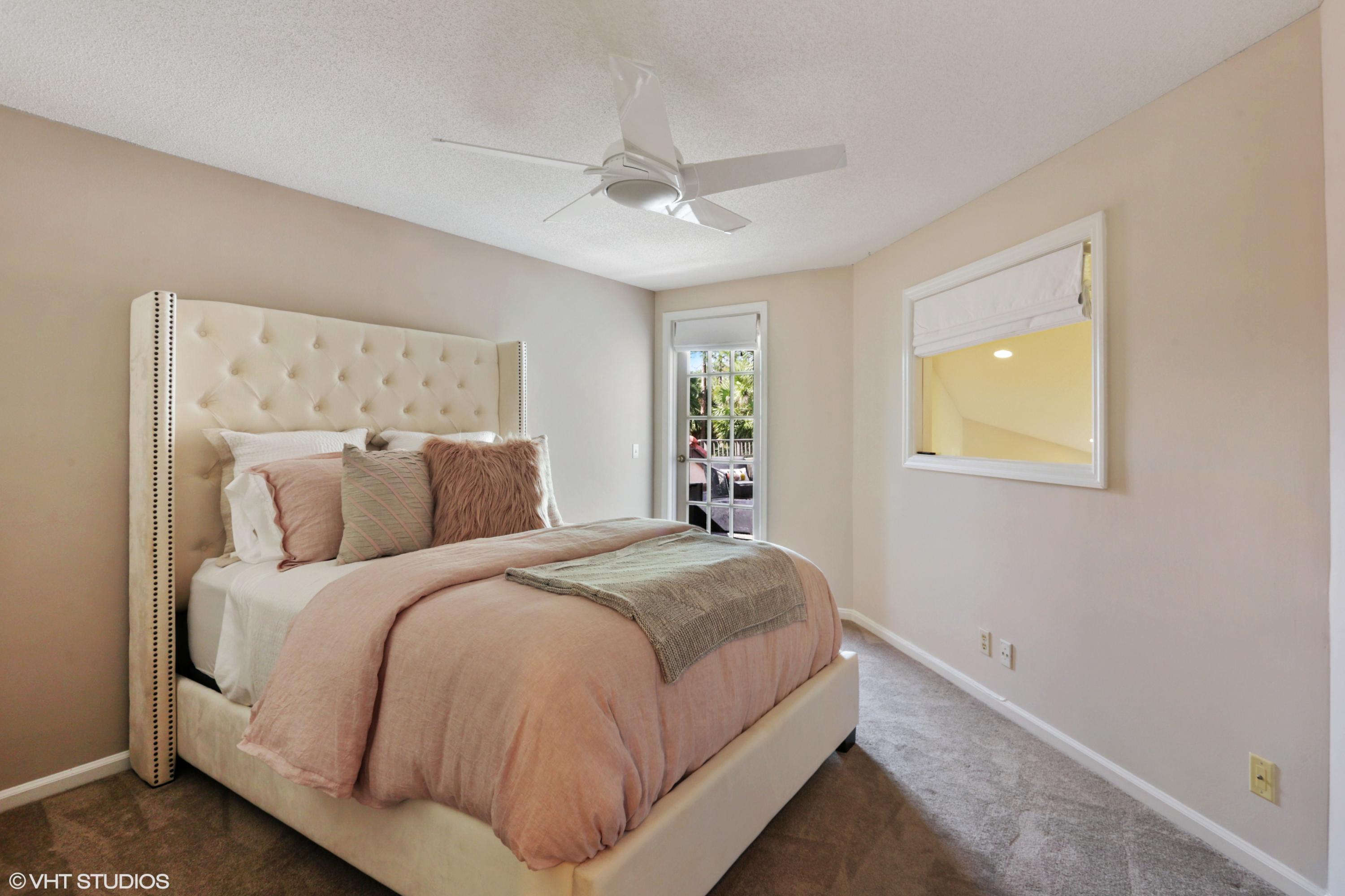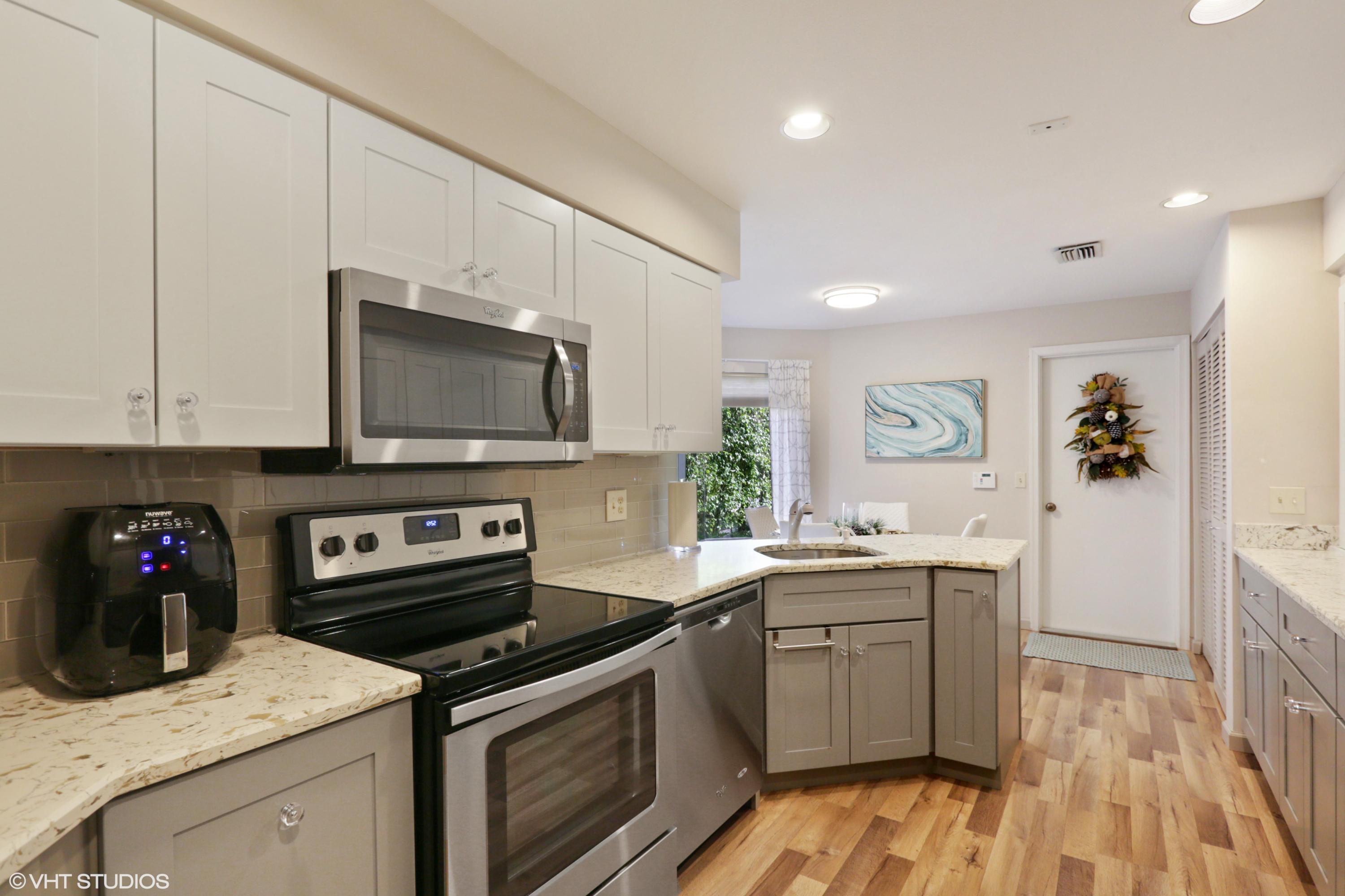 Spacious Breakers West townhouse with 3BR, 2.5 BA, 2-car garage and amazing privacy. Recently updated with new kitchen, flooring, & baths in popular grey and white palette. Dramatic Great Room with sliding doors & transom windows above opens to screened patio overlooking open space, towering palms and pines. 1st floor Master suite has tray ceiling, sliding doors to patio, His and Her closets. Updated Master Bath with white cabinetry, quartz counters and chrome plumbing fixtures. 2 Guest BR upstairs share updated bath. Bedroom 2 opens to rooftop deck. HOA includes landscaping, security, alarm monitoring, basic cable, roof & exterior maintenance, and ext building insurance. Also avail for annual unfurn lease @ $3,200/mon. Breakers West has club memberships available but are NOT mandatory.