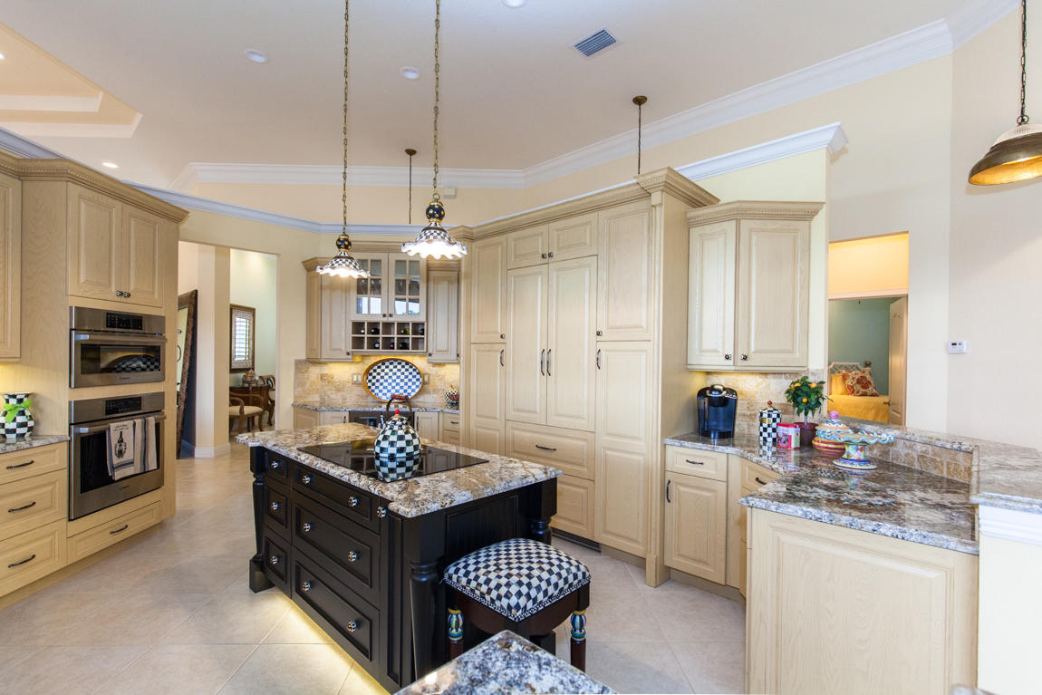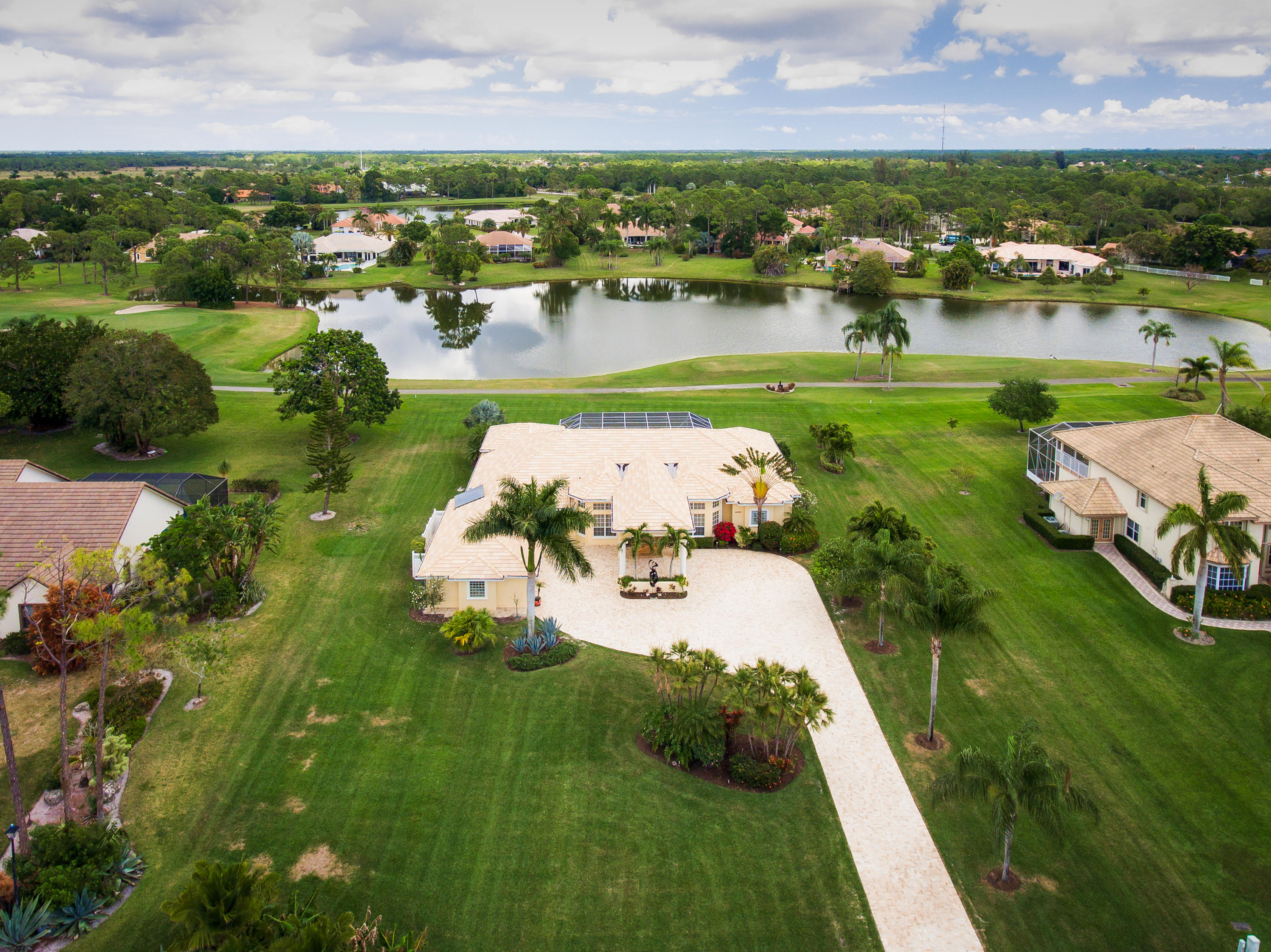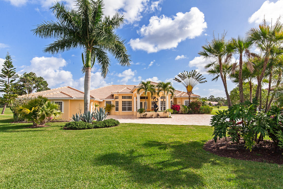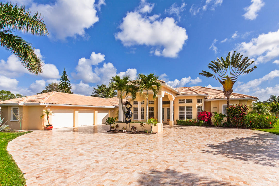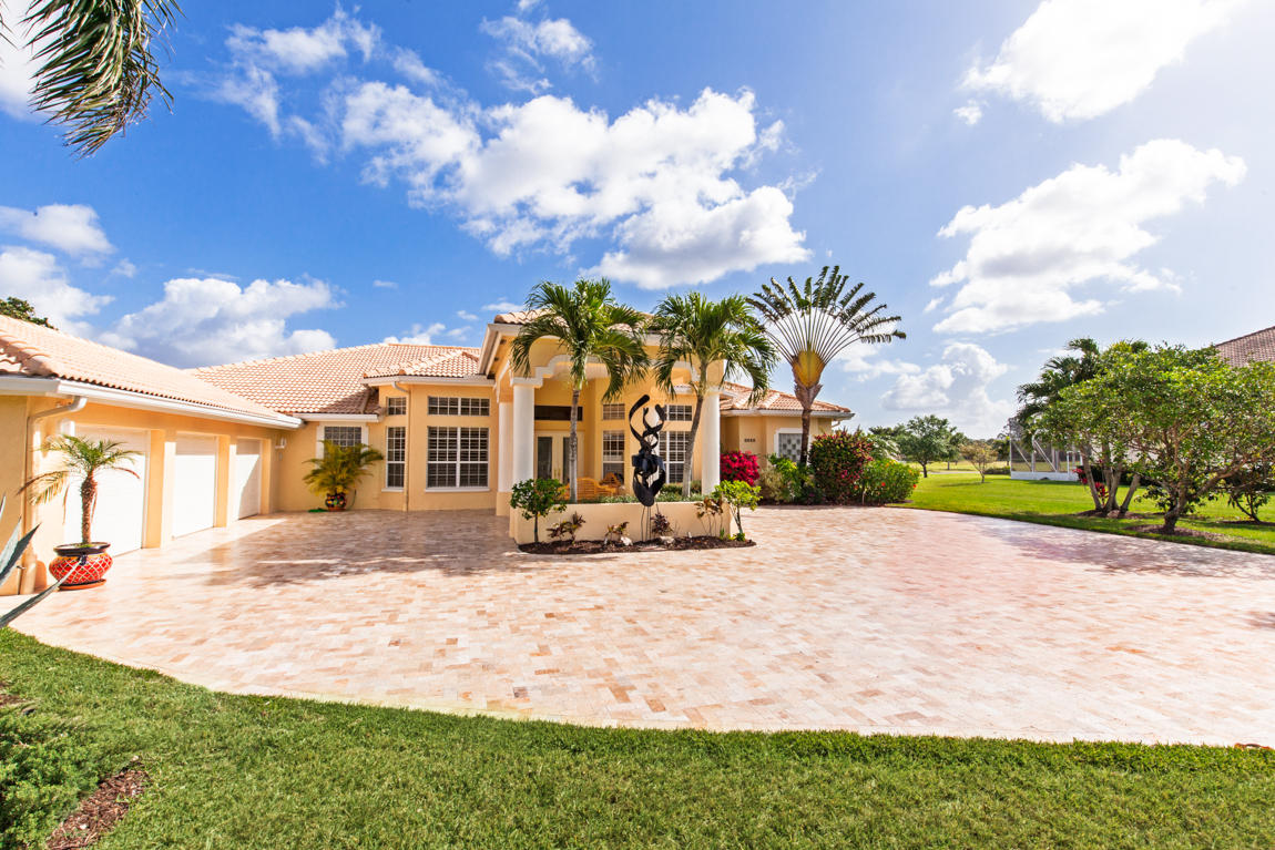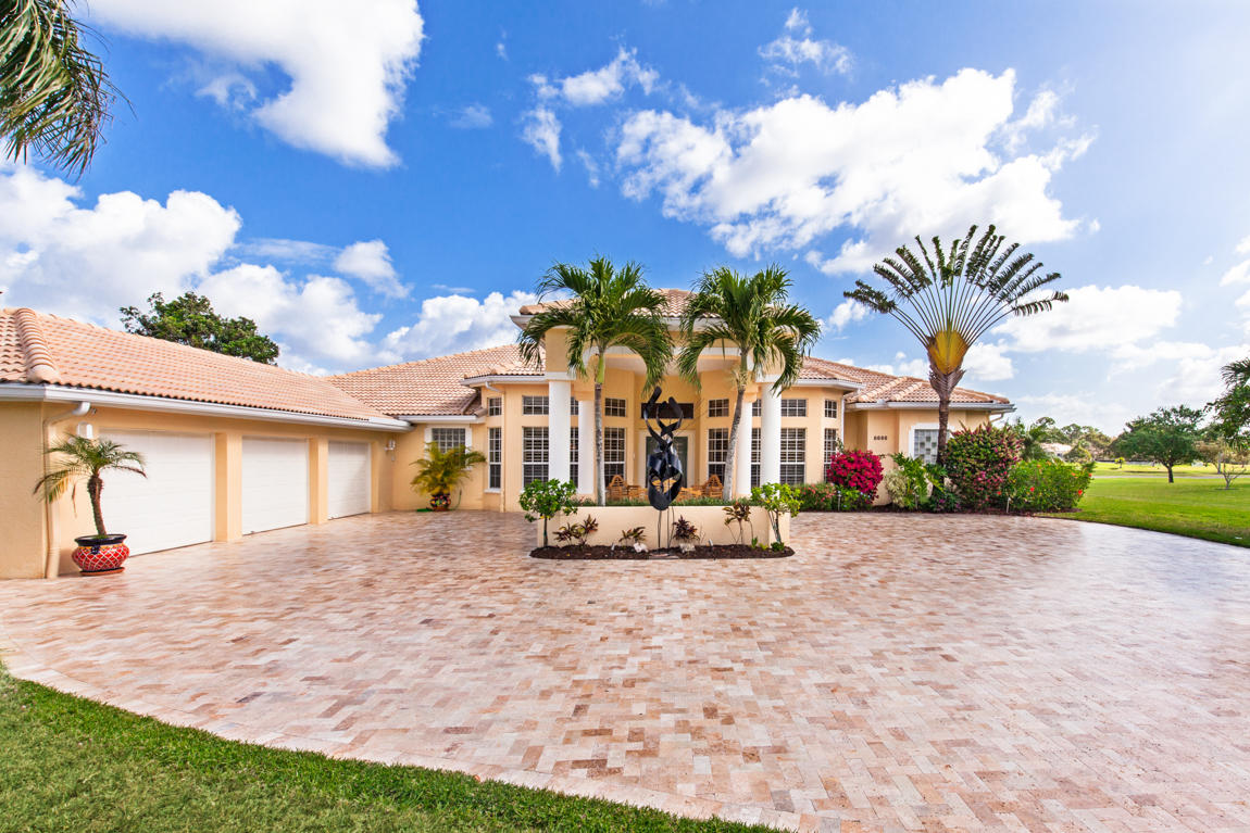 Beautiful home with panoramic golf & water views. This 3 BR home + office or 4 BR shows pride of ownership from driving up the long shimmering marble driveway to the recently remodeled kitchen. One of the newer homes in the Estate section. All Ac's & mechanicals have been replaced in the last 4 years. Remodeled laundry room, plantation shutters & garage cabinetry as well as a tiled garage floor. All new marble decking around the pool & patio. Dozens of LED hi hat lights. MacKenzie child kitchen light & bathroom & kitchen cabinet hardware. Stately entrance featuring a Porte cochere. 1 acre lot featuring majestic palms as well as Mango, banana, citrus & avocado