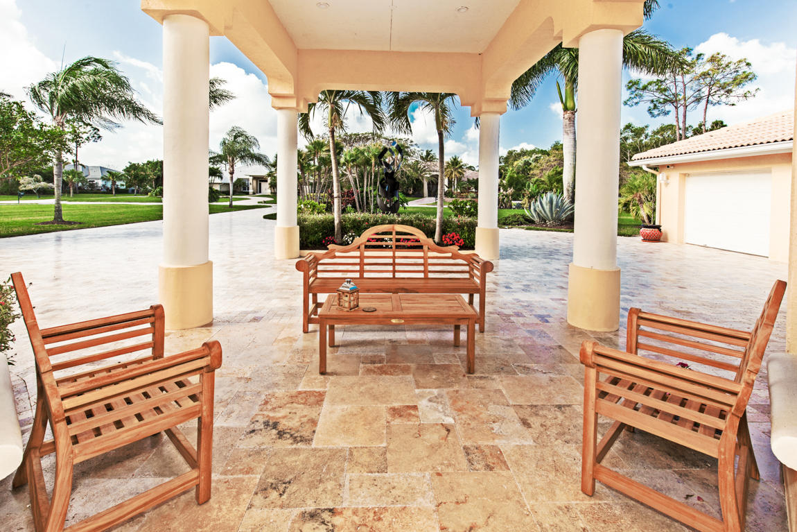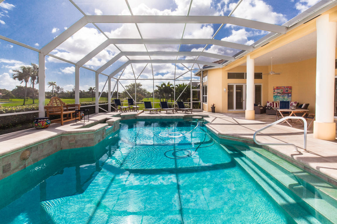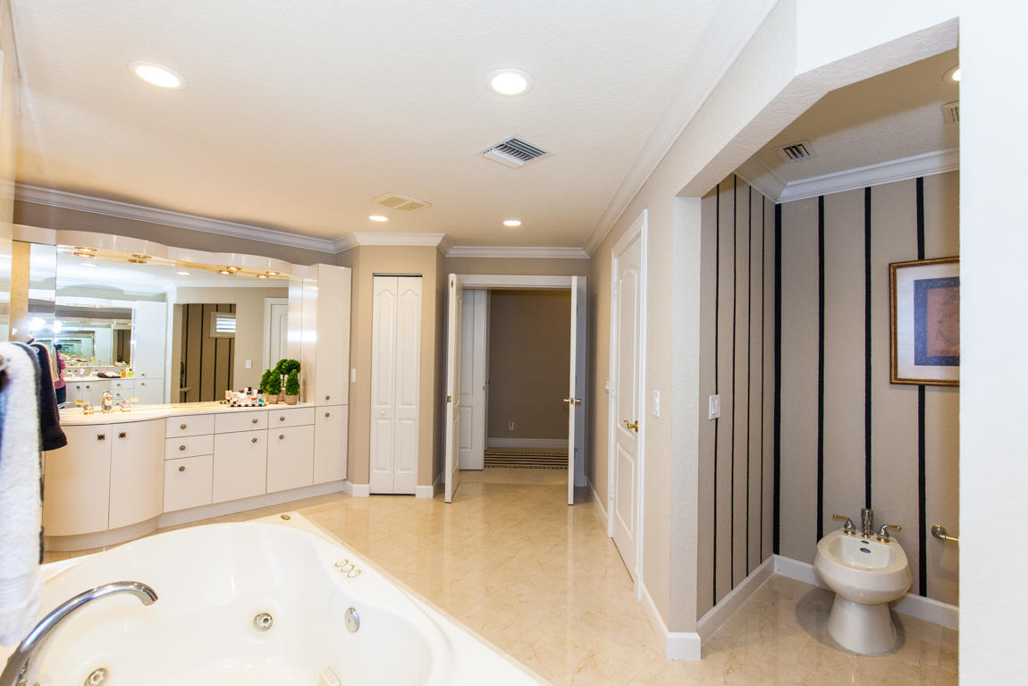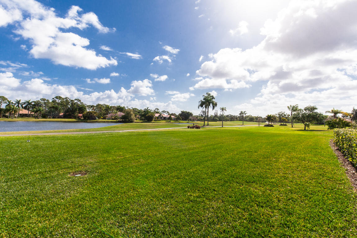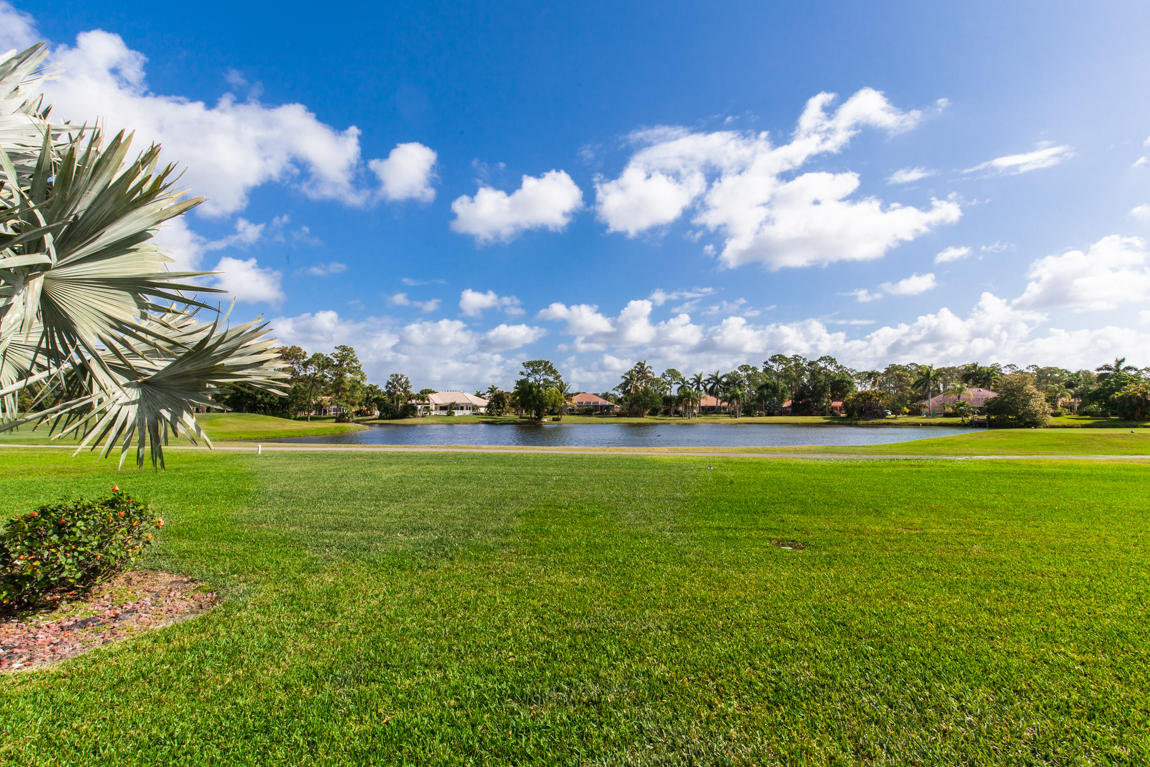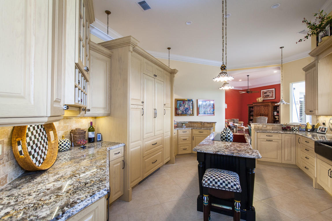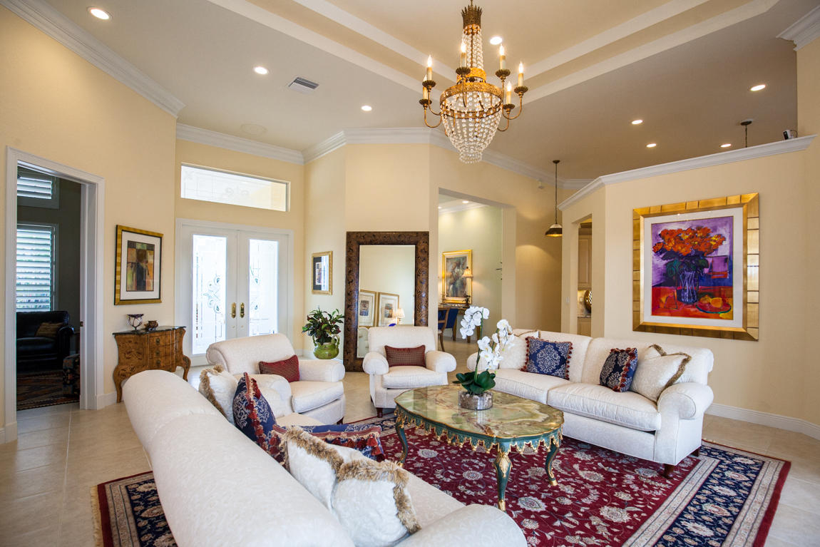 Beautiful home with panoramic golf & water views. This 3 BR home + office or 4 BR shows pride of ownership from driving up the long shimmering marble driveway to the recently remodeled kitchen. One of the newer homes in the Estate section. All Ac's & mechanicals have been replaced in the last 4 years. Remodeled laundry room, plantation shutters & garage cabinetry as well as a tiled garage floor. All new marble decking around the pool & patio. Dozens of LED hi hat lights. MacKenzie child kitchen light & bathroom & kitchen cabinet hardware. Stately entrance featuring a Porte cochere. 1 acre lot featuring majestic palms as well as Mango, banana, citrus & avocado
