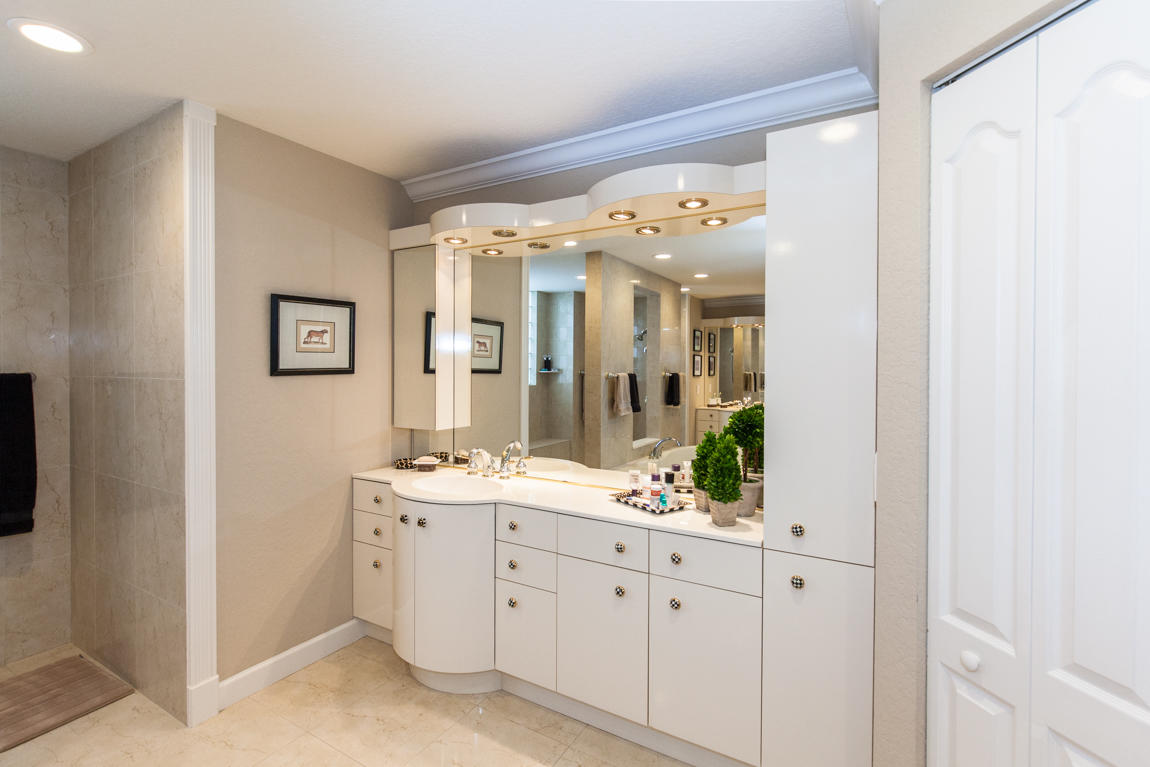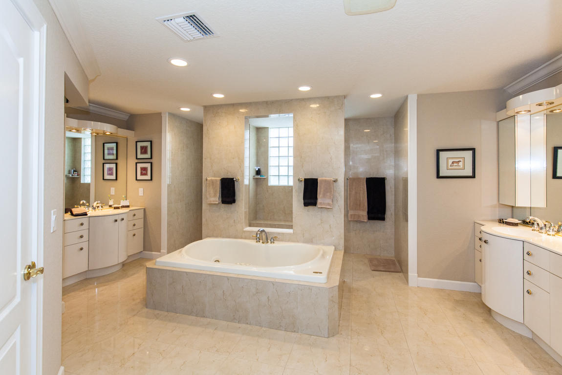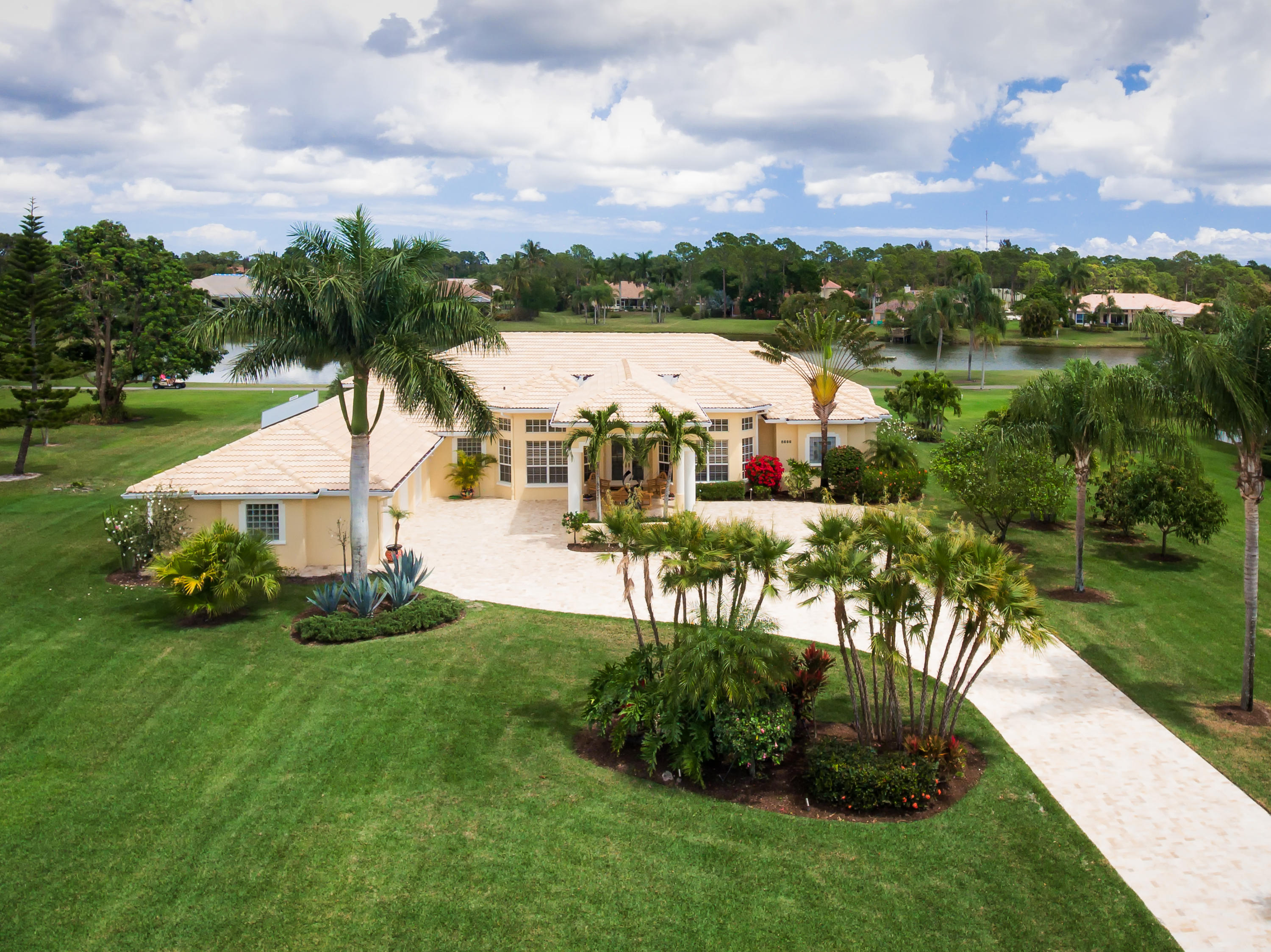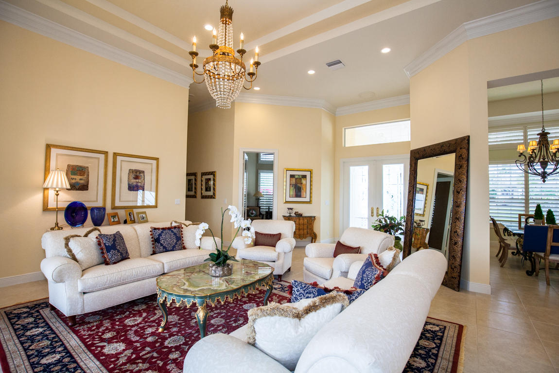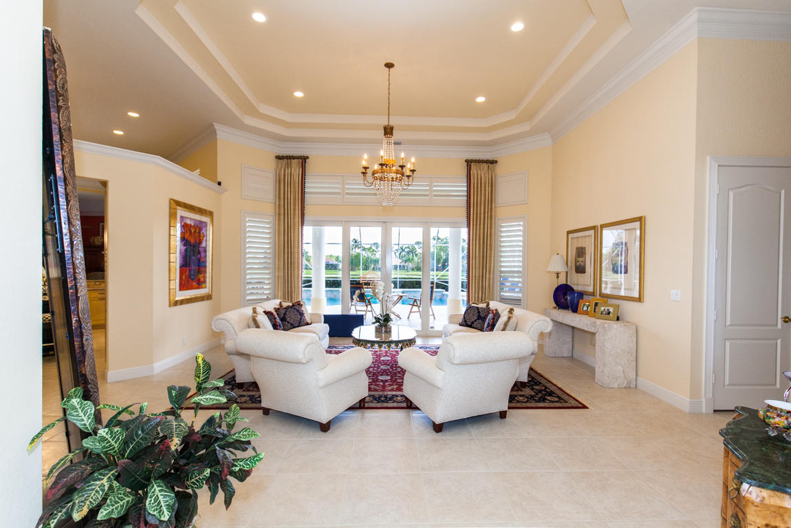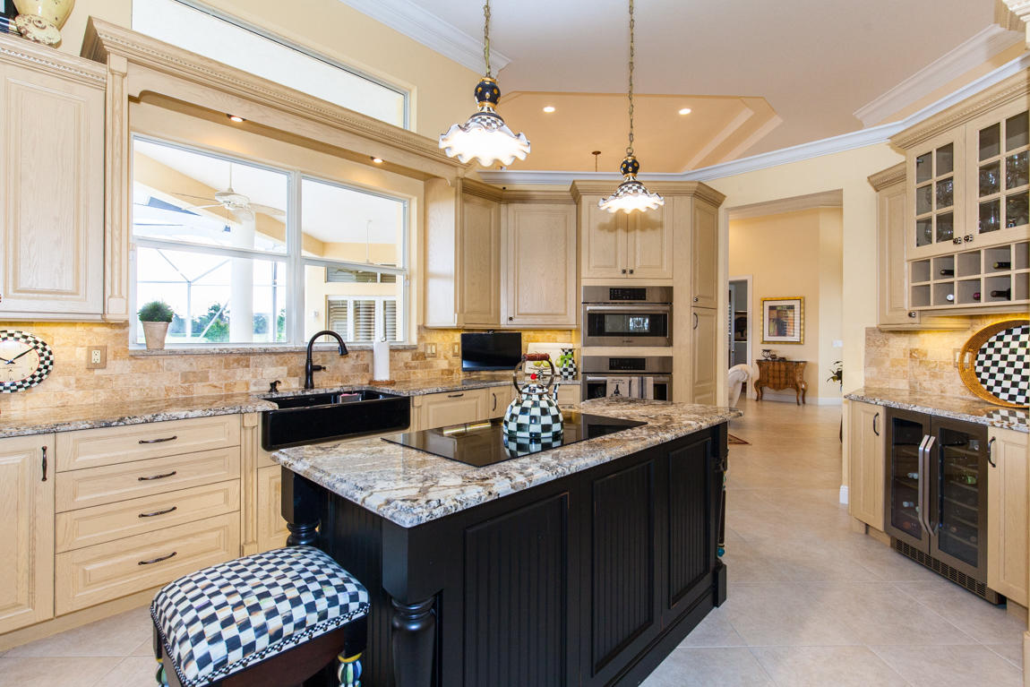 Beautiful home with panoramic golf & water views. This 3 BR home + office or 4 BR shows pride of ownership from driving up the long shimmering marble driveway to the recently remodeled kitchen. One of the newer homes in the Estate section. All Ac's & mechanicals have been replaced in the last 4 years. Remodeled laundry room, plantation shutters & garage cabinetry as well as a tiled garage floor. All new marble decking around the pool & patio. Dozens of LED hi hat lights. MacKenzie child kitchen light & bathroom & kitchen cabinet hardware. Stately entrance featuring a Porte cochere. 1 acre lot featuring majestic palms as well as Mango, banana, citrus & avocado