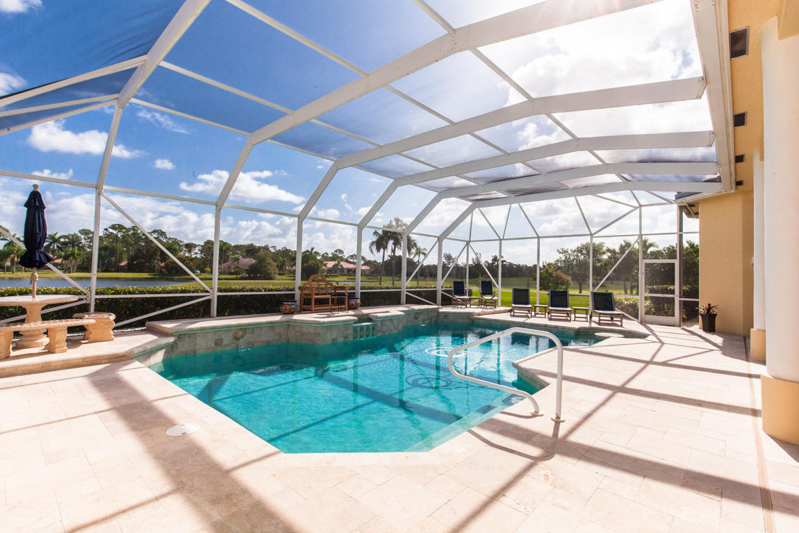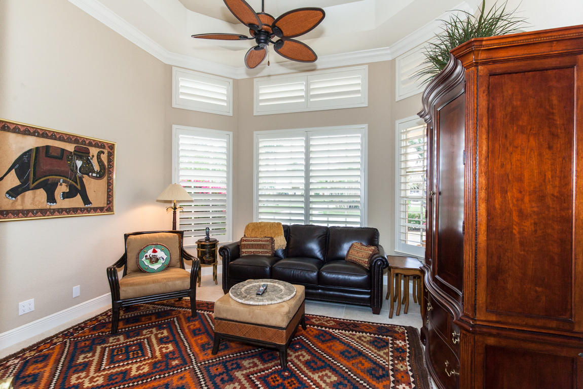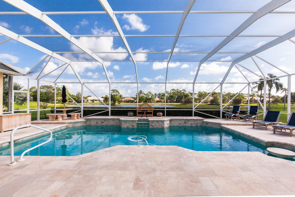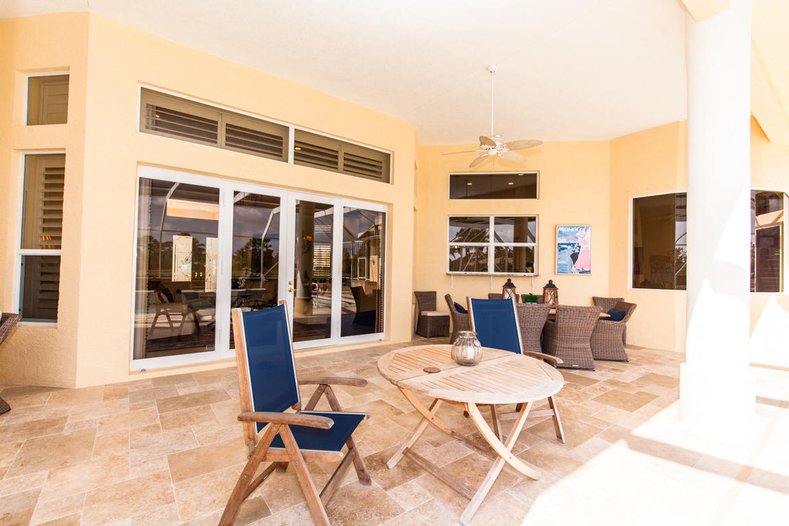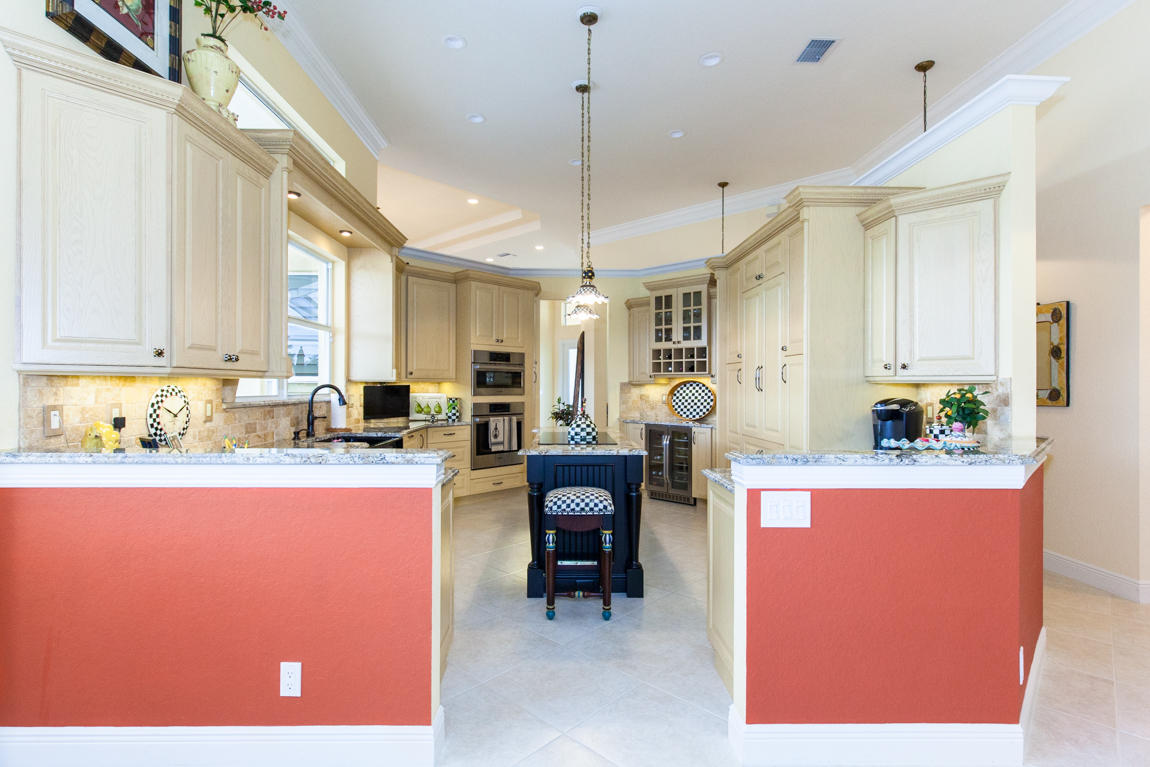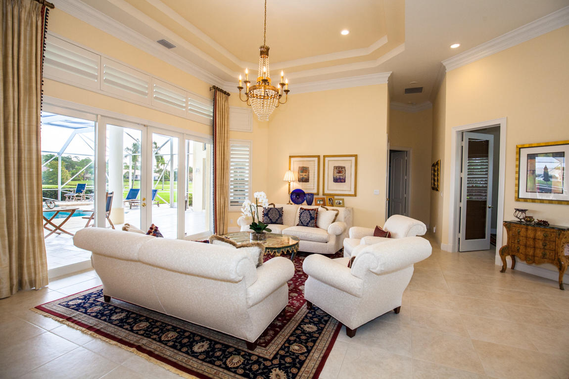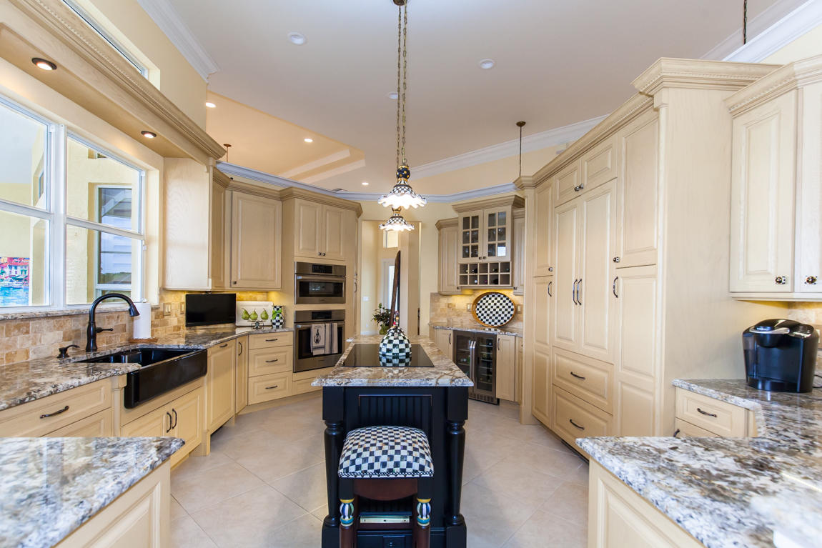 Beautiful home with panoramic golf & water views. This 3 BR home + office or 4 BR shows pride of ownership from driving up the long shimmering marble driveway to the recently remodeled kitchen. One of the newer homes in the Estate section. All Ac's & mechanicals have been replaced in the last 4 years. Remodeled laundry room, plantation shutters & garage cabinetry as well as a tiled garage floor. All new marble decking around the pool & patio. Dozens of LED hi hat lights. MacKenzie child kitchen light & bathroom & kitchen cabinet hardware. Stately entrance featuring a Porte cochere. 1 acre lot featuring majestic palms as well as Mango, banana, citrus & avocado