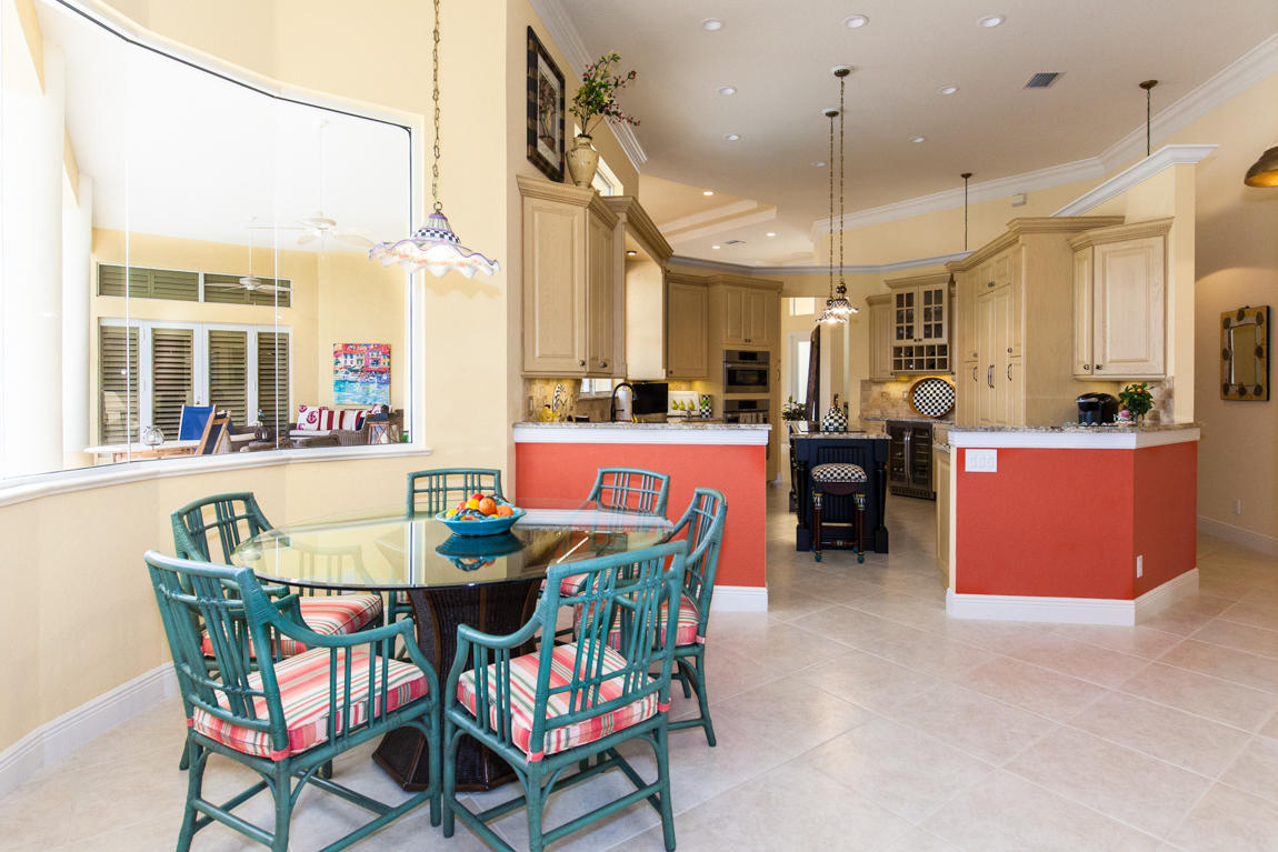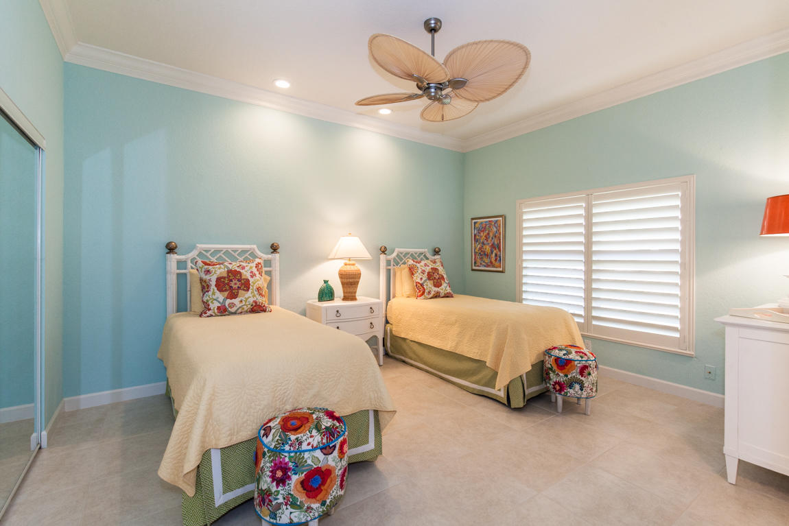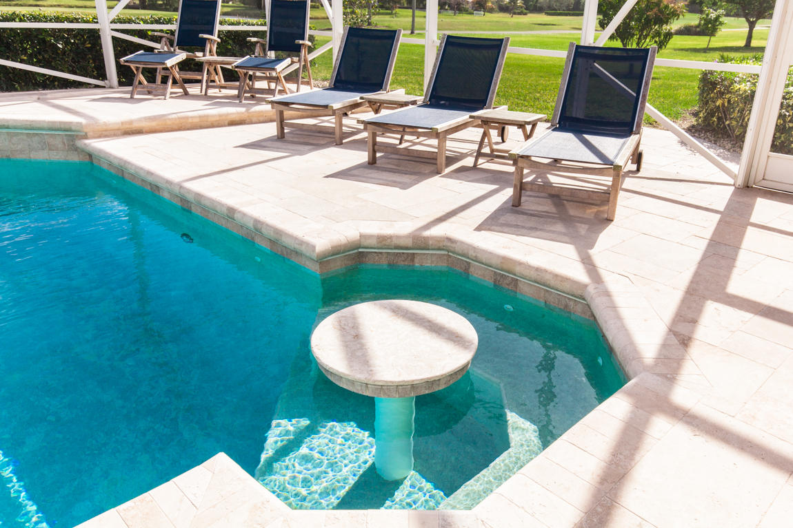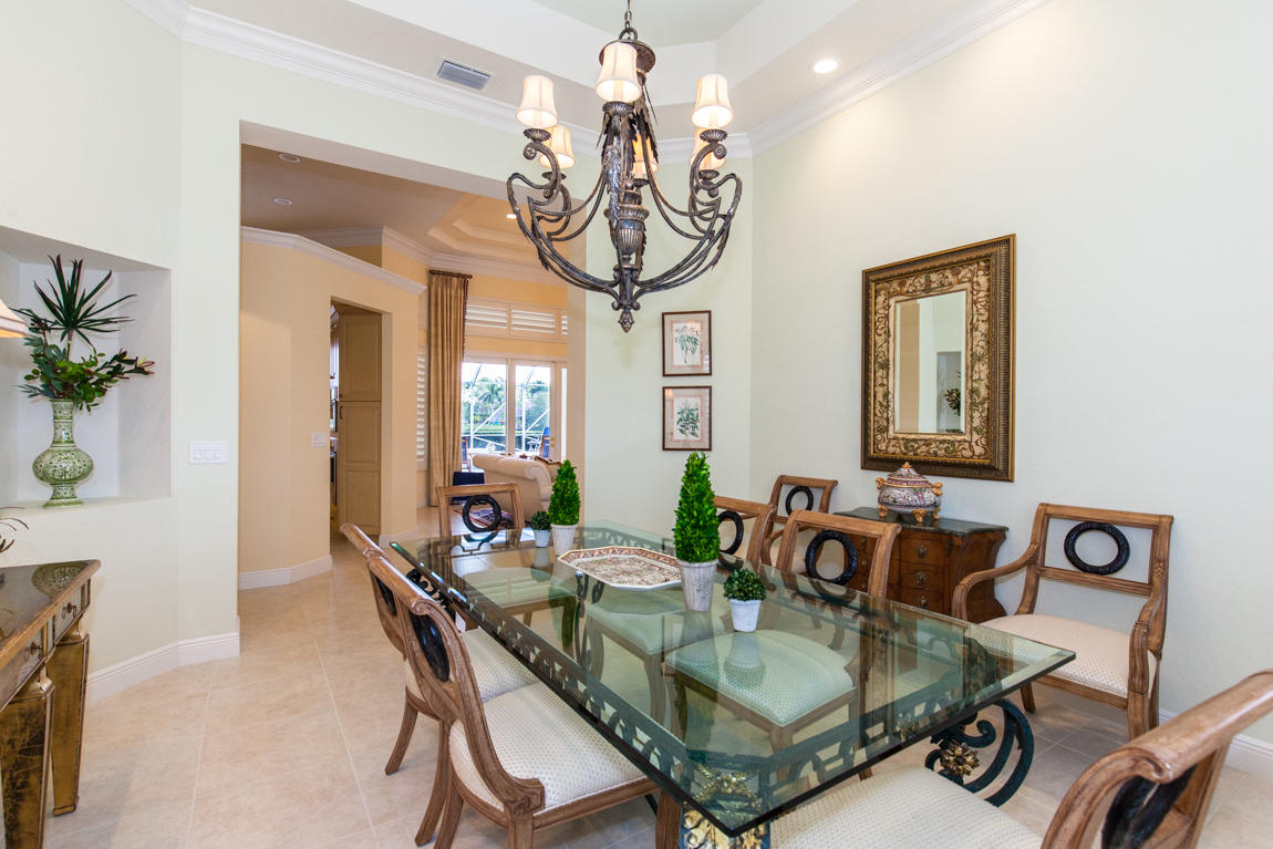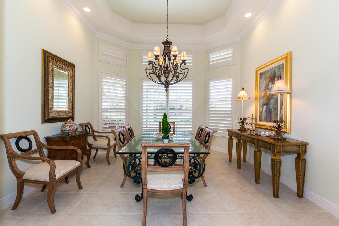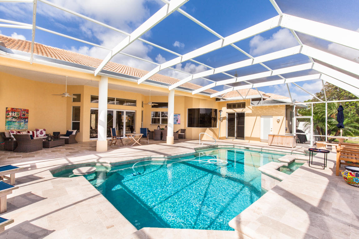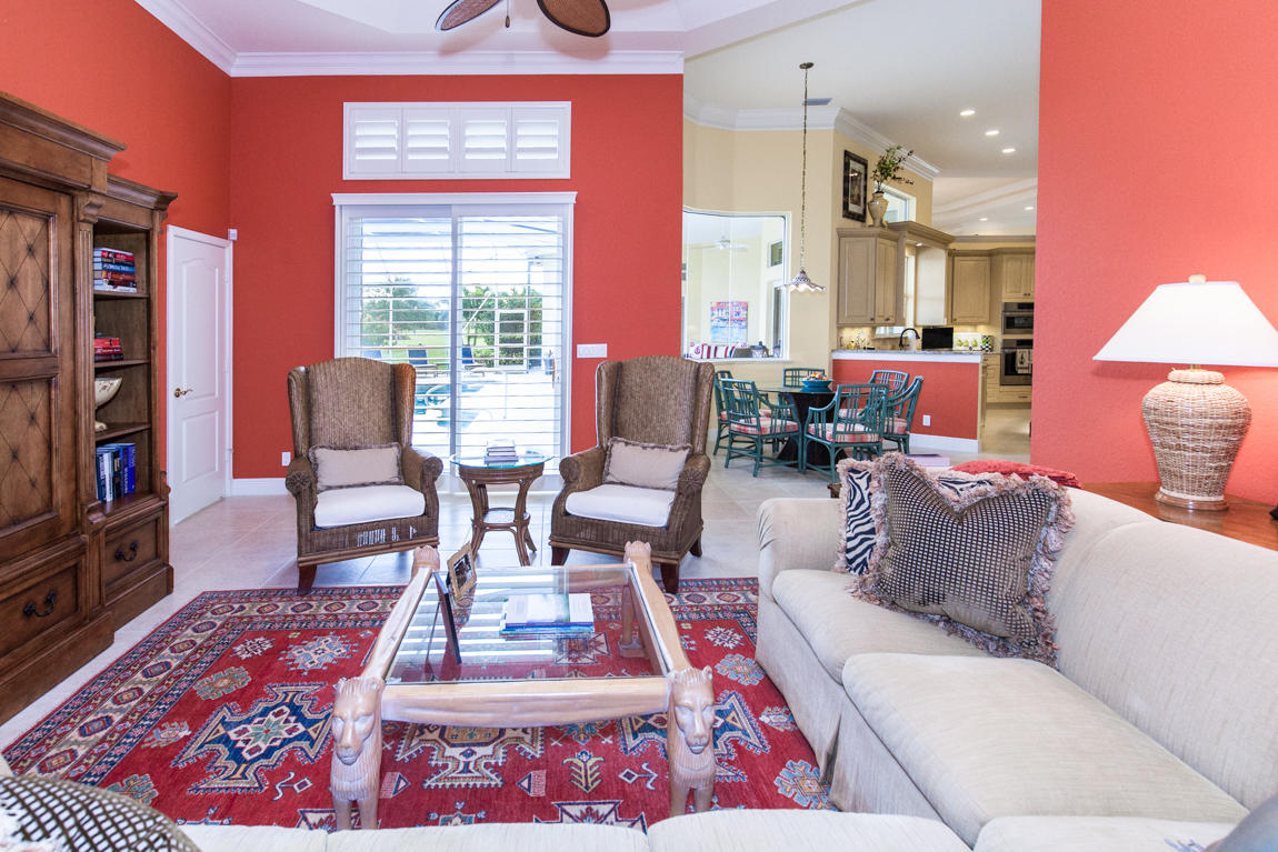 Beautiful home with panoramic golf & water views. This 3 BR home + office or 4 BR shows pride of ownership from driving up the long shimmering marble driveway to the recently remodeled kitchen. One of the newer homes in the Estate section. All Ac's & mechanicals have been replaced in the last 4 years. Remodeled laundry room, plantation shutters & garage cabinetry as well as a tiled garage floor. All new marble decking around the pool & patio. Dozens of LED hi hat lights. MacKenzie child kitchen light & bathroom & kitchen cabinet hardware. Stately entrance featuring a Porte cochere. 1 acre lot featuring majestic palms as well as Mango, banana, citrus & avocado