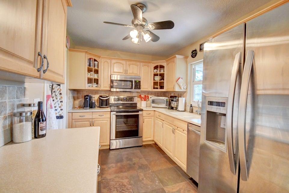 Beautifully remodeled and sparkling clean home with circular driveway and garage, surrounded by a massive fenced yard. Plenty of room for RV or boat parking and a pool. New Impact Windows! New A/C! No popcorn! Super low HOA! Stylish slate floors, except for the bedrooms (carpet) and master bath (tile). The kitchen has stainless LG appliances about 1 year old, real wood cabinets and corian counter tops. Fans in all bedrooms and kitchen, designer fixtures elsewhere. Large utility room for washer/dryer and storage. French Doors leading to a huge covered patio that is fully tiled. Tons of upgrades that come together to make a warm comfy home. ''A'' rated Boca Schools! Surrounded by tons of retail and restaurants. Walking distance to Chabad.