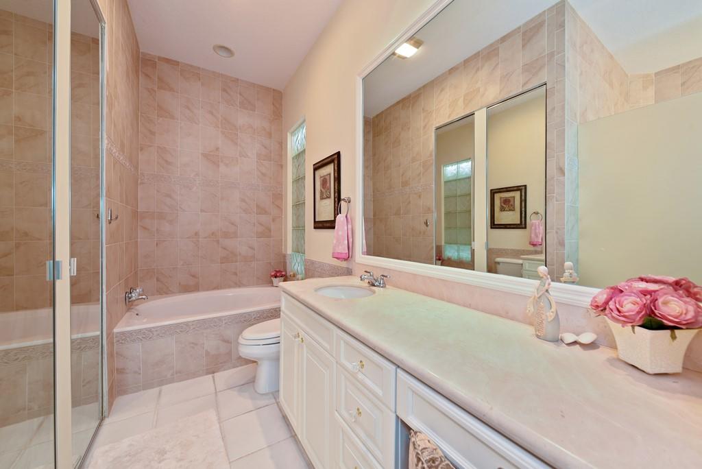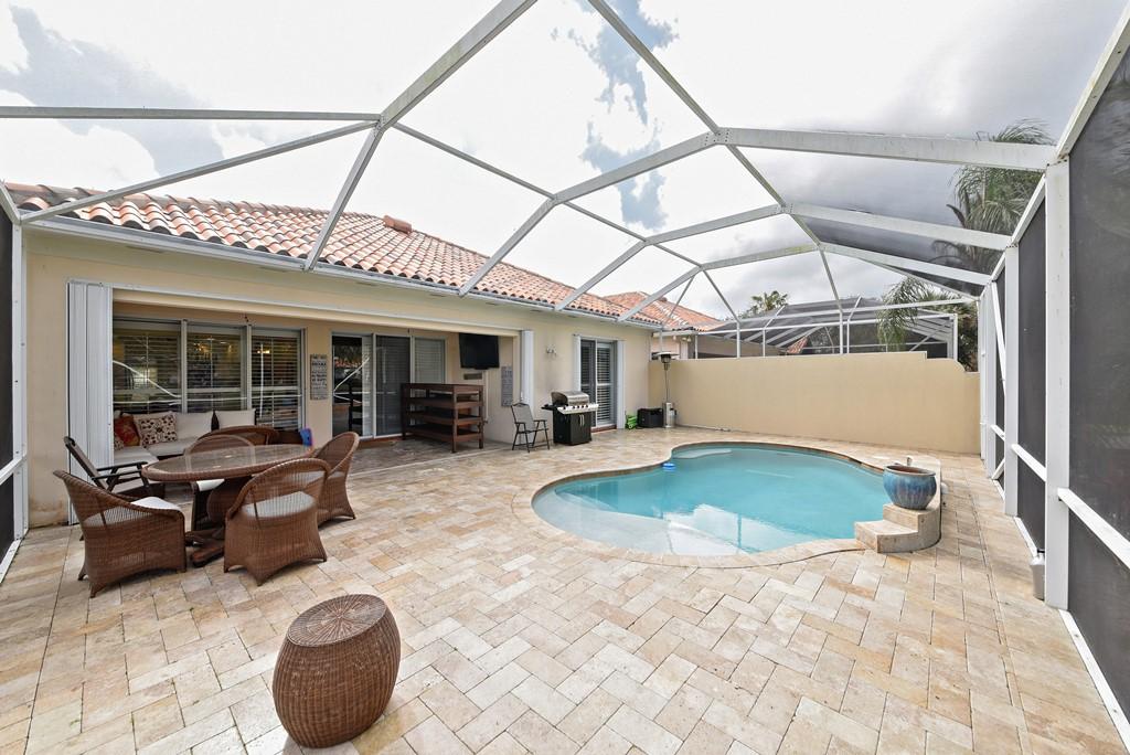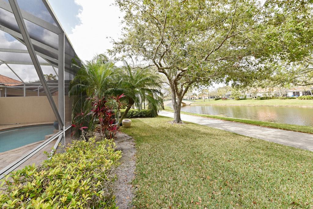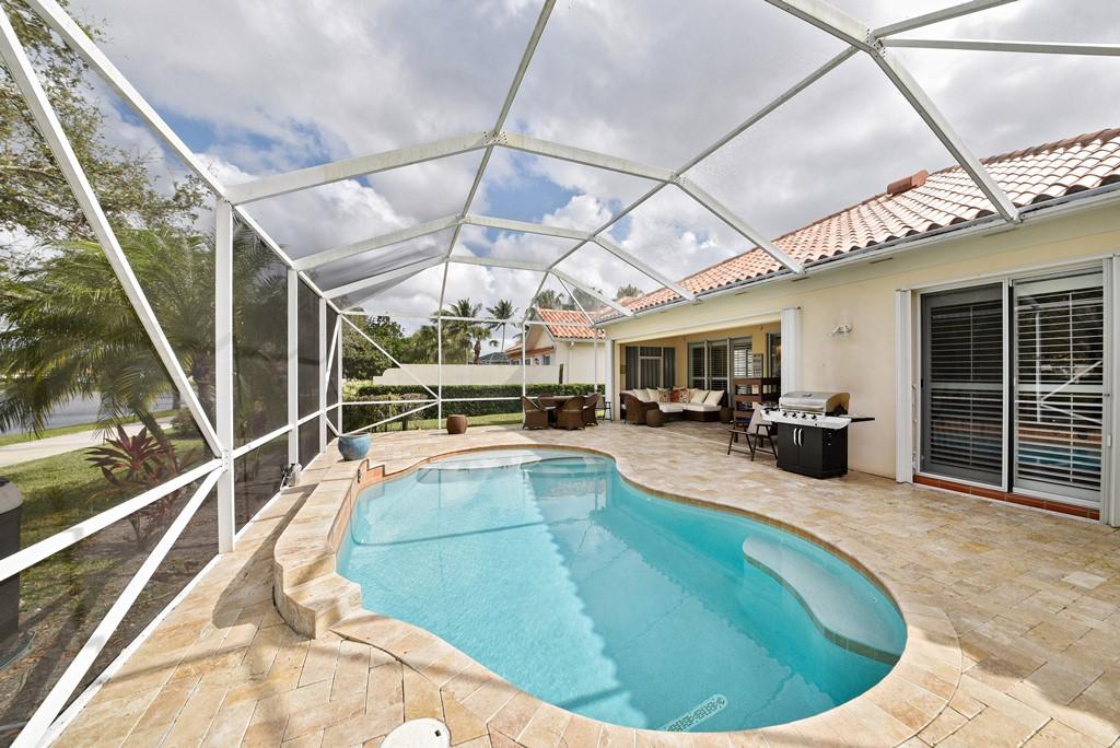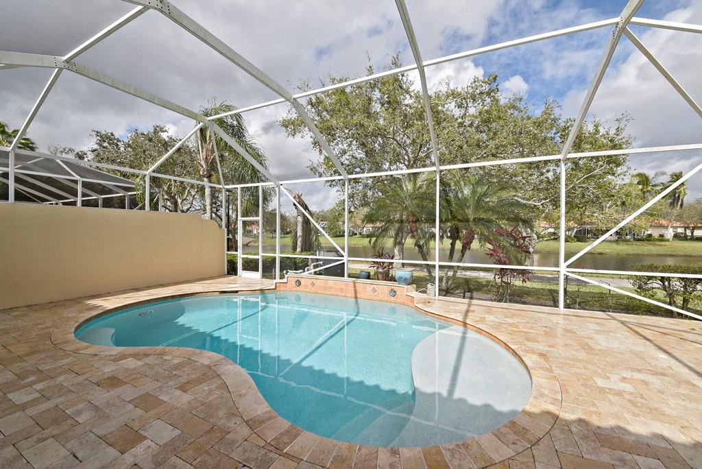 This stunning OAKMONT has it all & is set on a Gorgeous Oversized Cul de Sac Lakeside Lot with beautiful Lake Views & a Custom Caged Heated Pool! In RiverWalk, a 24 Hour Manned Gated Community that is 15-20 Minutes from Everything that makes Palm Beach County a Great Place to Live including the Ocean! The Screened Entry Leads to the Tile Foyer and Great Room with a Soaring 12 Ft. Ceiling, a Magnificent Dual Designer Fan, Plantation Shutters & the Dining Area with elegant wood Flooring! 18 Feet of Sliding Glass Doors Lead to the 22 Ft. Lanai that has Travertine Flooring which continues on to the Sun Deck Surrounding the Custom Heated Pool with a Raised area with Water Fountains Plus that Scenic Views of Green Space, Bridges & Azure Blue Lake Waters! There is a Secluded Patio off of