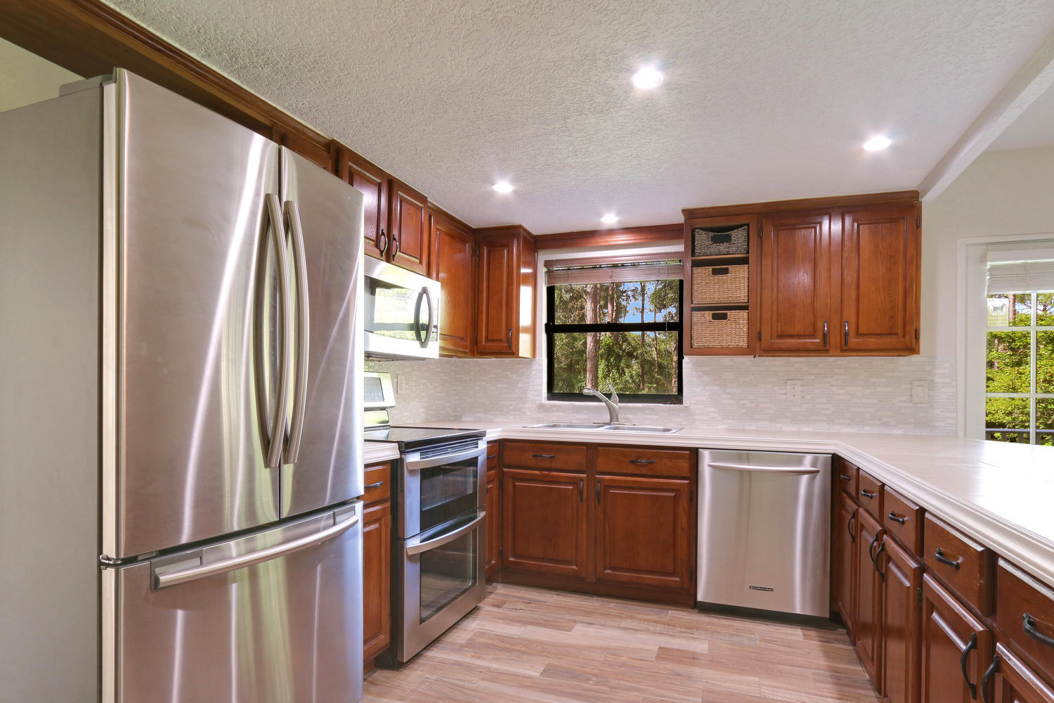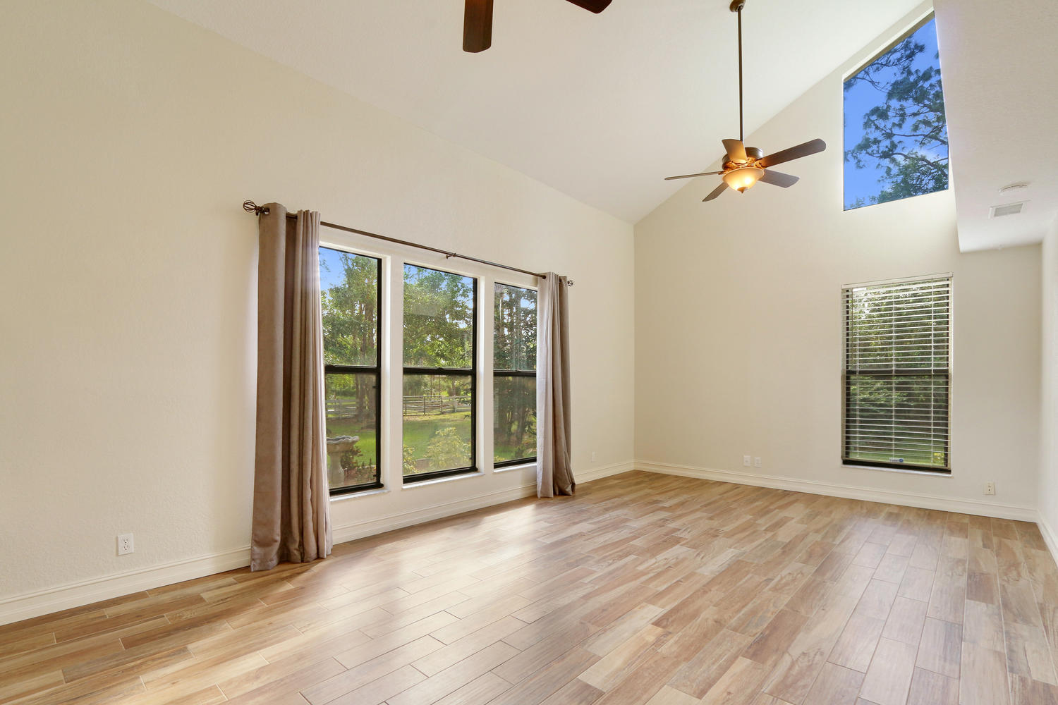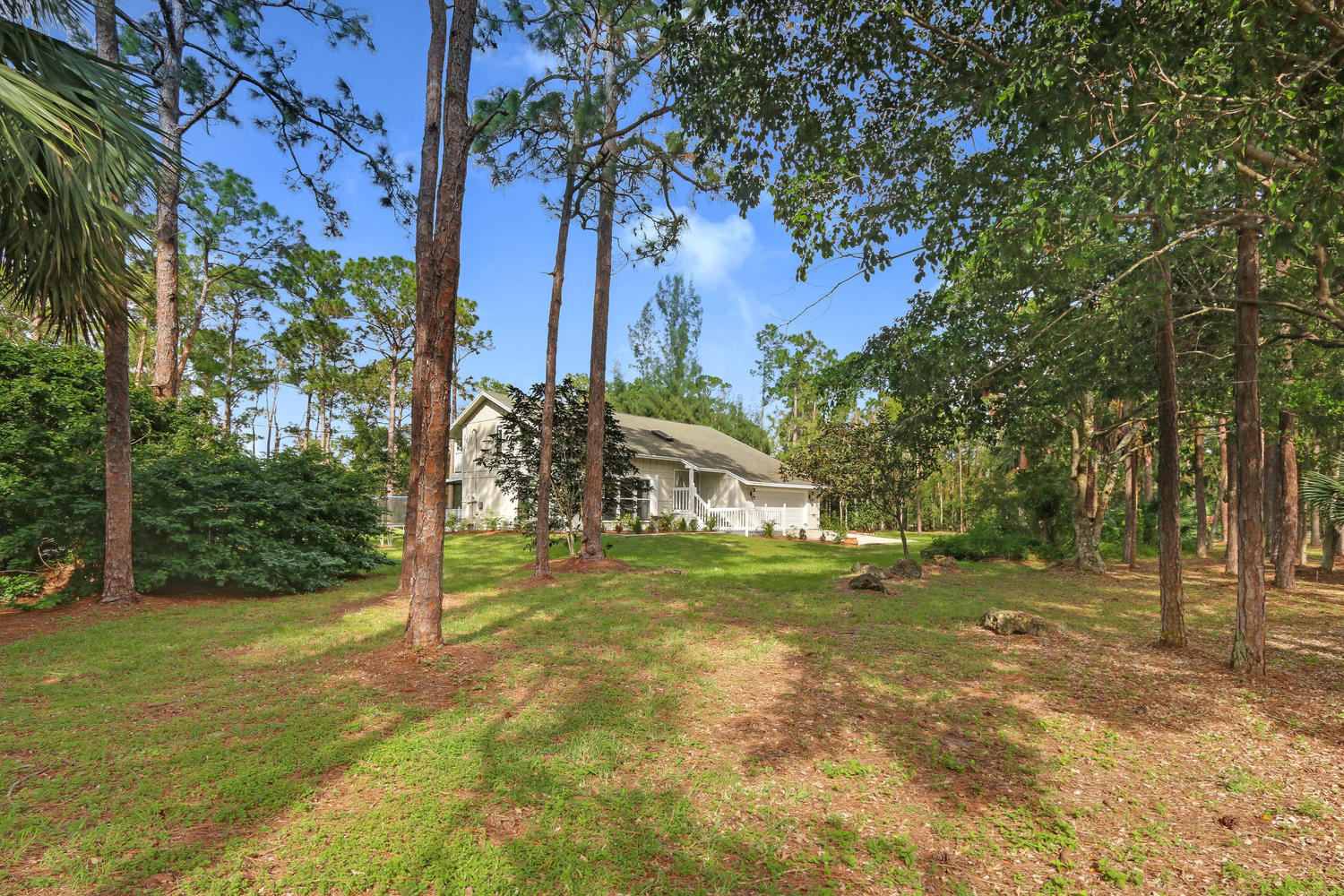Situated on a quiet and oversized corner lot in the Acreage this home as everything that you could wish for! Beautiful upgrades throughout, a large outdoor deck and fire pit for relaxing or entertaining, a private pond and lots of class! Upon entering this home through the decorative French doors, you immediately notice the grand living space with large windows, beautiful flooring and vaulted ceilings. There is a secondary bedroom and full bathroom on the main floor of the home along with a stunningly updated kitchen, formal dining room, large laundry/utility room (with large built in storage cabinets) and family room. There is wood tile throughout the entire home and all 3 bathrooms have been upgraded. Upstairs you will find the master bedroom, and 2 more secondary bedrooms along with