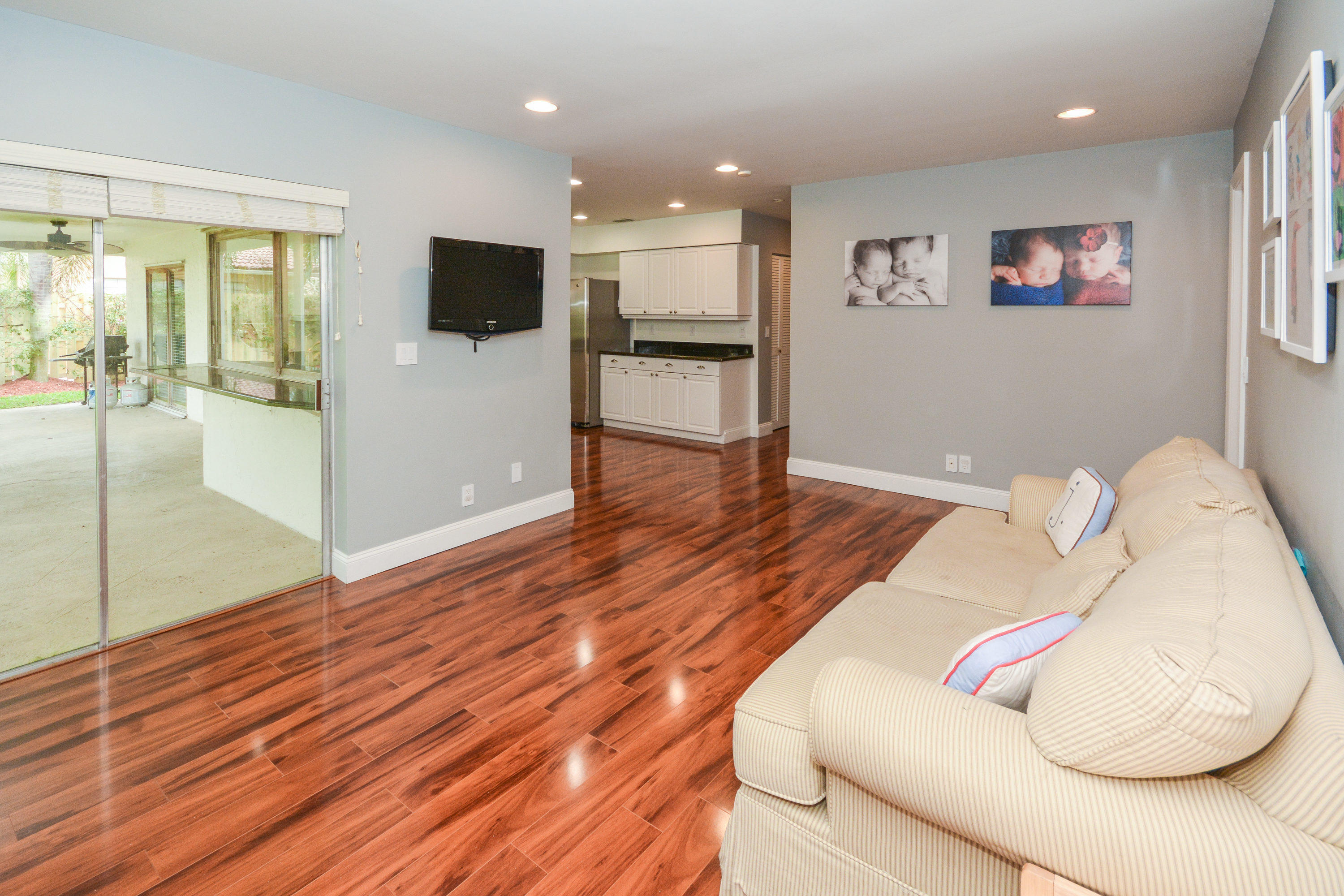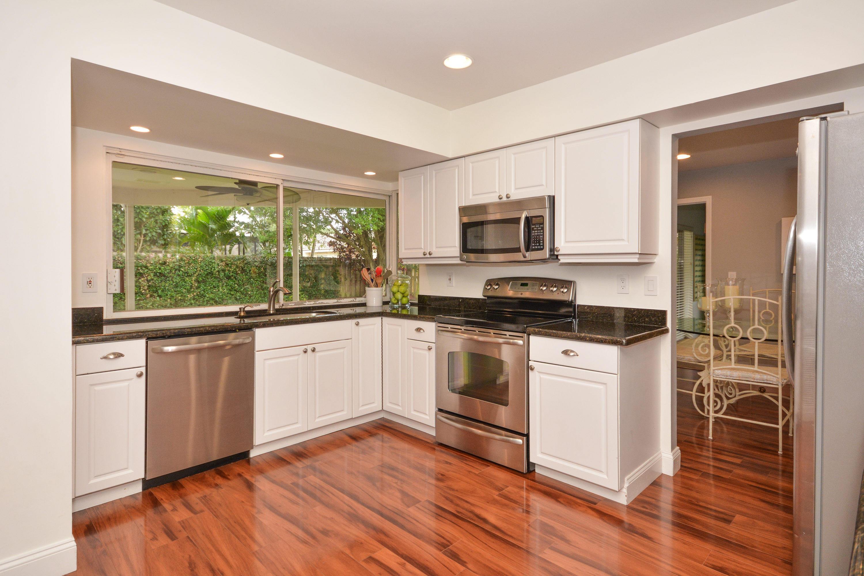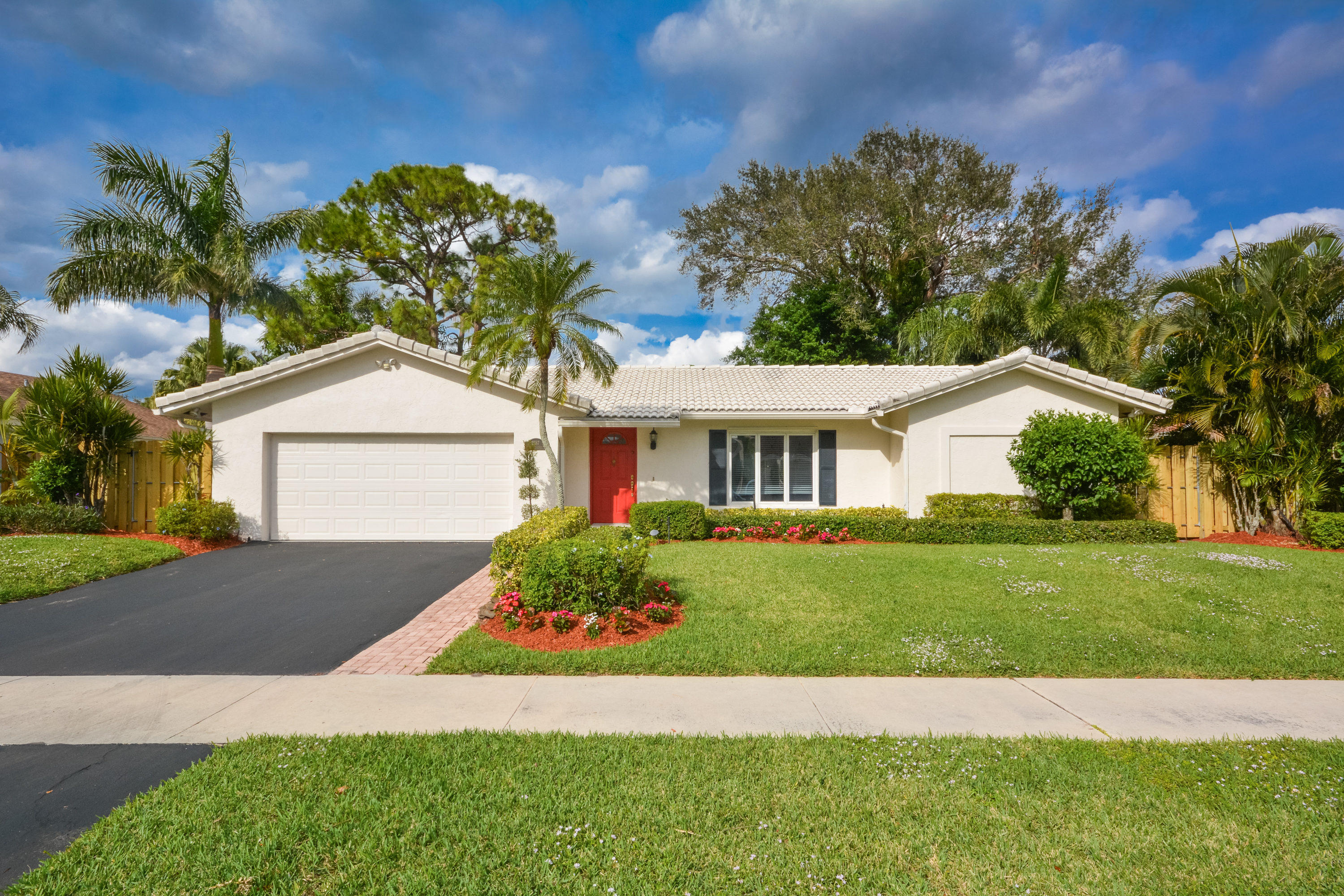 Beautifully updated home with very large fenced yard in Timbercreek. Move right in!! Light, bright, very open floor plan. 3 bedrooms (split plan) and 2 baths. Gorgeous wood floors throughout, all new recessed lighting, white kitchen with granite and stainless steel appliances opens to family room. Freshly painted in 2016, fitted closets, brand new fence, new landscaping, panel shutters, well maintained roof and 2-car garage. Great central Boca location, excellent schools, community park with playground and basketball.