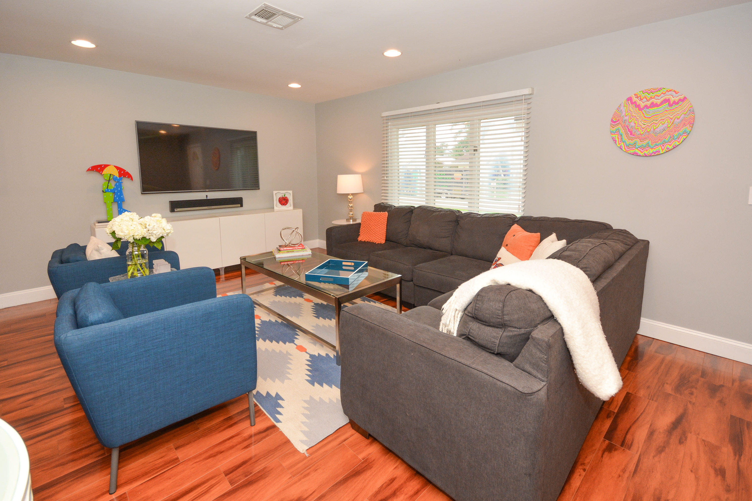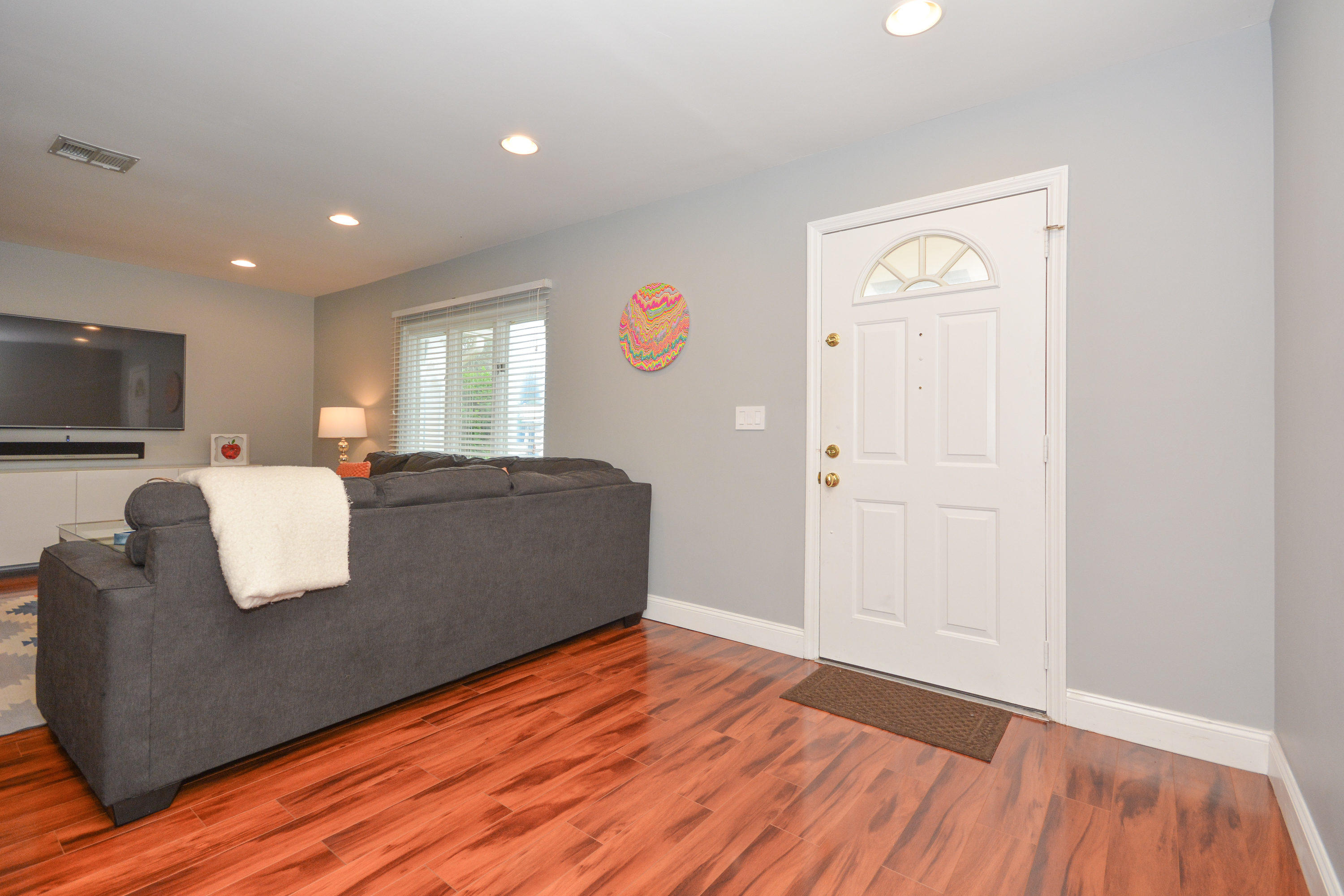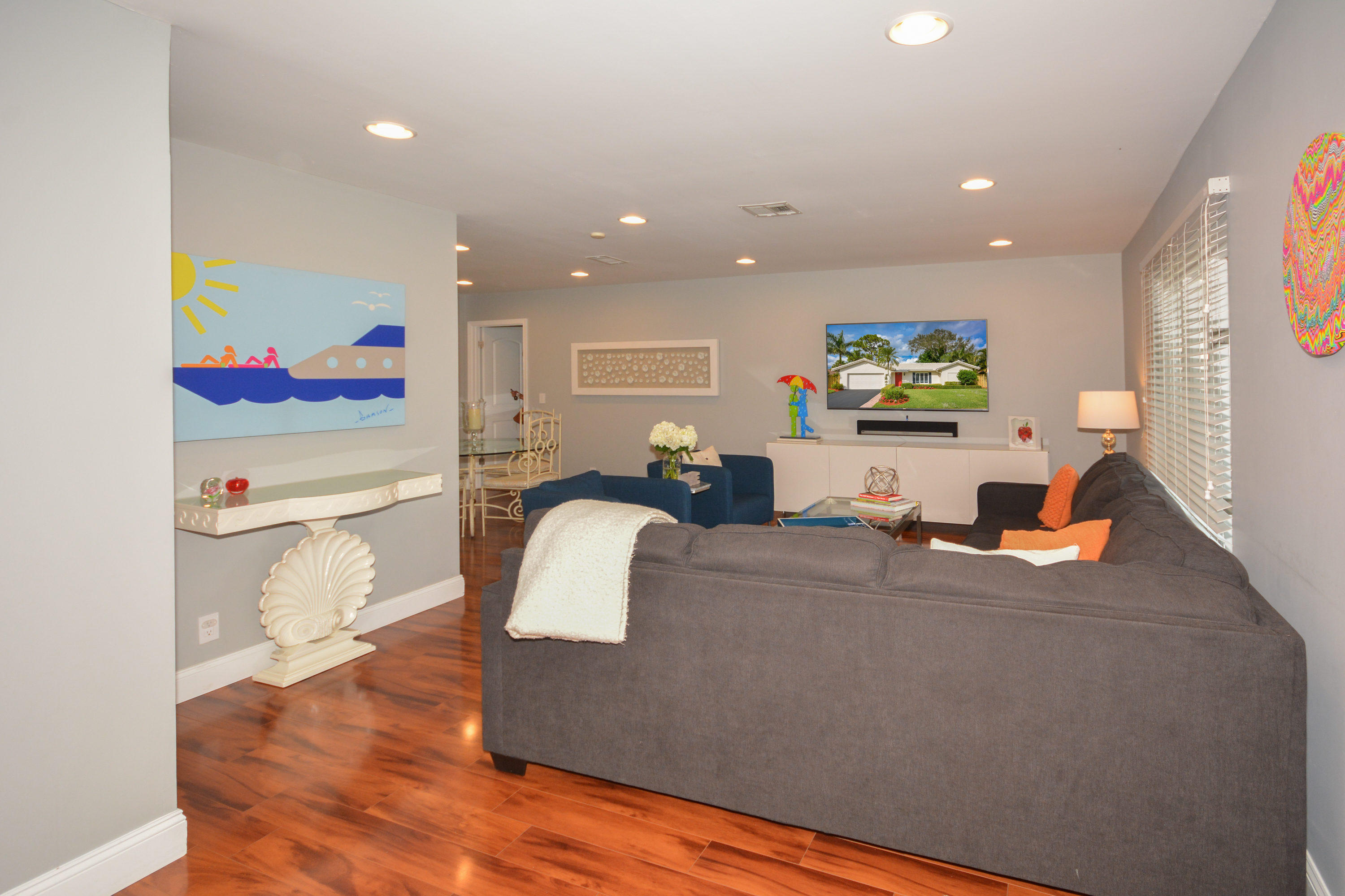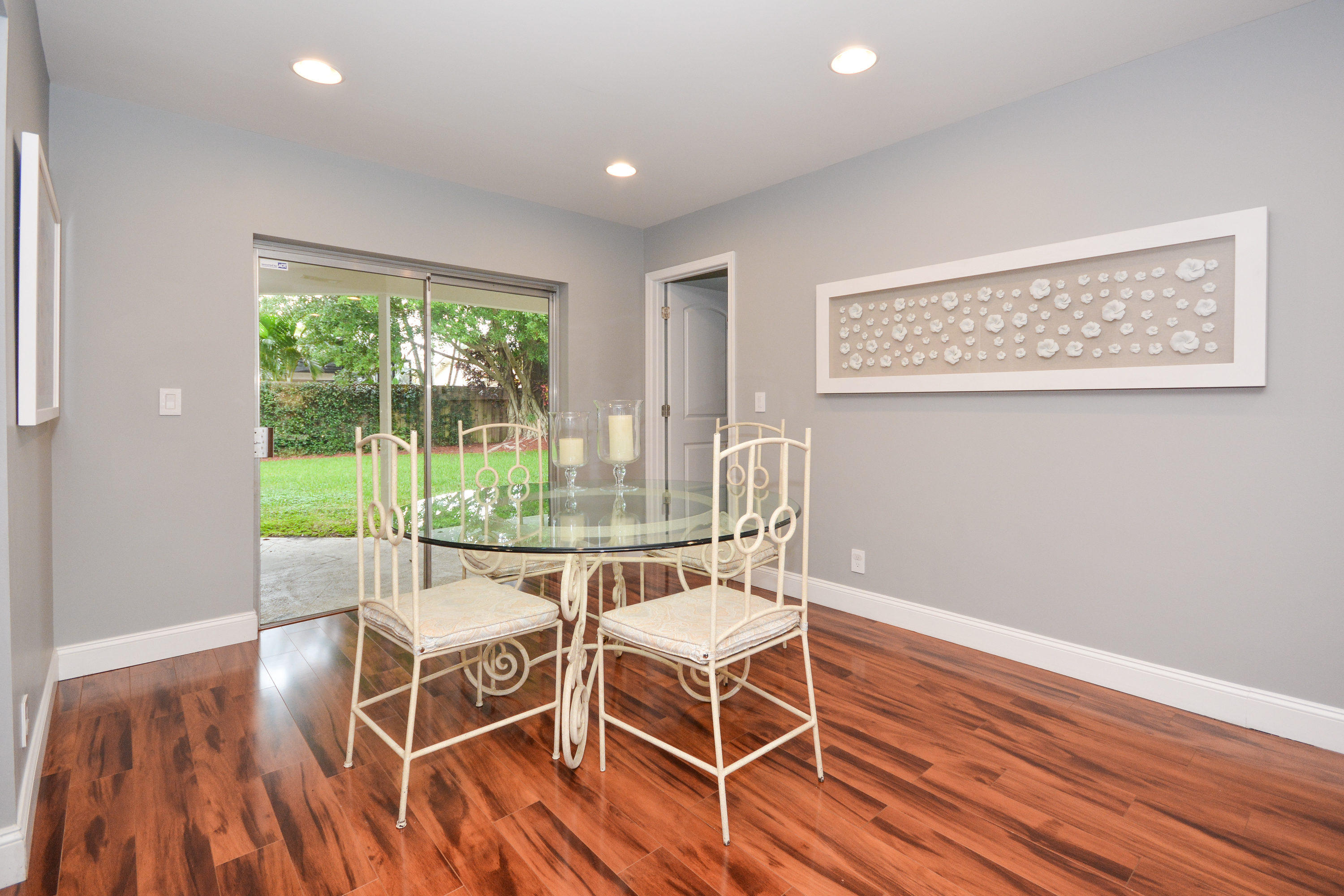 Beautifully updated home with very large fenced yard in Timbercreek. Move right in!! Light, bright, very open floor plan. 3 bedrooms (split plan) and 2 baths. Gorgeous wood floors throughout, all new recessed lighting, white kitchen with granite and stainless steel appliances opens to family room. Freshly painted in 2016, fitted closets, brand new fence, new landscaping, panel shutters, well maintained roof and 2-car garage. Great central Boca location, excellent schools, community park with playground and basketball.