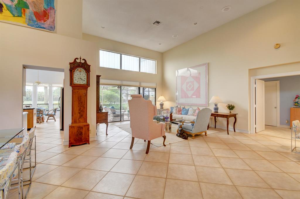Great cul-de-sac lot with screened in swimming pool, direct LAKE & GOLF VIEWS and has fenced in side yard perfect for children and pets. Roof (4 years old), A/C has two units (4 years and 1 year old), Culligan water softener, Flo Logic system has been installed to determine and shut off water if a leak occurs (great for seasonal owners or if you travel often). This lovely home has 3 bedrooms, 3 full baths + powder room, living and family room, wet bar, volume ceilings, 2 car garage with storage cabinets and accordion shutters. Kitchen is sleek consisting of modern style teak wood cabinets, black granite countertop, black appliances and a large bay window in breakfast area that lets in lots of light. Neutral tile laid on the diagonal throughout home and guest bedrooms. (MORE)