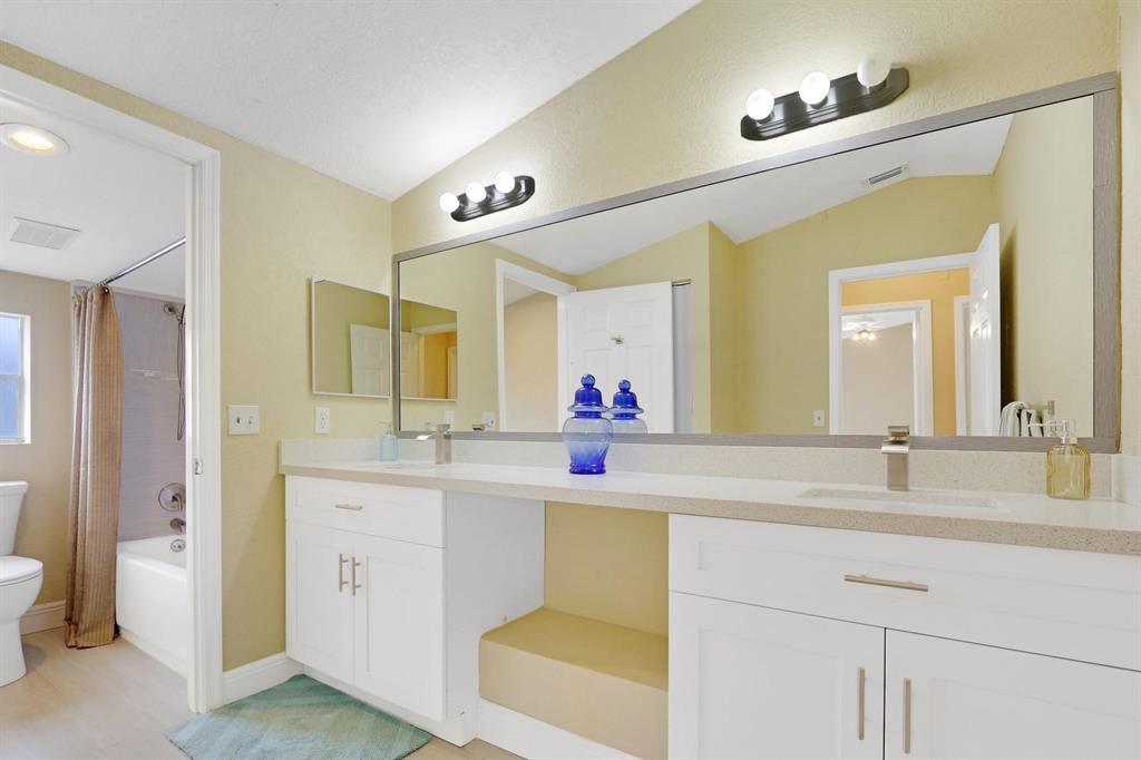 Impeccable remodeled home with all the touches you would expect like new kitchen with shaker style cabinets and quartz countertops and a stainless Steel appliance package to the new flooring wood laminate throughout the entire home save the kitchen and flyer areas which is stone look tile. The upgrades are do not end there as both main baths have been remodeled as well with a similar look to the kitchen cabinets and the master shower has a multi head shower system and the main guest bath offers a double sink and plenty of room for the kids to get ready for school. The home has also been freshly painted and new fixtures inside and out. This home is situated at the end of the street so not neighbor to the West side so you have an extra large lot with additional parking. Rear of home