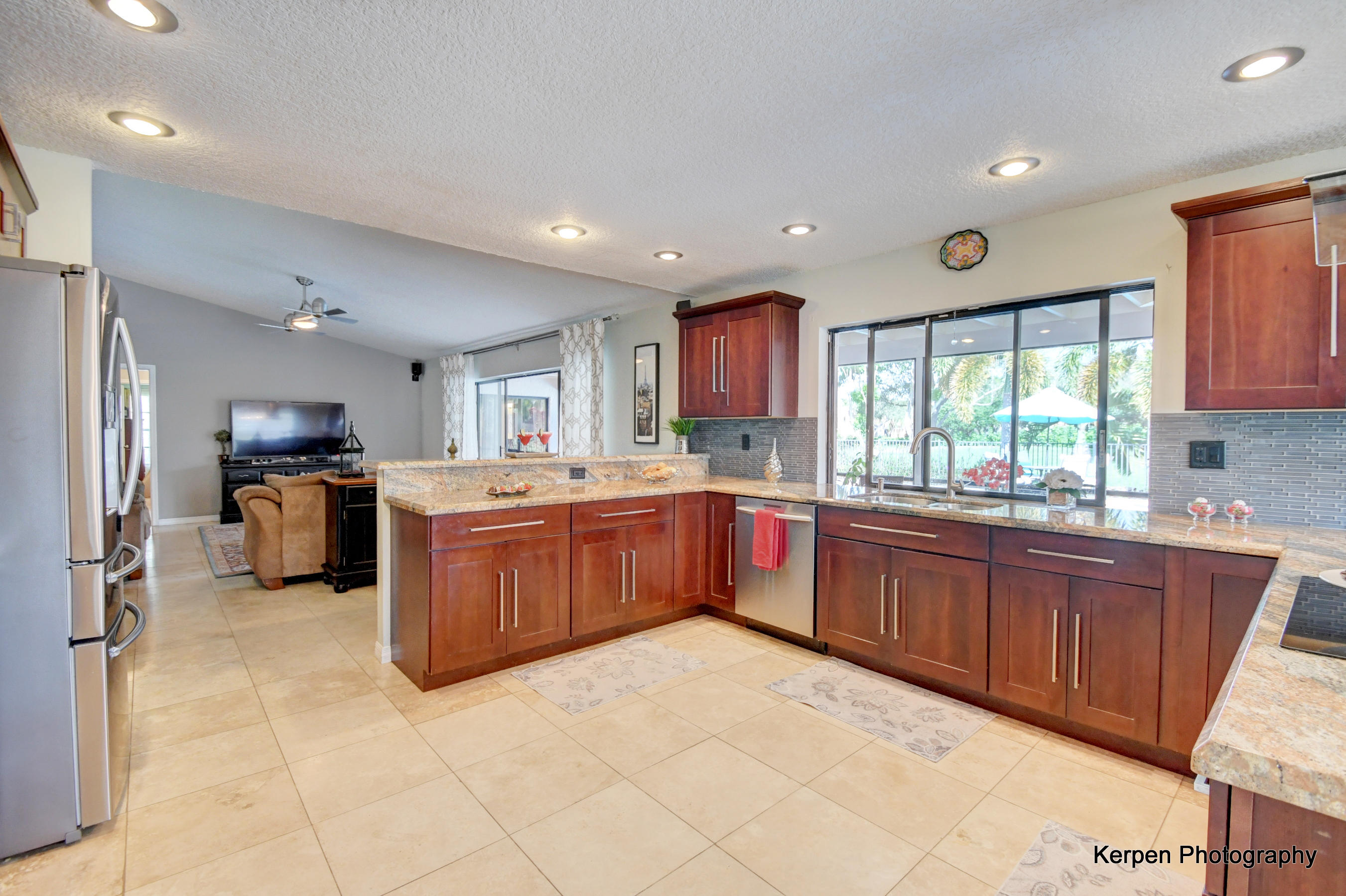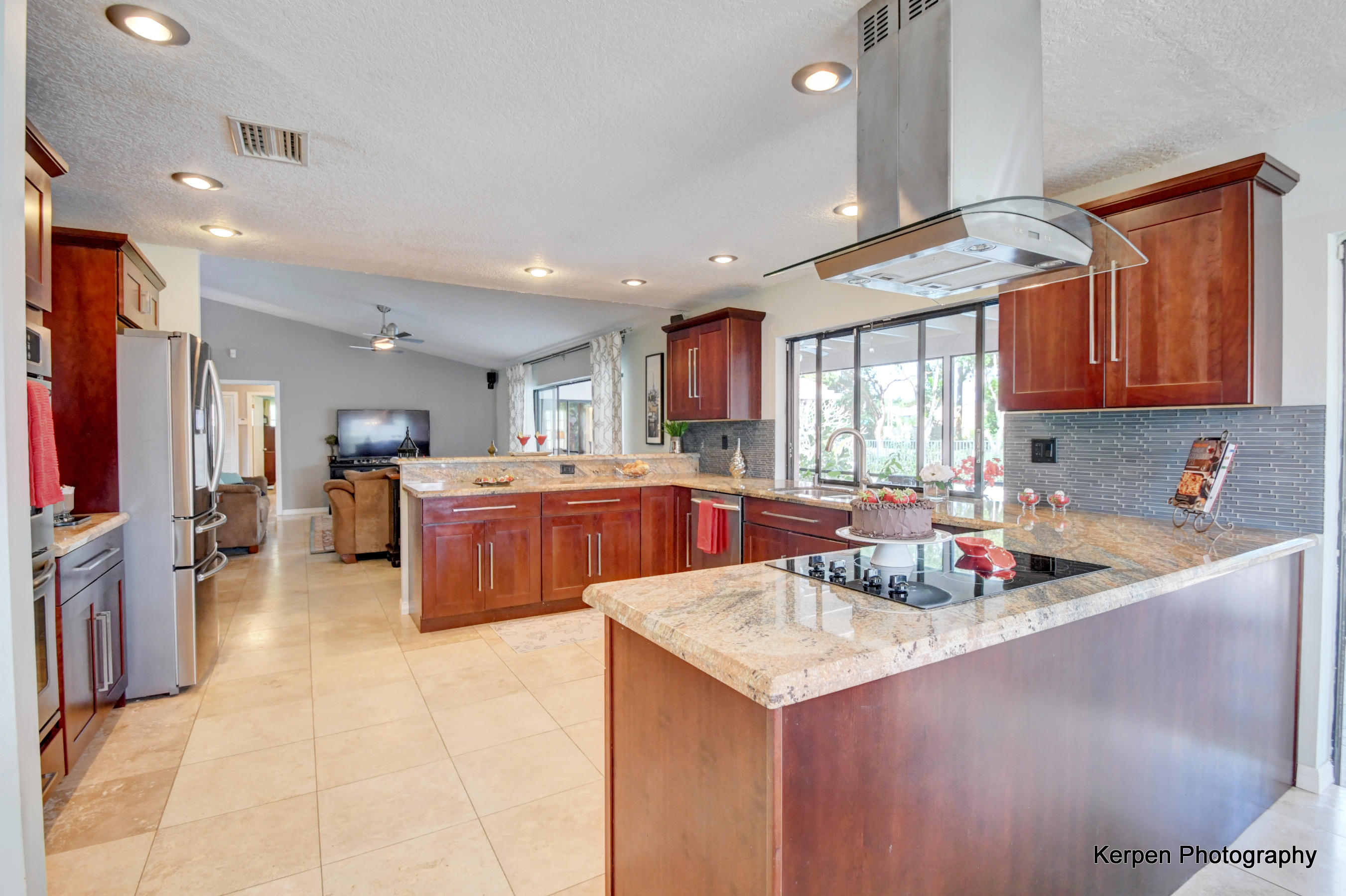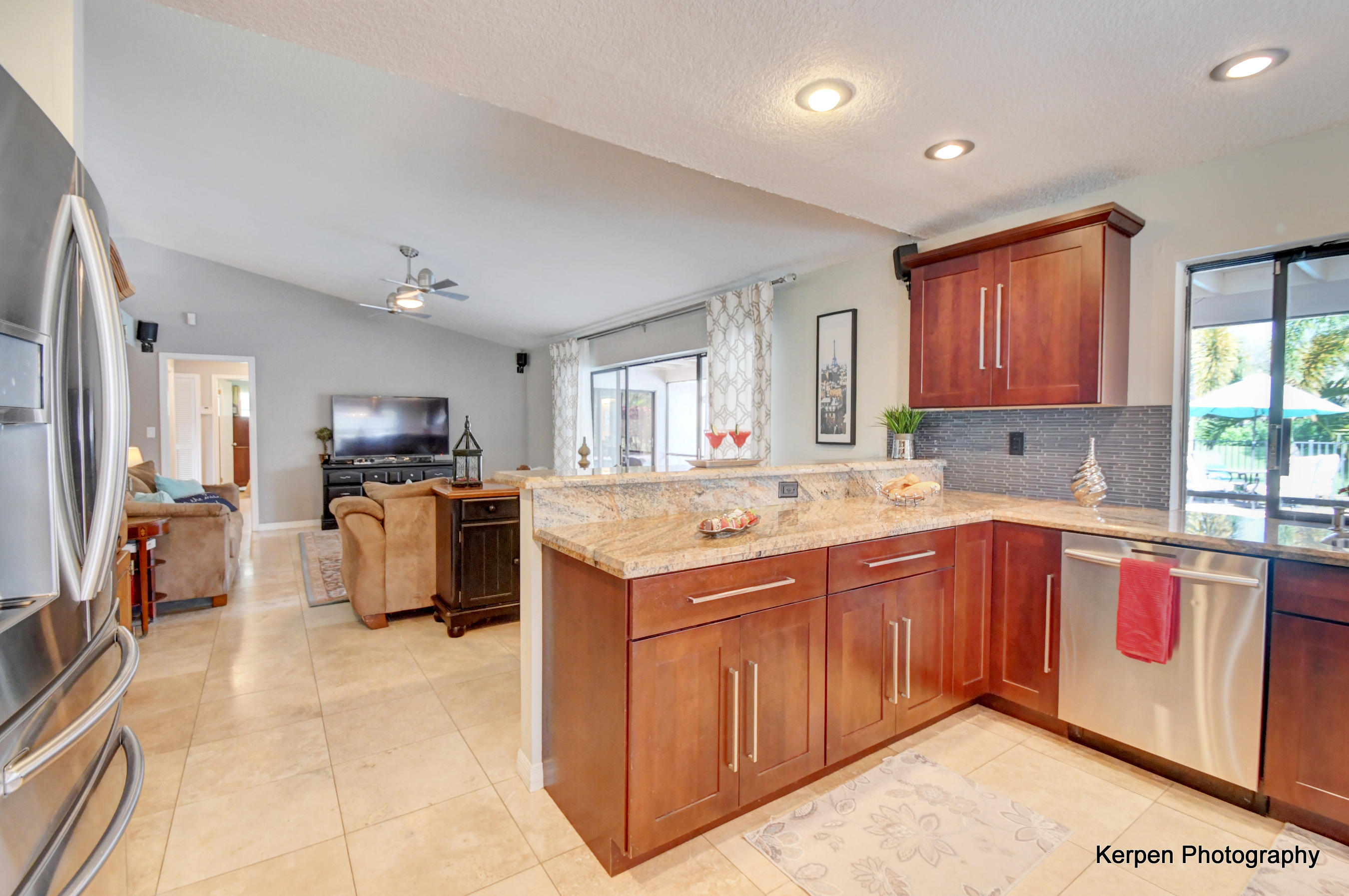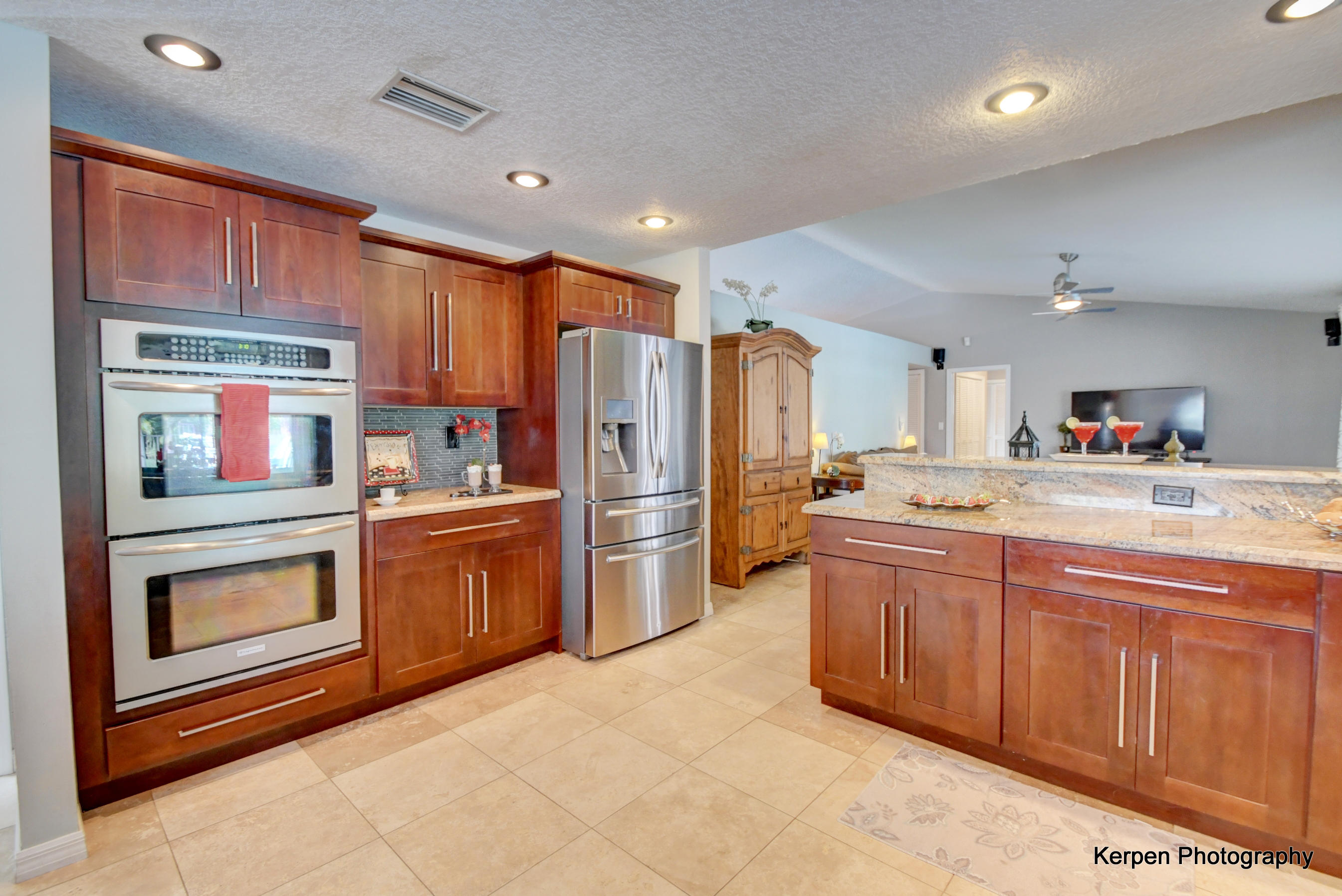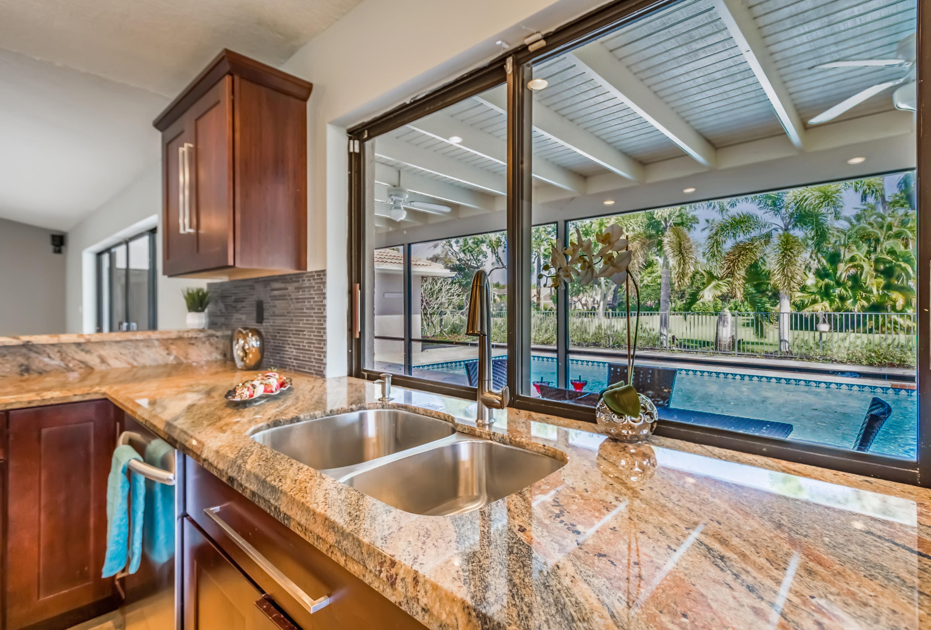 Fabulous corner lot home has 4 bedrooms, 2.5 baths, 2 car garage, Pool, Huge Backyard of more than half an acre. & nearly 50 feet between homes! No Zero lot line! This open, bright floor plan features vaulted ceilings, gourmet kitchen with stainless appliances including a stainless hood, double oven, touchless water faucet, granite counters, wood cabinetry, & so much more! Travertine floors throughout living areas, and laminate wood flooring in the bedrooms (no carpet). Tons of windows, many looking onto the patio and pool. Huge Master Suite, with his and her separate bathrooms with separate sinks and his & her separate walk in closets that you can meet in the middle/huge shower & separate bath tub.