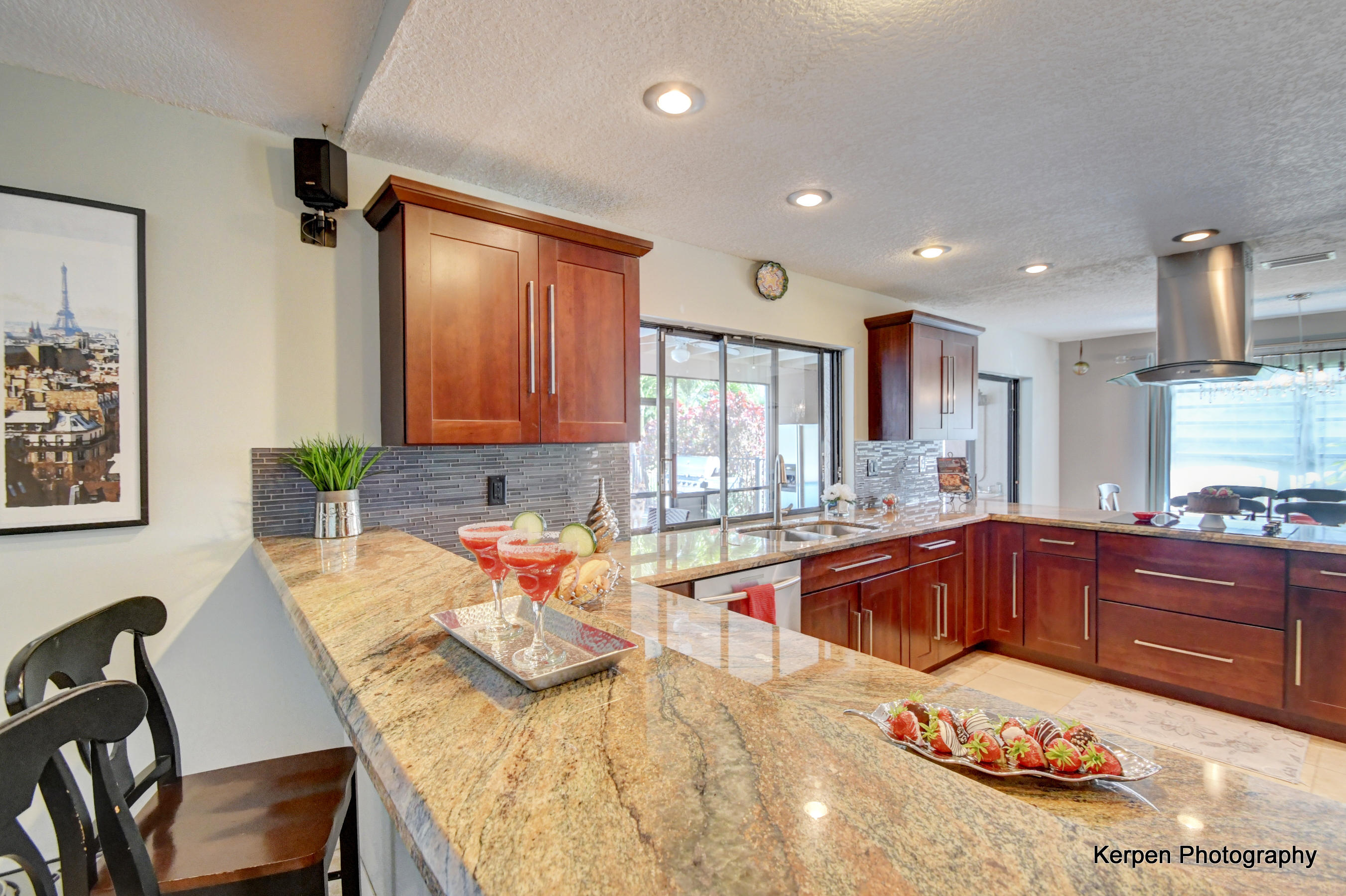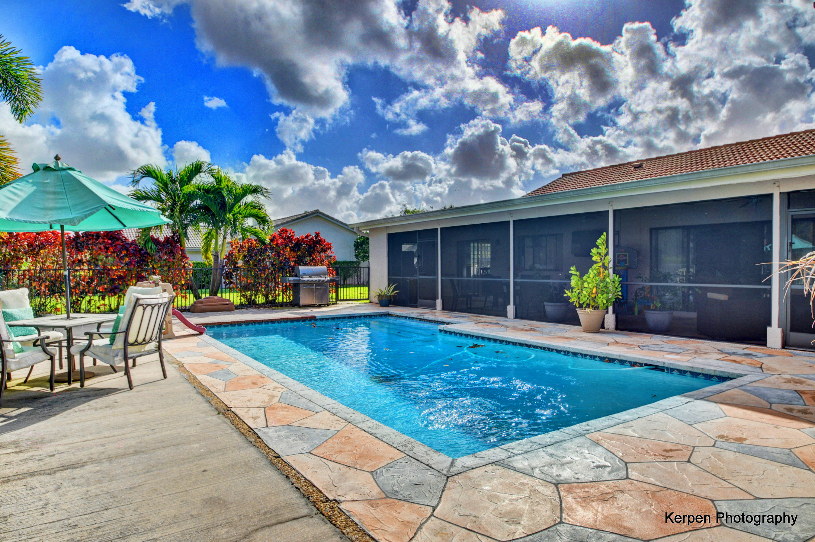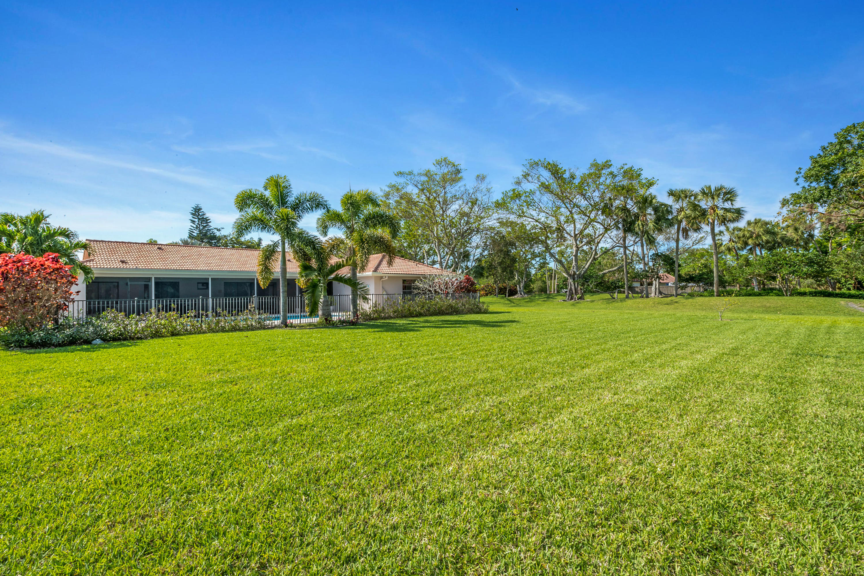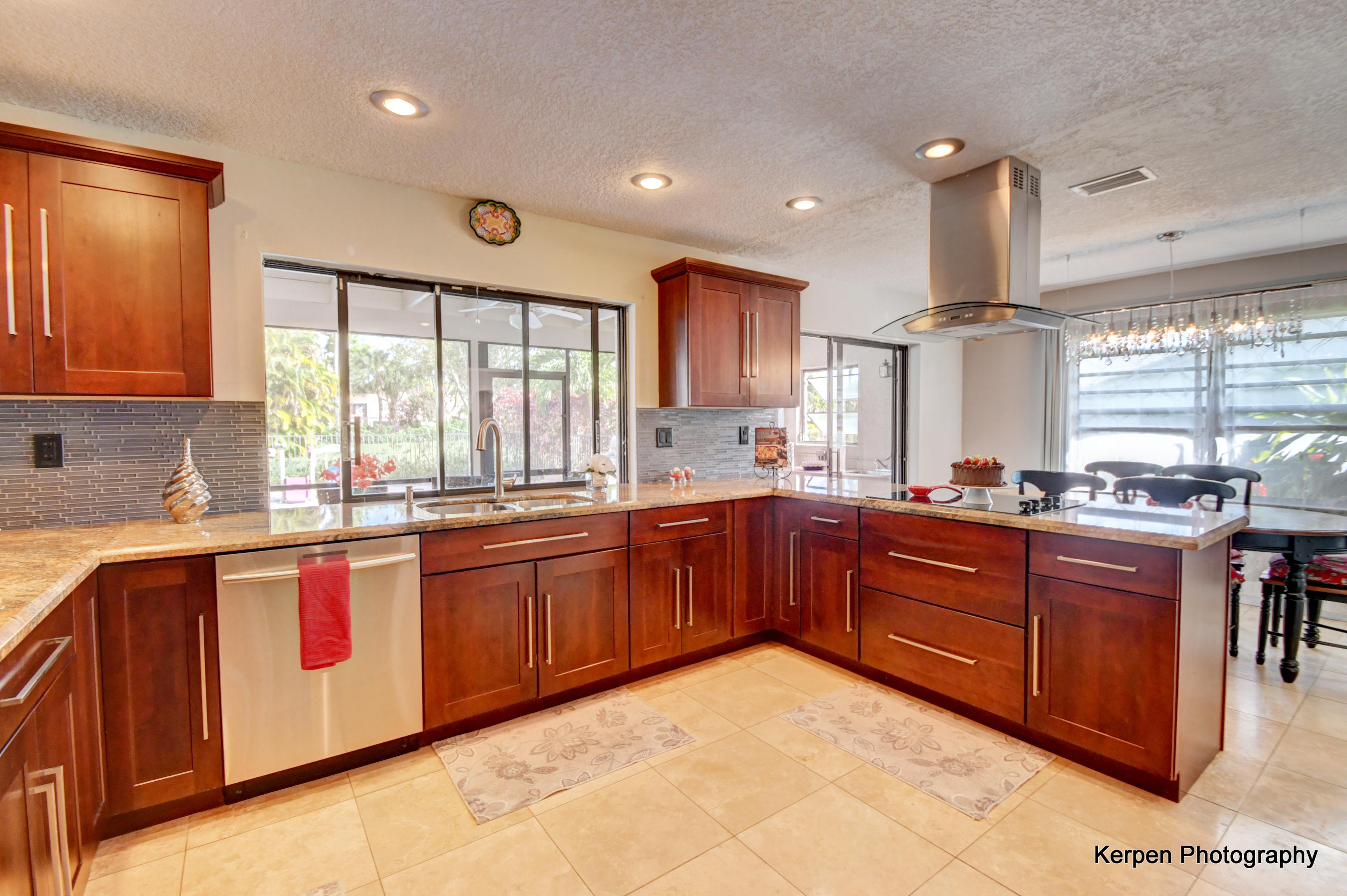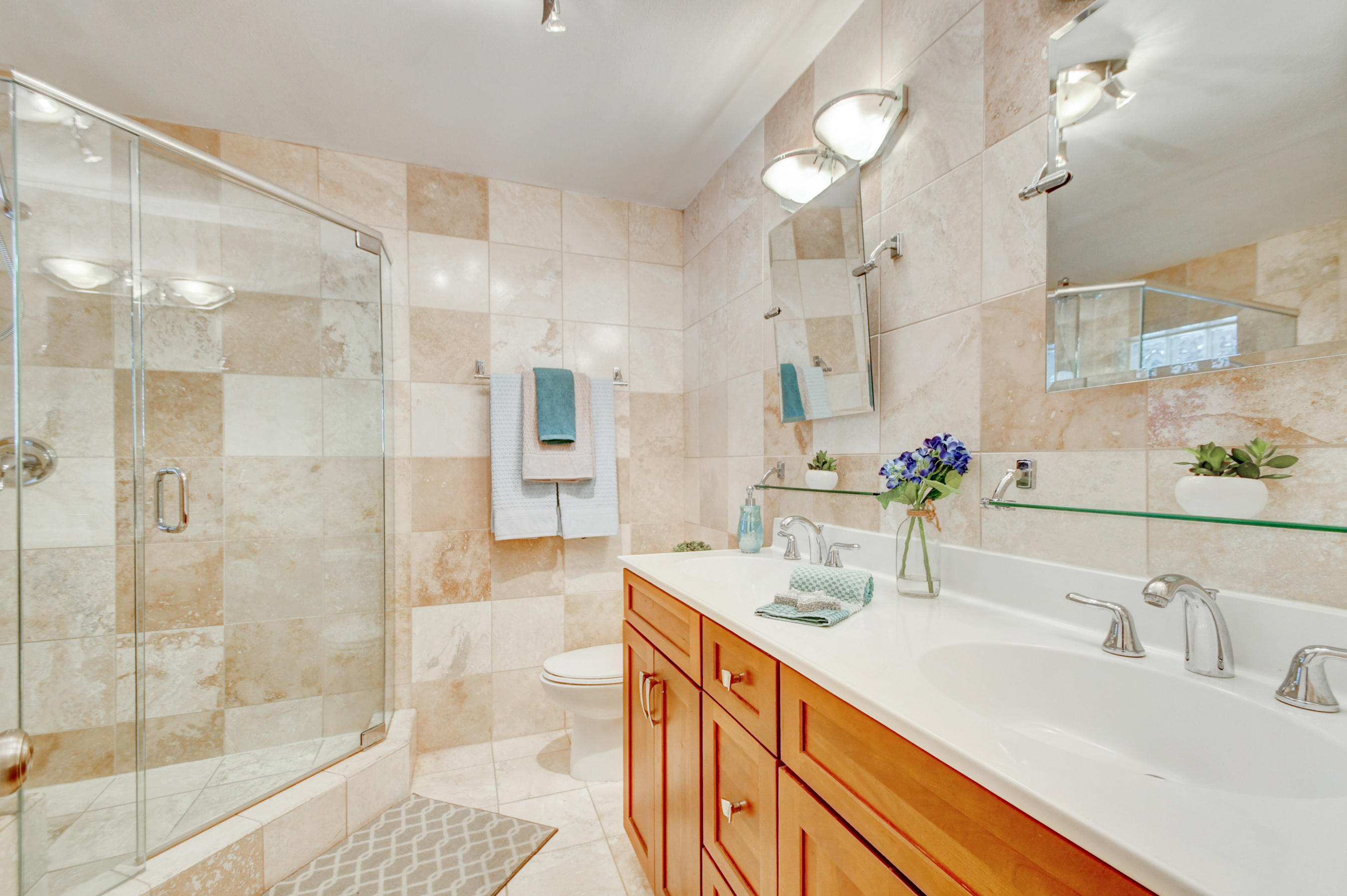 Fabulous corner lot home has 4 bedrooms, 2.5 baths, 2 car garage, Pool, Huge Backyard of more than half an acre. & nearly 50 feet between homes! No Zero lot line! This open, bright floor plan features vaulted ceilings, gourmet kitchen with stainless appliances including a stainless hood, double oven, touchless water faucet, granite counters, wood cabinetry, & so much more! Travertine floors throughout living areas, and laminate wood flooring in the bedrooms (no carpet). Tons of windows, many looking onto the patio and pool. Huge Master Suite, with his and her separate bathrooms with separate sinks and his & her separate walk in closets that you can meet in the middle/huge shower & separate bath tub.