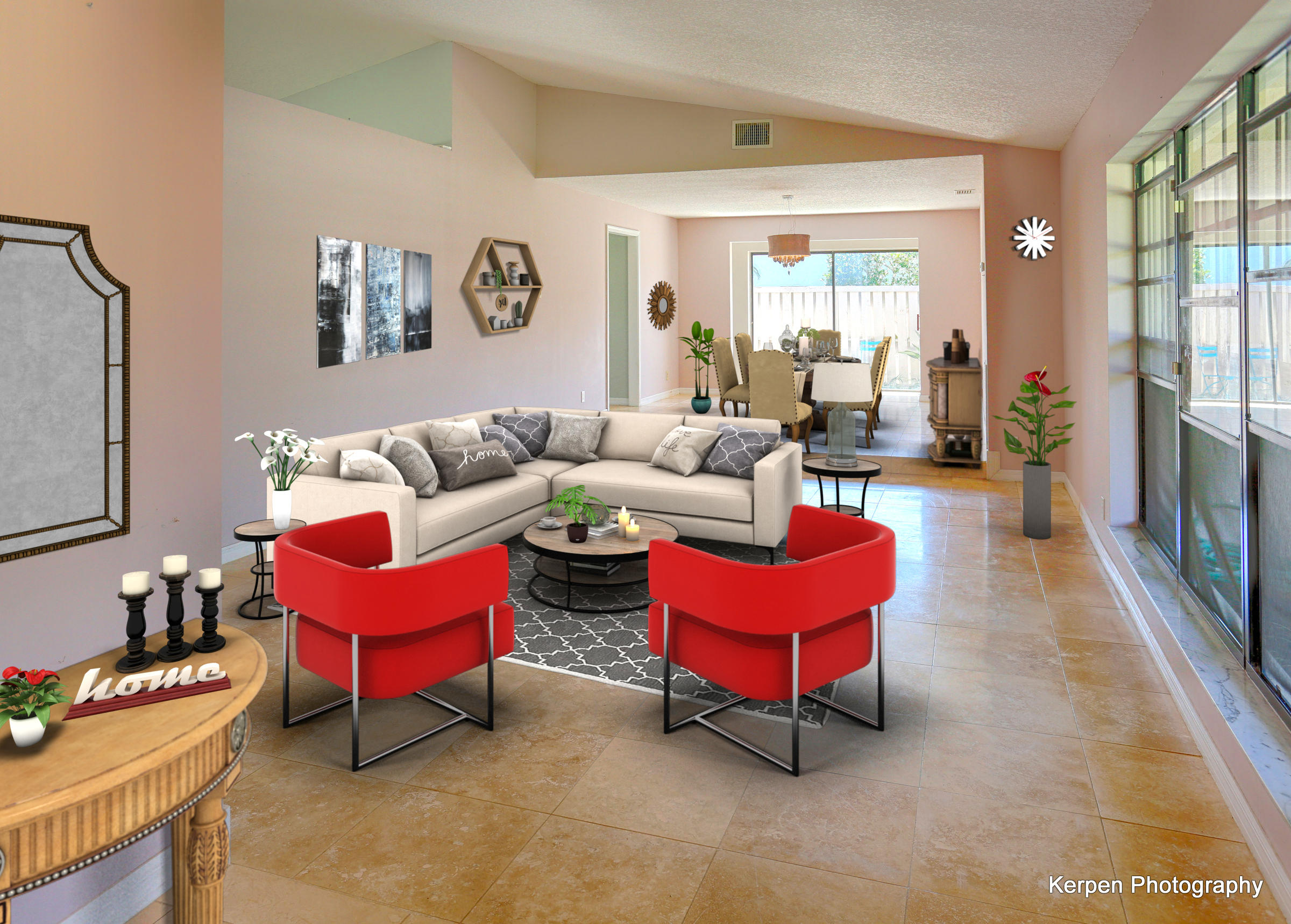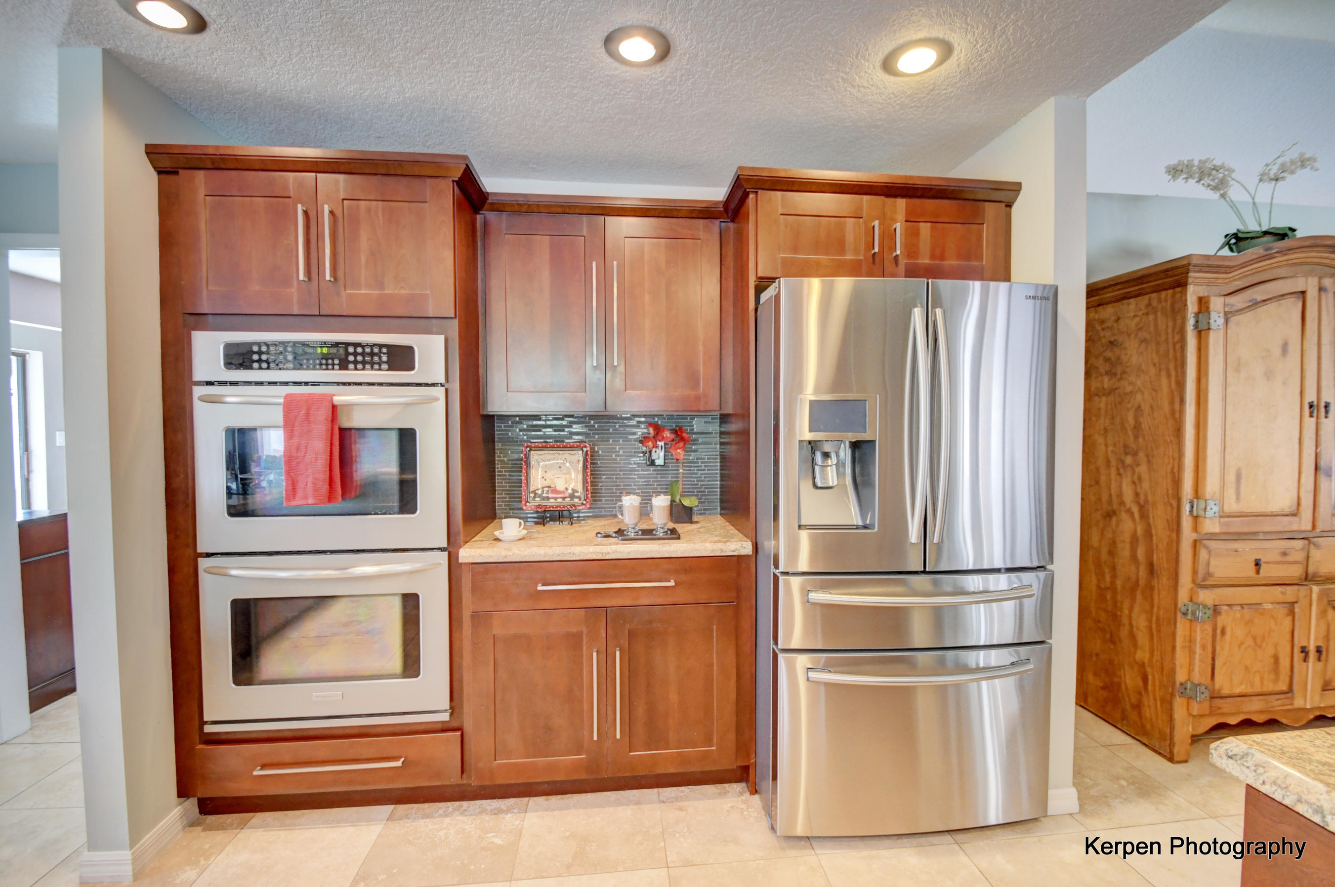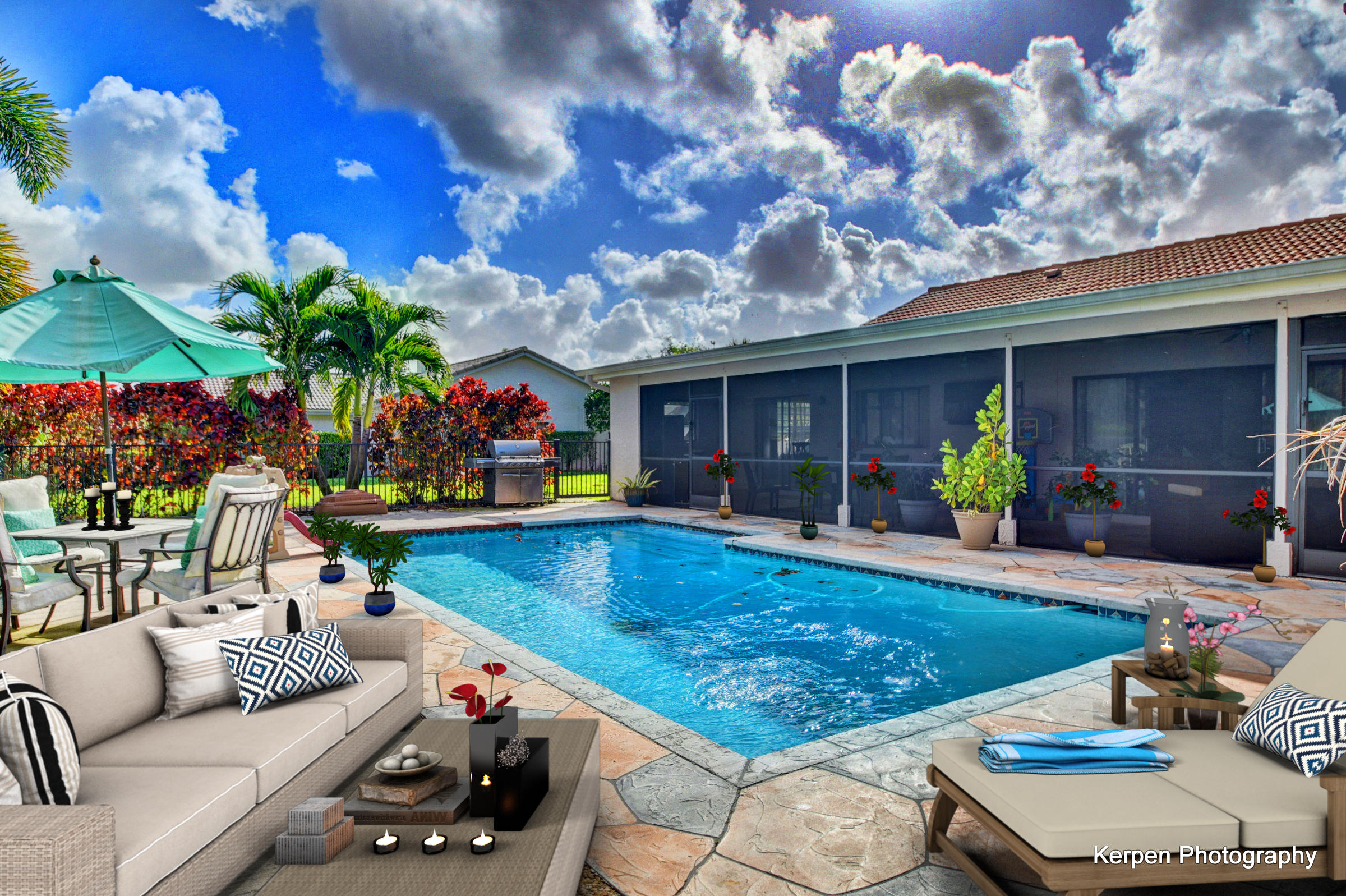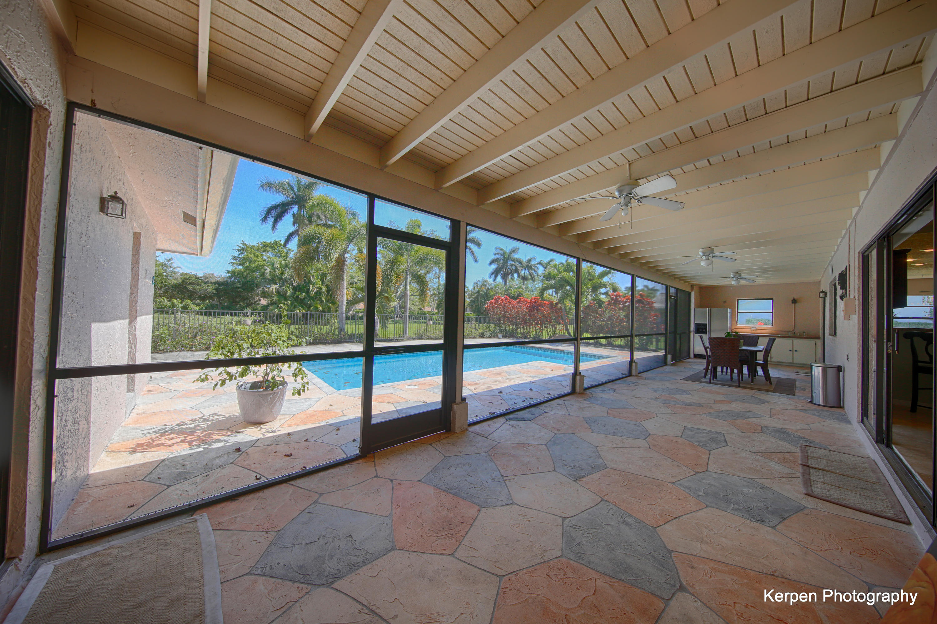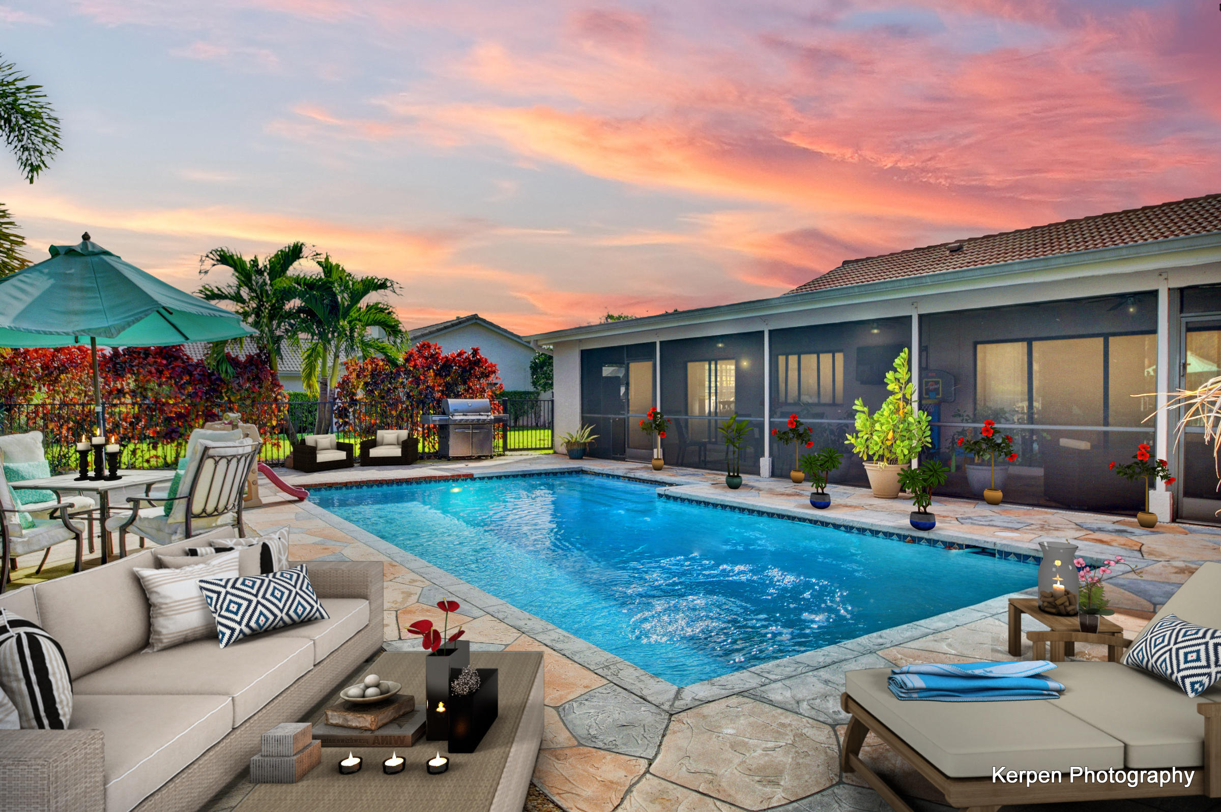 Fabulous corner lot home has 4 bedrooms, 2.5 baths, 2 car garage, Pool, Huge Backyard of more than half an acre. & nearly 50 feet between homes! No Zero lot line! This open, bright floor plan features vaulted ceilings, gourmet kitchen with stainless appliances including a stainless hood, double oven, touchless water faucet, granite counters, wood cabinetry, & so much more! Travertine floors throughout living areas, and laminate wood flooring in the bedrooms (no carpet). Tons of windows, many looking onto the patio and pool. Huge Master Suite, with his and her separate bathrooms with separate sinks and his & her separate walk in closets that you can meet in the middle/huge shower & separate bath tub.