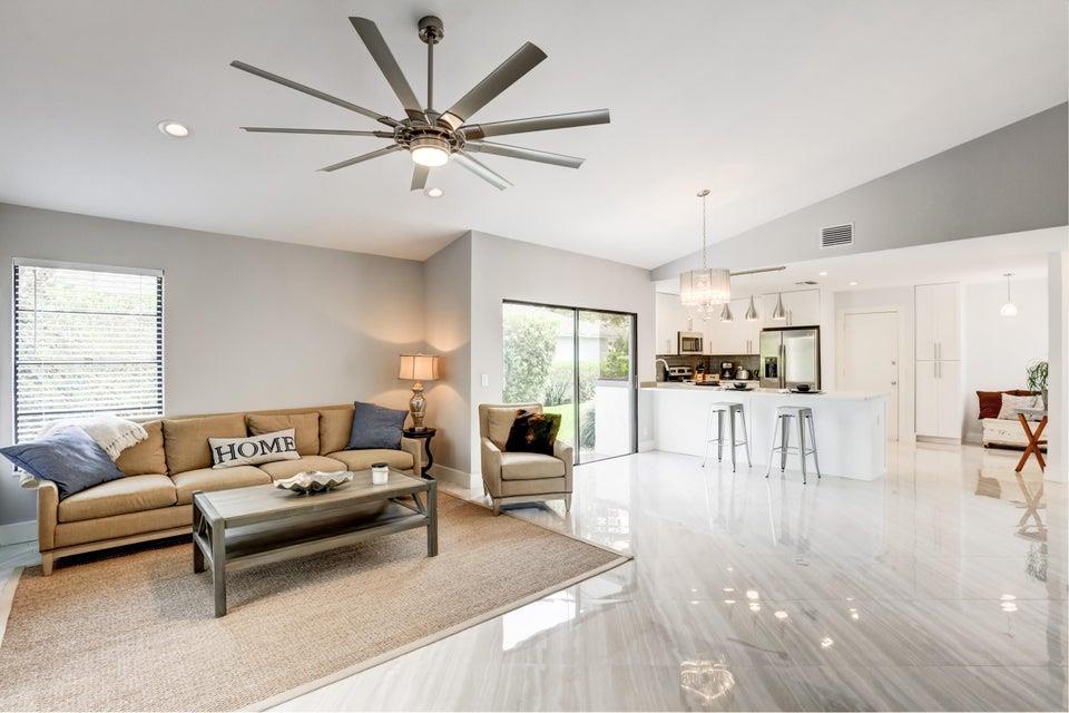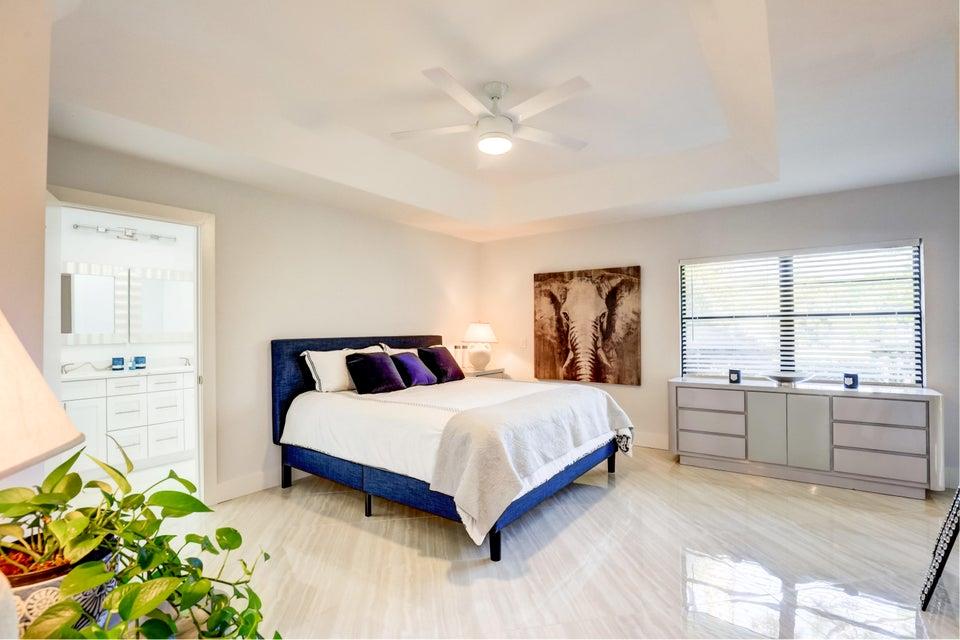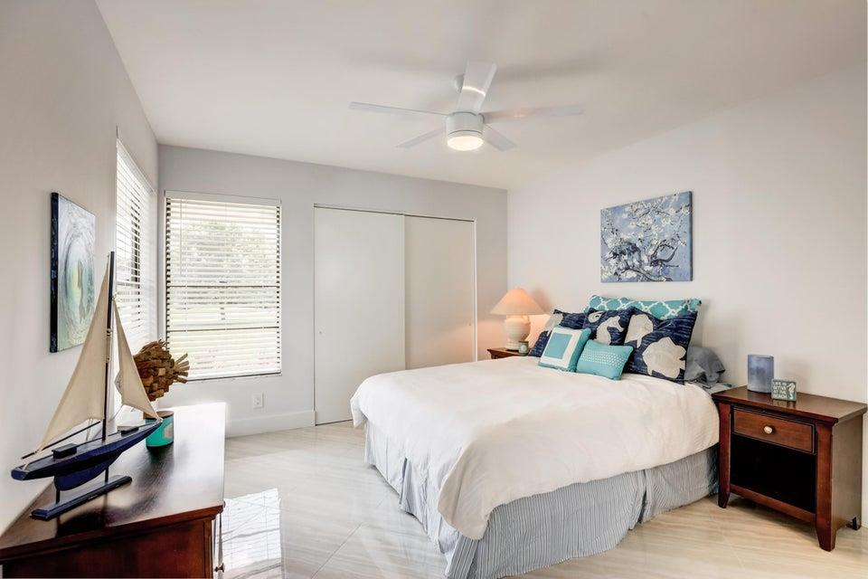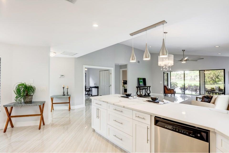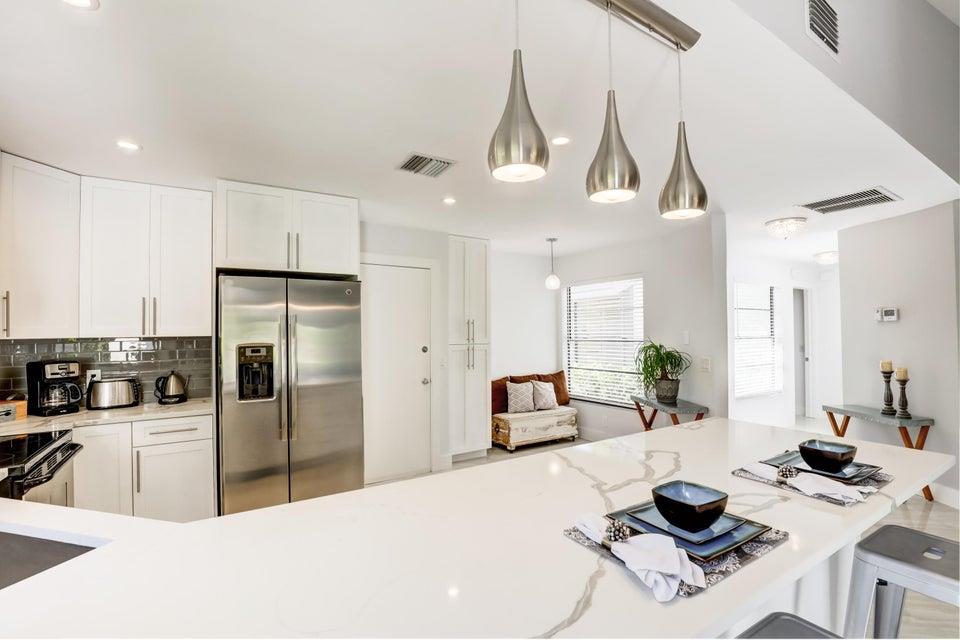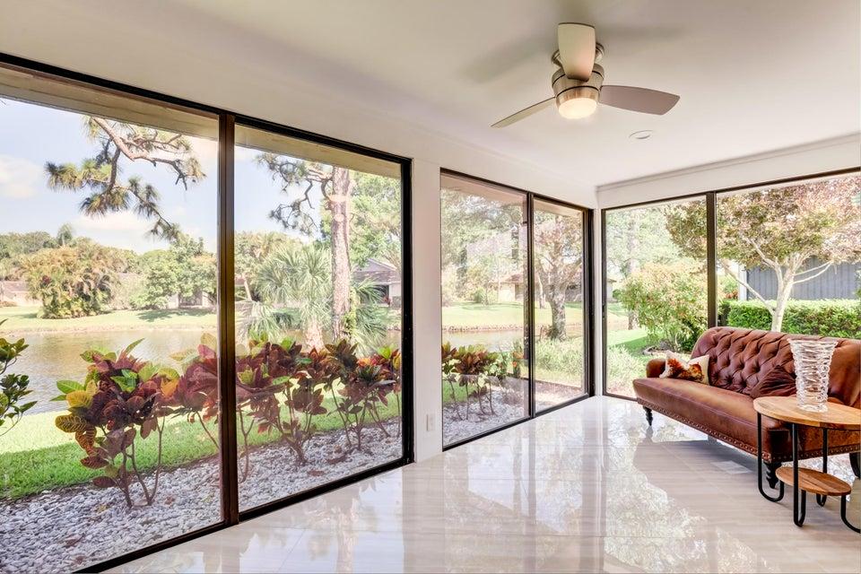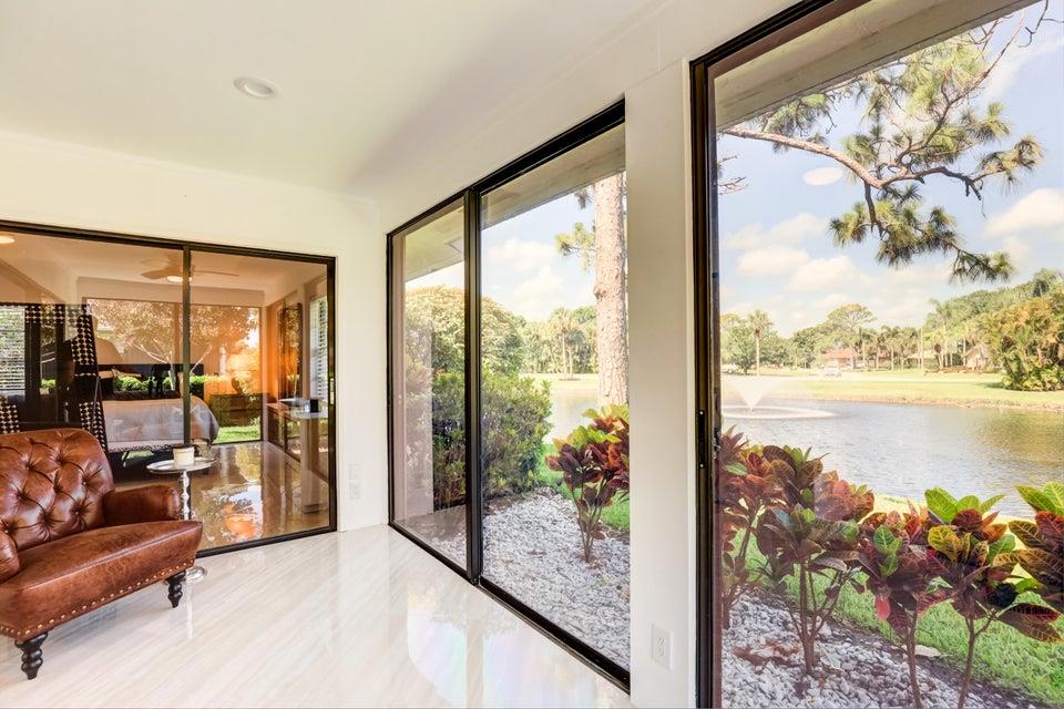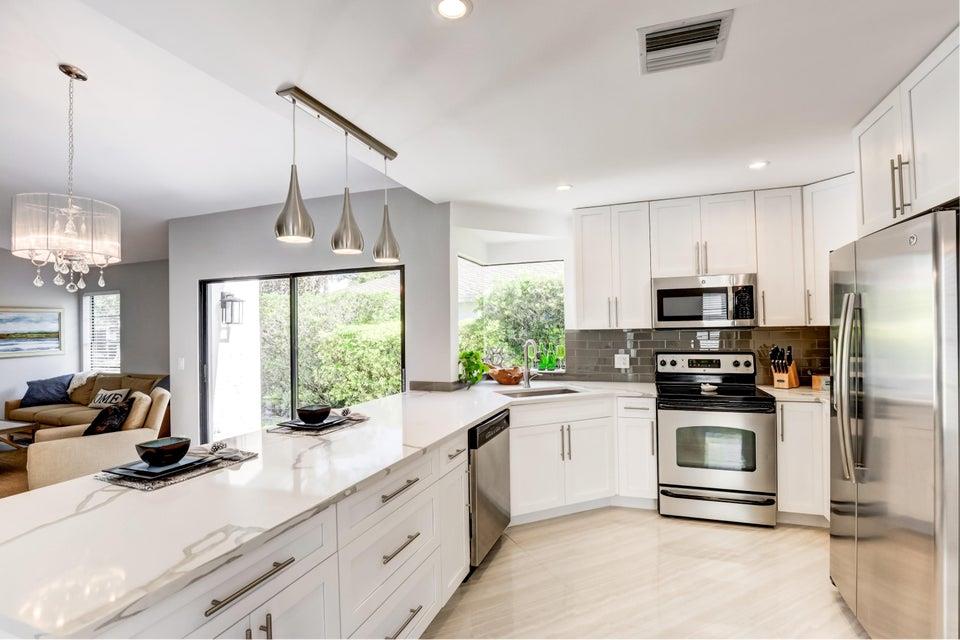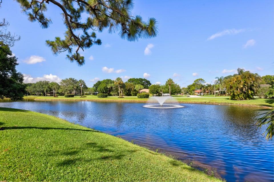 Beautifully renovated in 2017 Italian-style porcelain tile floors, Carrera Quartz countertops, solid wood Shaker cabinetry, and Moen fixtures. Light and bright open floor plan with two outdoor patios and peaceful water/fountain views from three sides. A/C and water heater two years old. Private location at end of cul-de-sac.