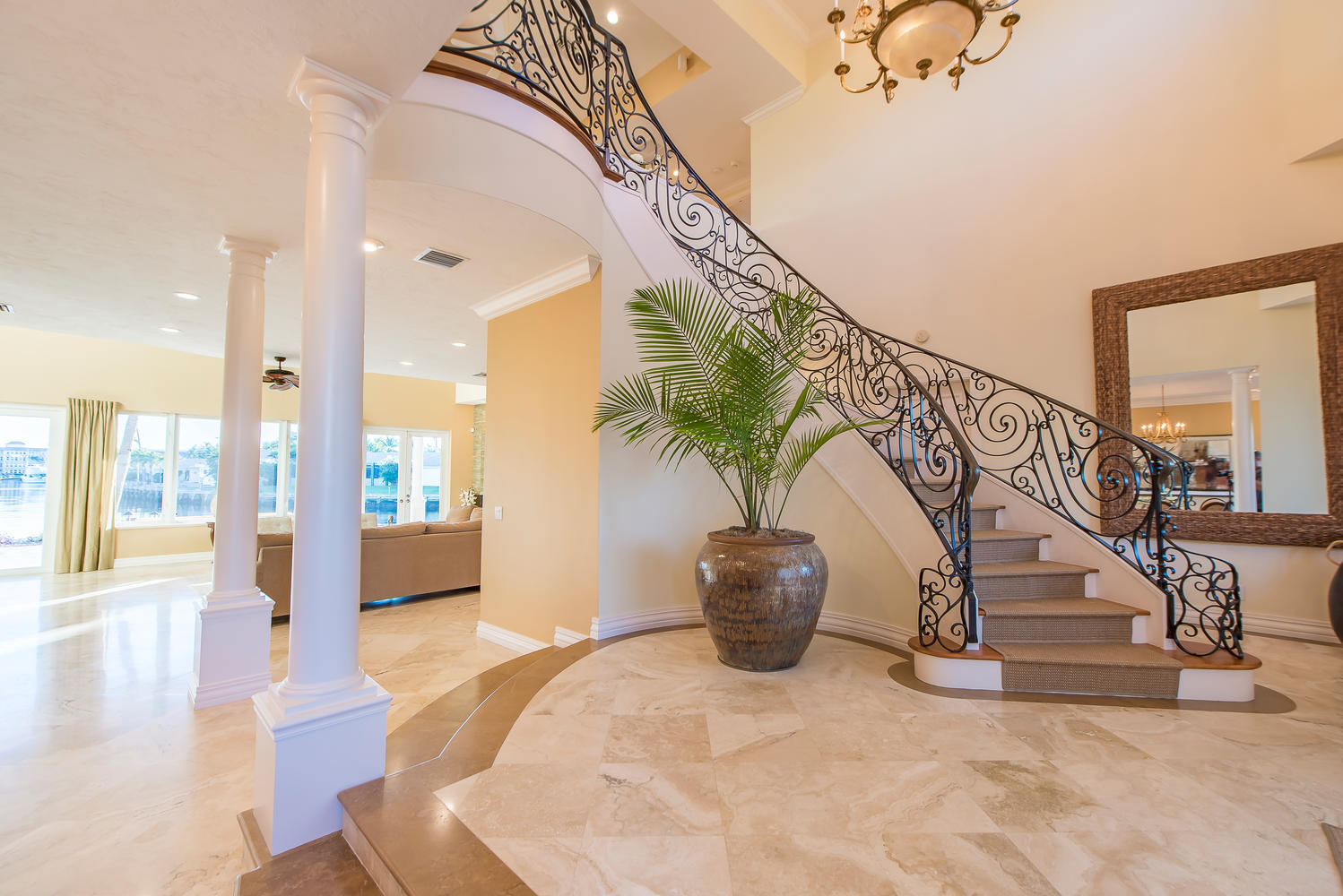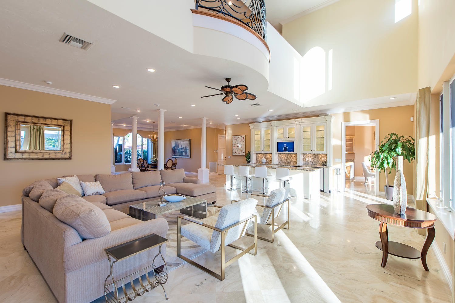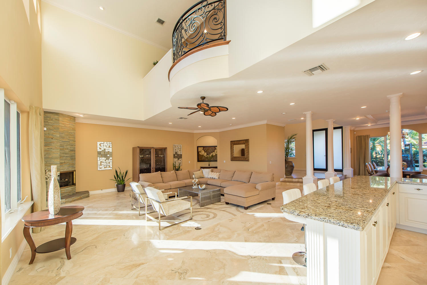 Elegant, light and bright 5 bed 5 bath home with 2 bonus rooms and a 4 car garage!! Spectacular endless southern water views are seen from almost every area of the home. Grand entry way with massive impact doors, wrought iron staircase & marble floors. Chef's kitchen, double ovens & frig,gas cooktop and island with many features.Setup to entertain.Impressive master suite.Impact windows and doors T/O & alarm system.Cabana bath & heated saltwater pool. Open floor plan with custom full service wet bar.