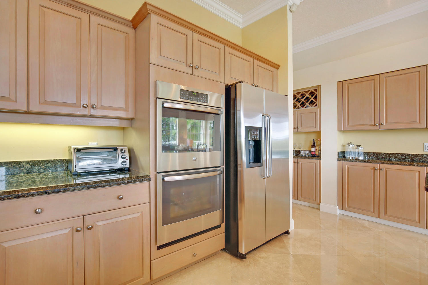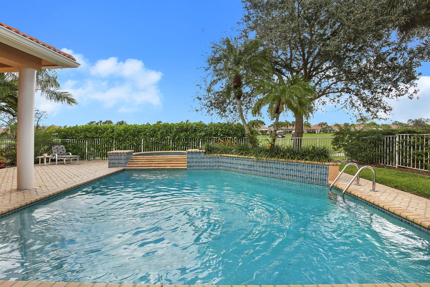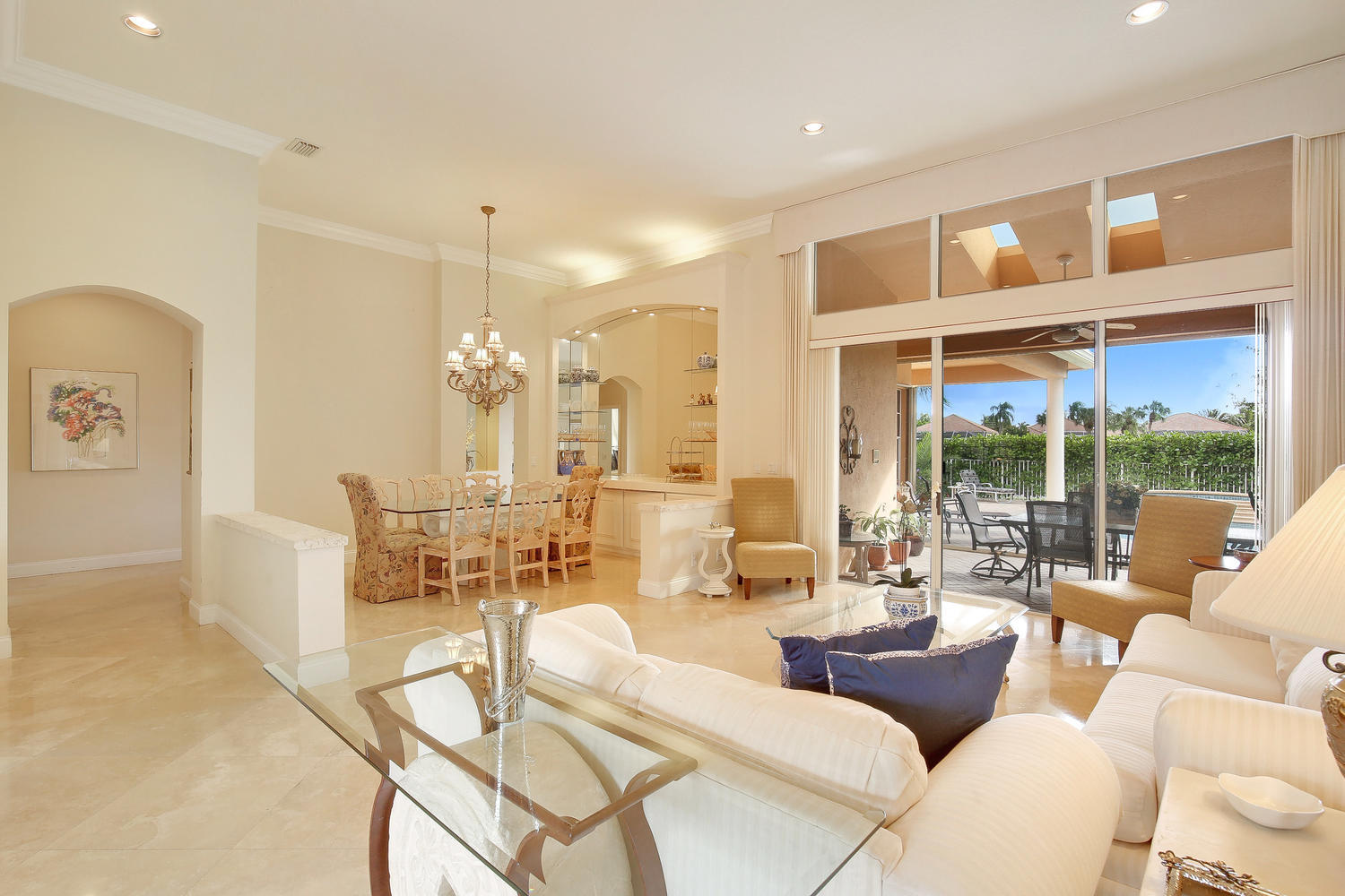 Beautiful furnished home in private cul-de-sac location with spectacular golf fairway views. So many newer upgrades including 24'' diagonal Saturnia Marble floors, newer roof (2015). Pool & Spa resurfaced, (Diamond Brite-2017-with 15 year warranty) Crown molding thru-out home. New stainless steel appliances, New garage doors, 3 car garage, accordian shutters, newer washer/dryer. Lovely patio area overlooking pool & golf course.Wonderful floor plan & location!
