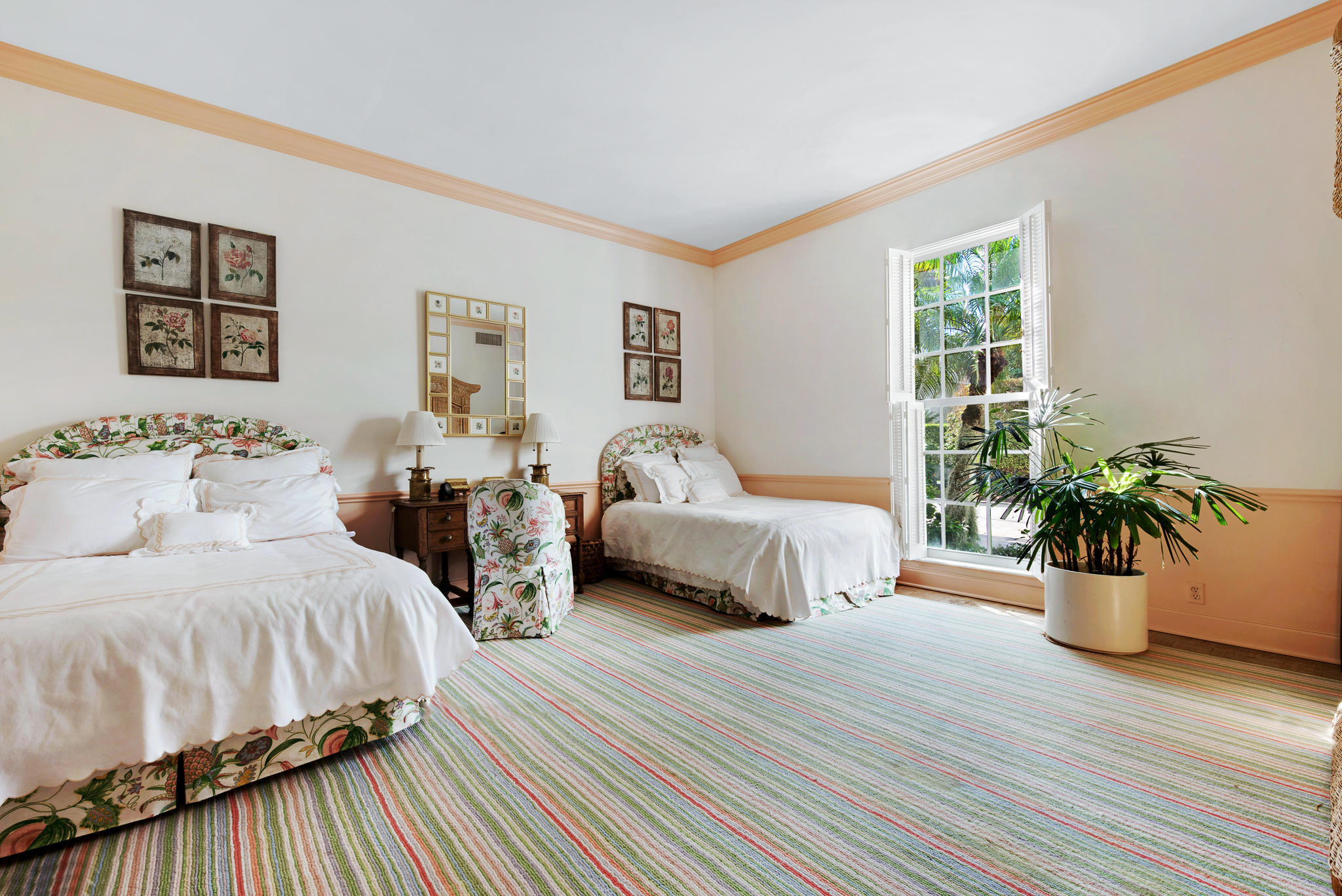 Stunning Palm Beach Regency built by Robert Gottfried and designed by Ames Bennett. Located in a wonderful central location, only three houses from the beach. The property is situated on a large lot approximately 140' X 125'. The spacious residence offers 5 bedrooms, 5 1/2 baths, 10 foot ceilings on the first floor with a formal living room and dining room, a library/family room, kitchen and a cabana/exercise room right off the large swimming pool. Other features include lush tropical landscaping with two papaya trees, private street with underground utilities, deeded beach access for homeowners and their guests, and easy access to the Palm Beach bike trail.