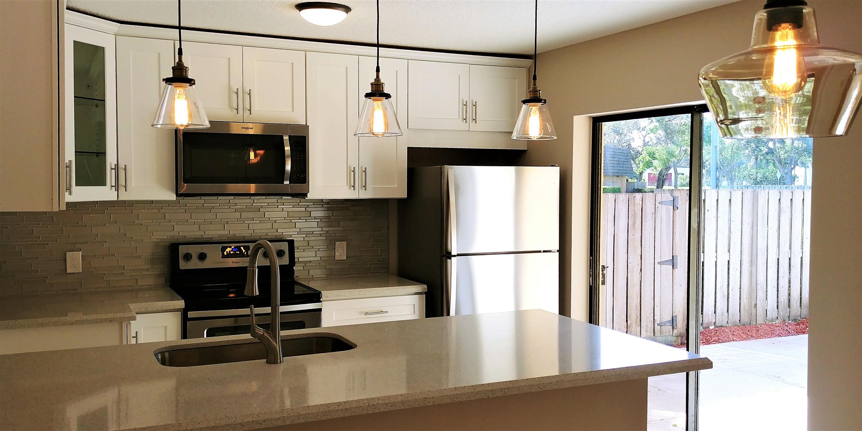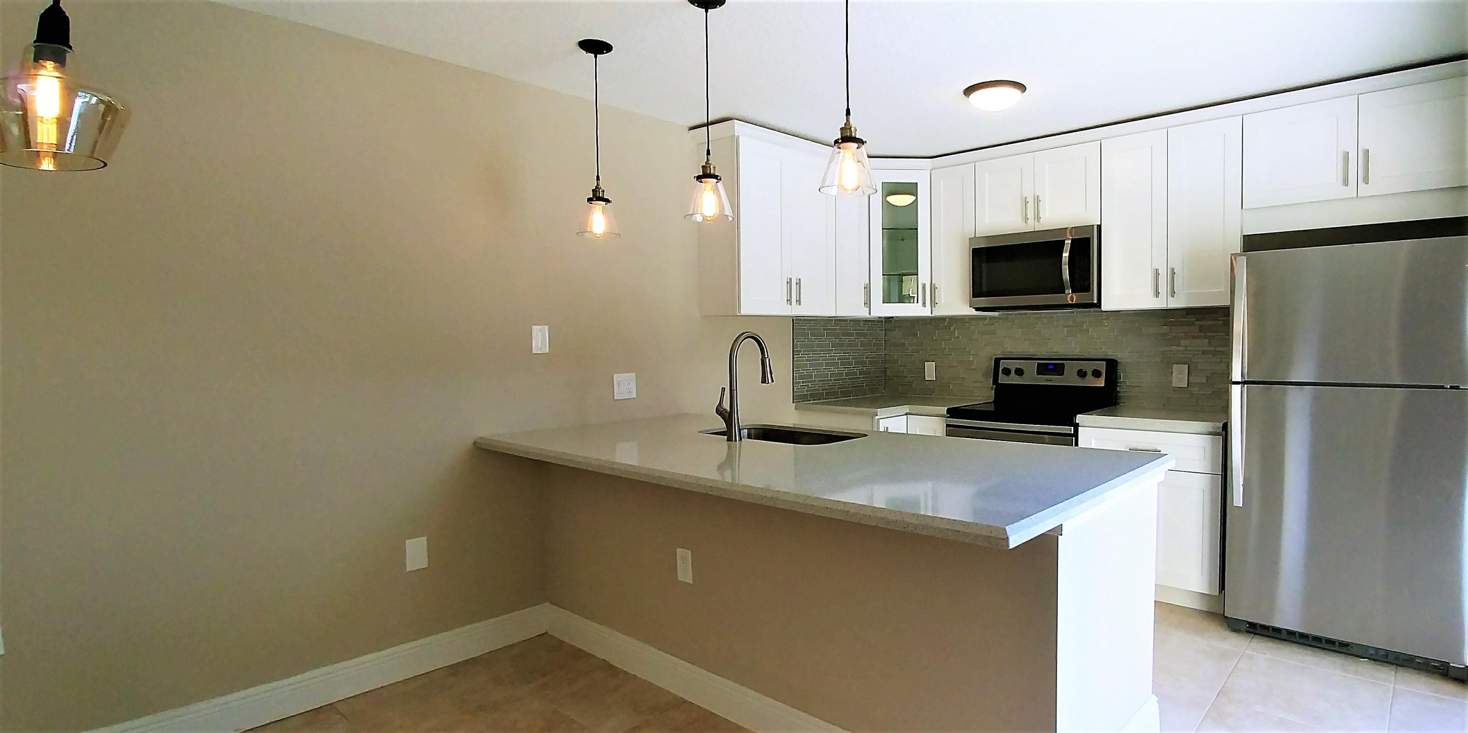 WOW!!! This Sandalwood townhouse has been completely remodeled and is basically a brand new home!! Enjoy your view of the canal and huge amounts of green space right outside your totally private entrance. The Chef's kitchen has been opened up and features an oversized island, white shaker style soft close cabinets, brand new stainless appliances, quartz counters, and mosaic tile backsplash. The kitchen also features custom pendant lighting that really make the island pop. The downstairs living area has fantastic ceramic tile that extend into the storage area and powder room. Entire home has been freshly painted with new light fixtures and ceiling fans. The cabinets in the laundry room have been replaced along with the vanity, counter top, and hardware. All of the baseboards