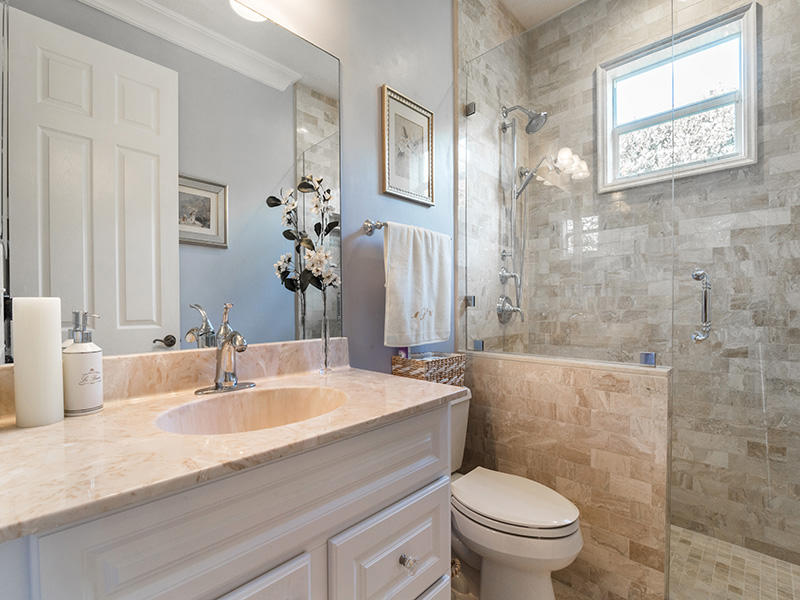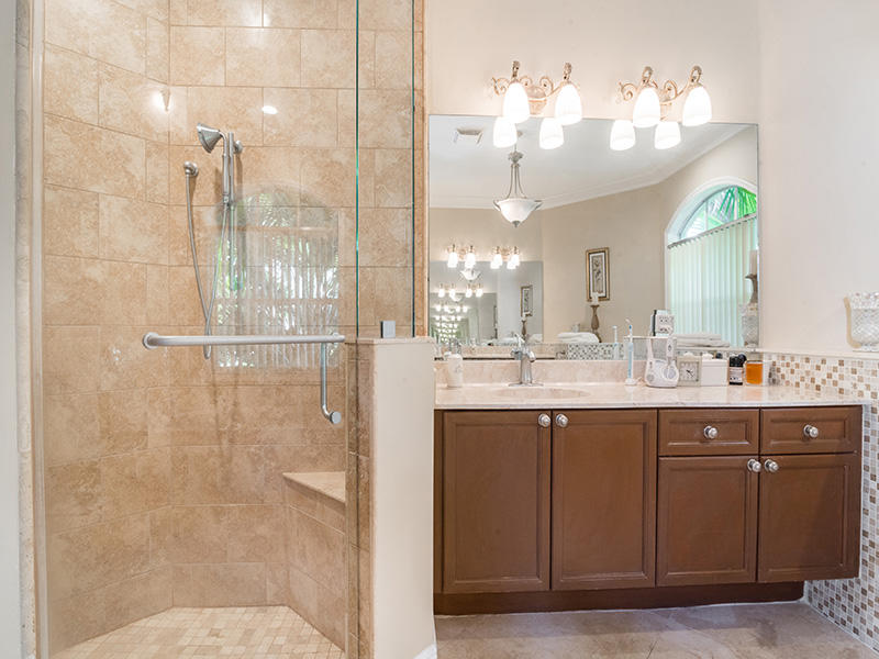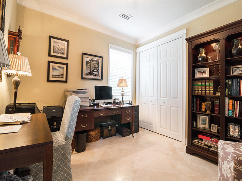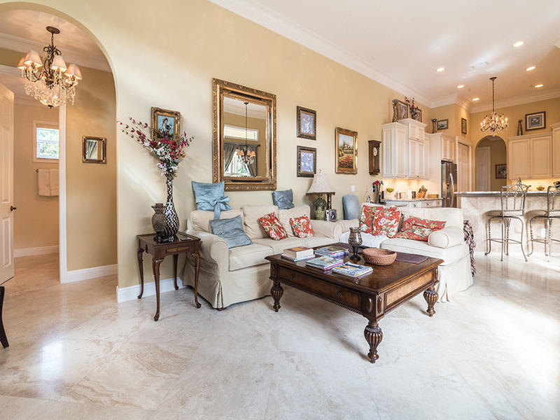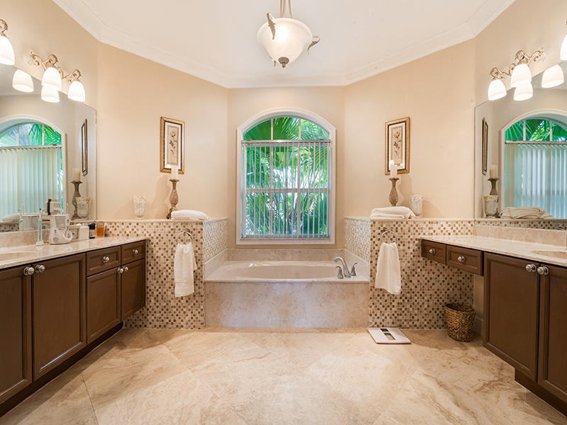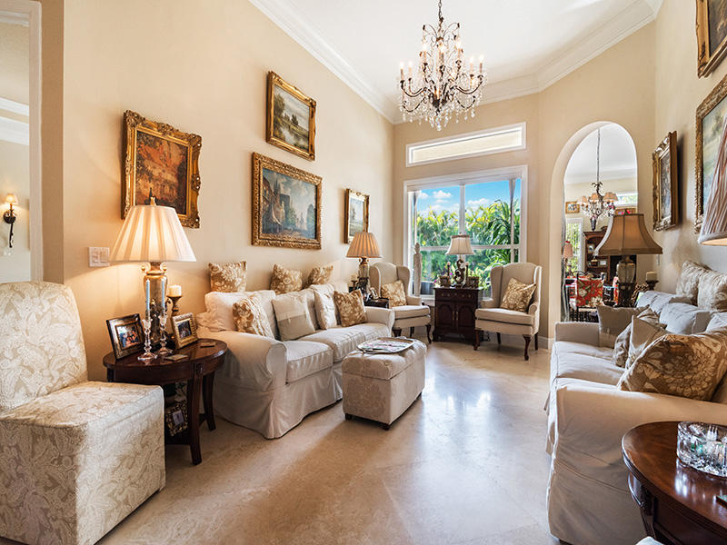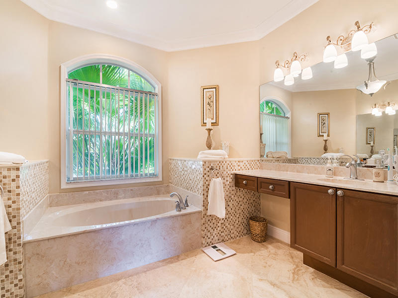 Gorgeous pool home in Palisades! An exclusive, gated community in central, West Palm Beach location! This home is situated on the most desirable end lot on a cul de sac with a lake view. Only one neighbor! Come inside and be wowed by soaring ceilings, spacious living areas, marble flooring throughout and 5.25 inch baseboards. The bedrooms are spacious as well and the master suite is complete with a luxurious master bathroom which offers a relaxing spa tub and separate shower enclosure. This home offers a 3-way bedroom split floor plan! The inviting kitchen boasts granite counter tops, crown molding and stainless steel appliances. Step outside and into a gorgeous patio where you can enjoy a heated, saltwater, 6ft deep pool with 4-way ARC fountains. The low HOA in this beautiful community
