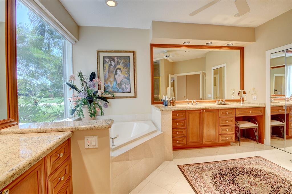 Elegant home with golf course and lake view located in the award-winning club of Broken Sound in the heart of Boca Raton. Soaring 20 foot ceilings, gorgeous marble tiled floors, 3-car garage, and a fabulous outside entertaining area make this the ideal home for Florida living. Kitchen includes wood cabinets, granite countertops, propane-gas stove, double electric ovens, water filter, and Monogram refrigerator. Master bedroom, located on the main floor, offers built out walk-in closets. Master bathroom includes his and hers sinks, separate shower and jacuzzi tub, plus an additional linen closet. This bright house features a newer S-tiled roof (2009) and newer flat roof (2007), 3 AC units (2017/2007), whole house water filtration system, hurricane shutters, 500 gallon in ground propane