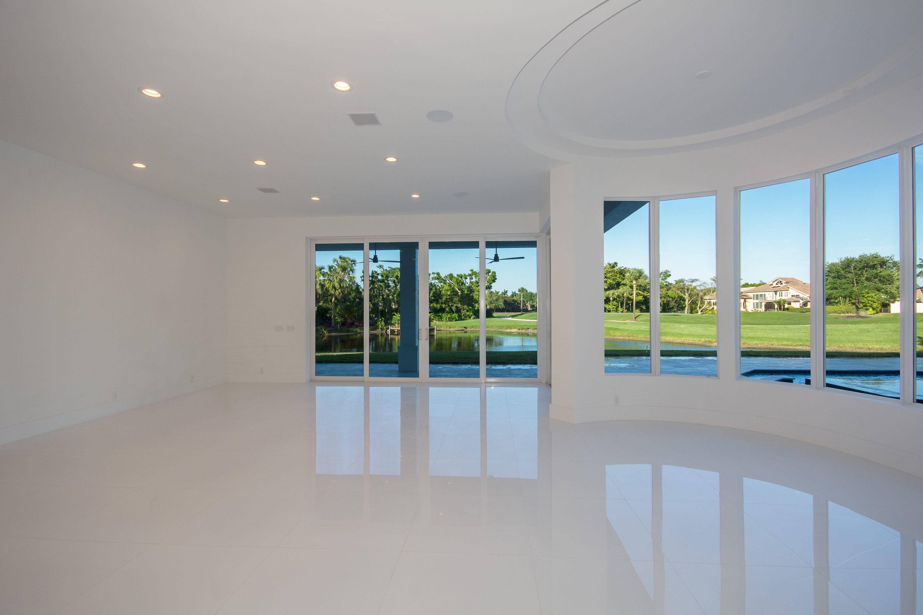 Clean, sleek interior showcase window walls of glass overlooking panoramic lake and golf course views in this impressive 6 bedroom, 7.2 bath estate. Totally renovated in 2018 with elegant entertaining spaces feature a stunning living room with custom fireplace, bar and dramatic staircase, formal dining room, gourmet kitchen and expansive family room. Quality and attention to detail is evident with top of the line appliances and fittings throughout. A grand master suite offers a private sitting room, luxurious marble his and her baths and generous wardrobes. An office and two additional en suite bedrooms complete the first floor. Upstairs feature three en suite bedrooms, loft area and beautiful balcony overlooking spectacular views. The expansive outdoor entertainment area offers a