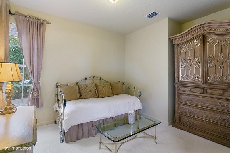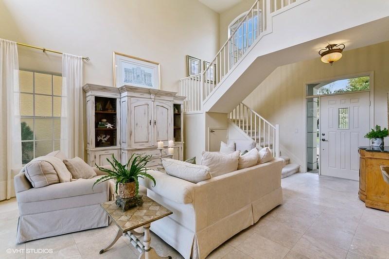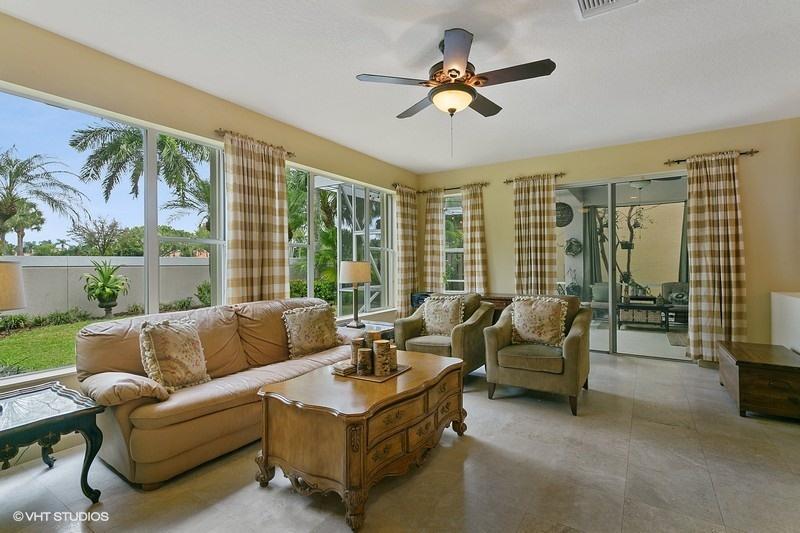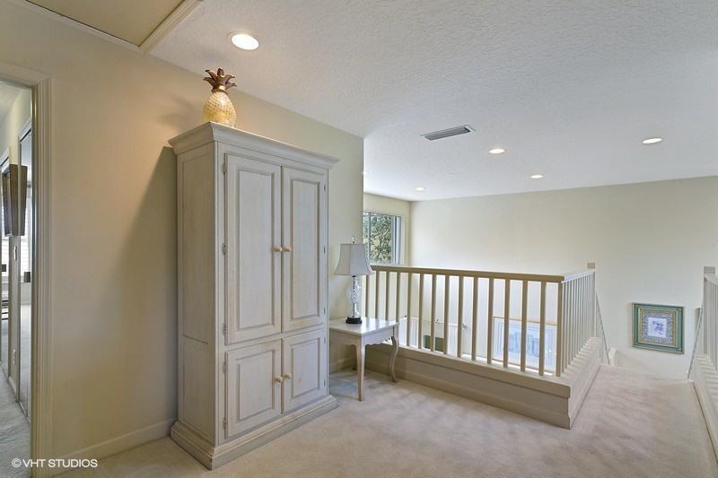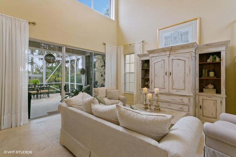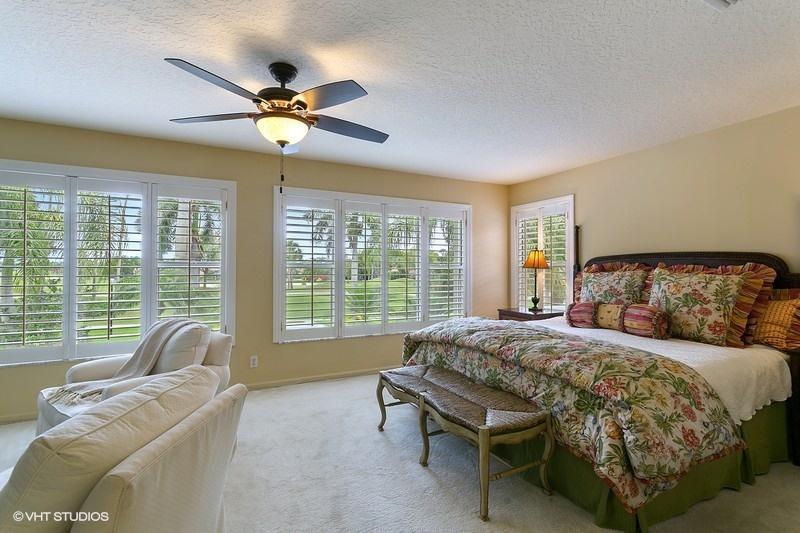 An exceptionally clean home conveniently located between the clubhouse and the main entrance. Beautiful travertine marble flooring installed on most of the main level, with new carpet in the front bedroom and new wood laminate in the upstairs bedroom. A spectacular view of the Heritage course from the expanded master bedroom that includes a sitting area and plantation shutters which frame the view and allow for spectacular natural light. On the lower level is a multifunctional bedroom which could become a library, media room, or den. Interior updates include: 2 new A/C compressors and handlers, new tile in upstairs bathroom, most lights replaced with LED, and a newer gas water heater. Exterior features include a large screened veranda, accordion-style storm shutters, and new landscaping.