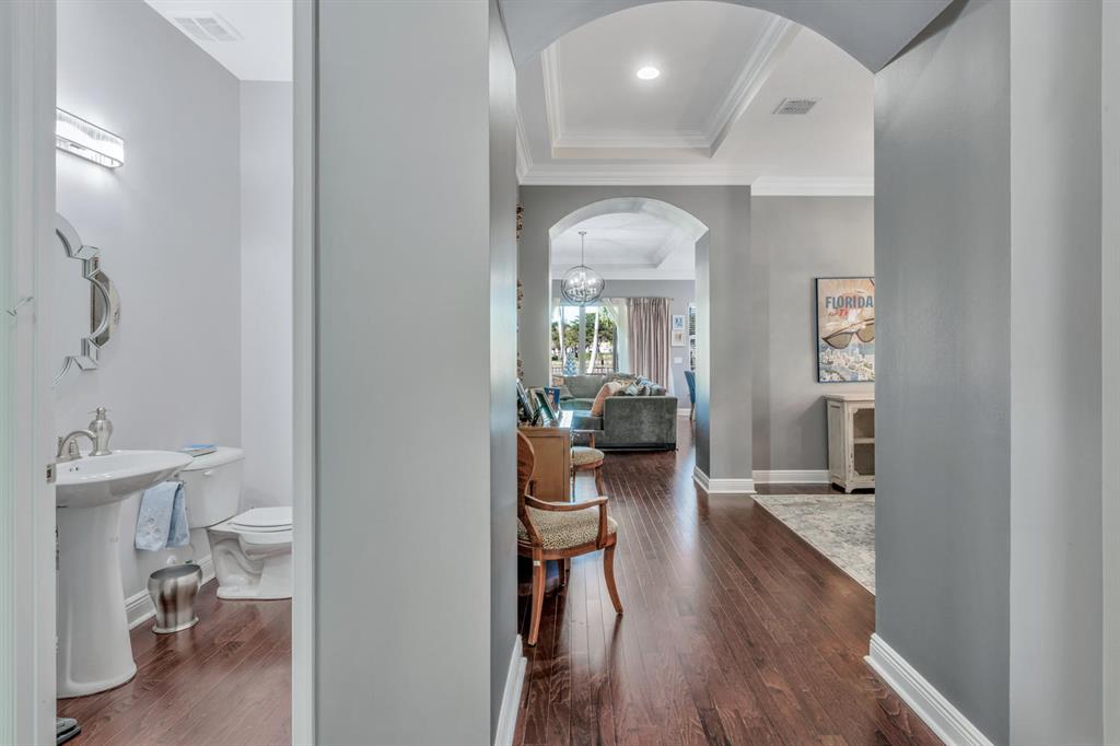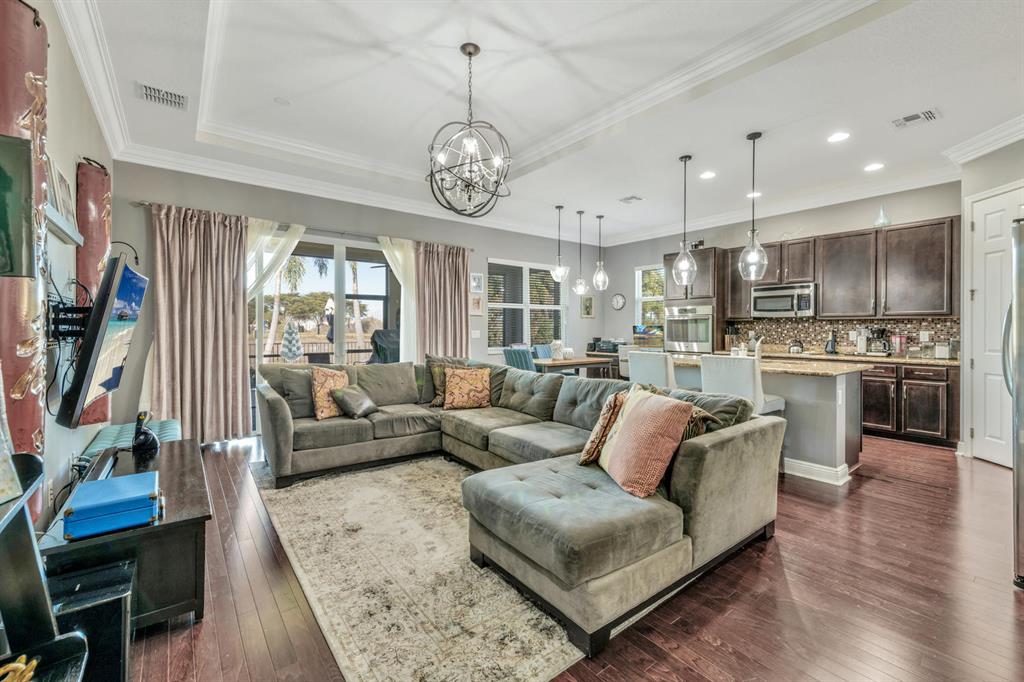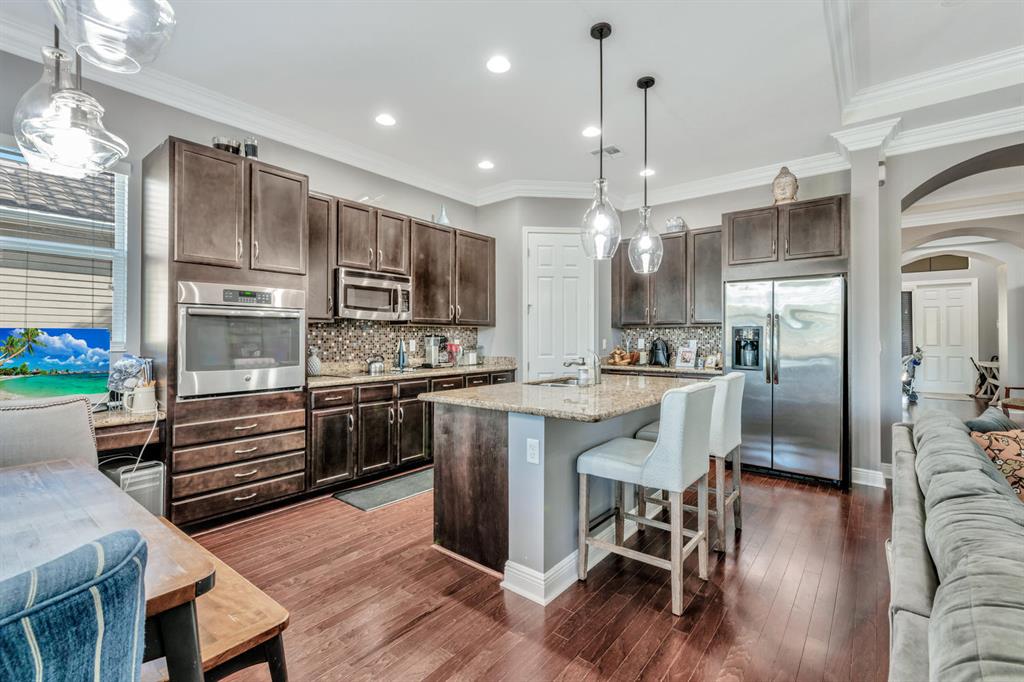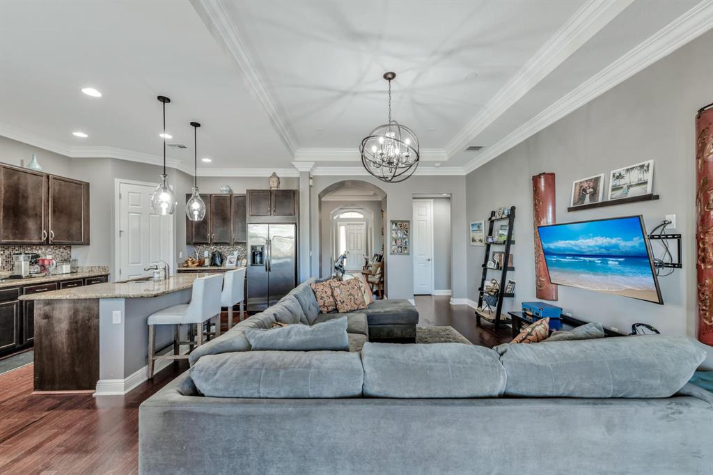 This beautifully updated home offers 2,287 square feet under air, 3 bedrooms, large office or den that could be used as a fourth bedroom, 2 1/2 bathrooms, and a 2-car garage. The kitchen is updated with new cabinetry, granite countertops, stainless steel appliances, upgraded lighting, and offers an oversized island perfect for entertaining and casual dining, along with a huge pantry! The home offers a wonderful open floorplan between kitchen and living spaces along with a screened porch and large patio overlooking the pond. The backyard is completely fenced. The current owners recently repainted the entire home, added crown molding throughout the home, replaced exterior lighting, installed a security system, and updated the flooring in the master suite with porcelain tile.