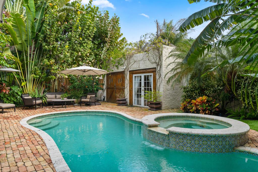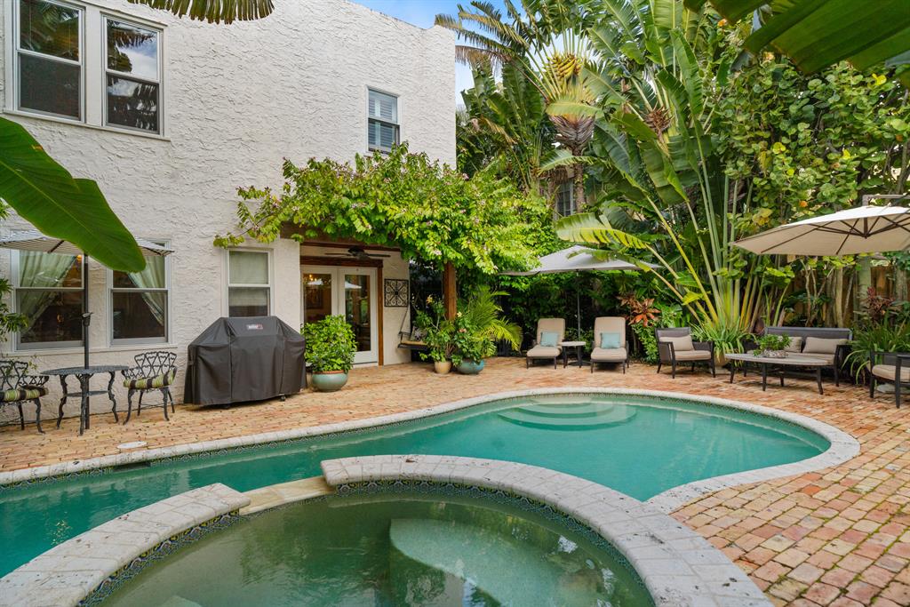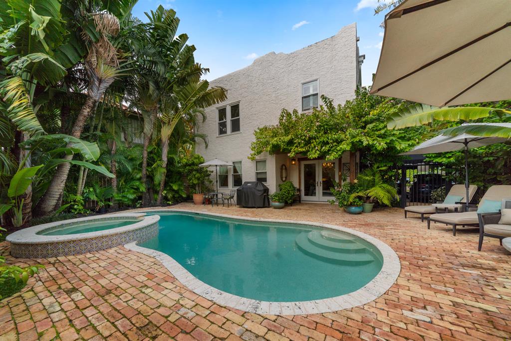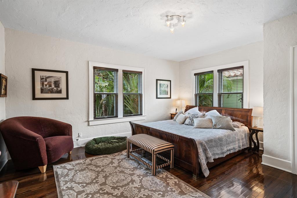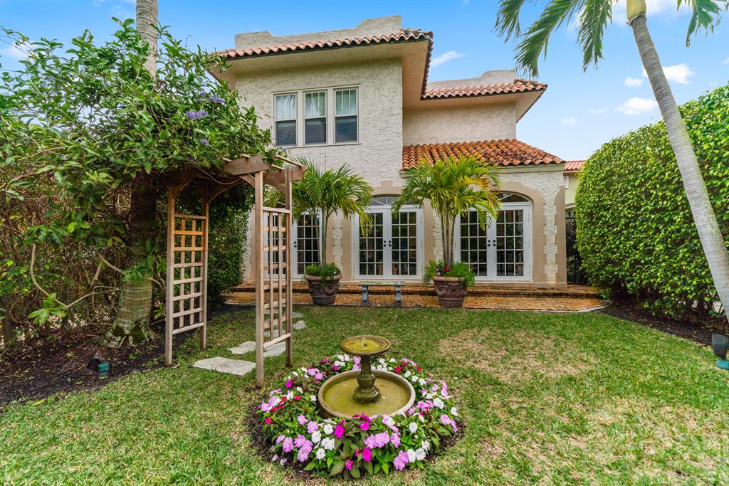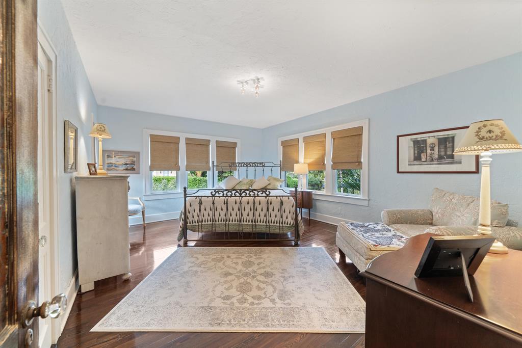 Stunning Mediterranean style home on the Intracostal block. The main house has 3 bedrooms and 2.5 baths with a separate 1 bedroom 1 bath guest house. This Contributing Belair Historic District home has beautiful architectural details arched doorways, fireplace, hardwood floors, high ceilings, beautiful wooded front door. Heated pool and spa that gets very good sunlight with lush mature landscaping. A large dog run at rear of property with Astroturf surrounding the deck. The property is in pristine condition with a large open living area and a beautiful entry room looking out to the hedged courtyard in front. There is a covered carport with a Chicago brick driveway entrance.