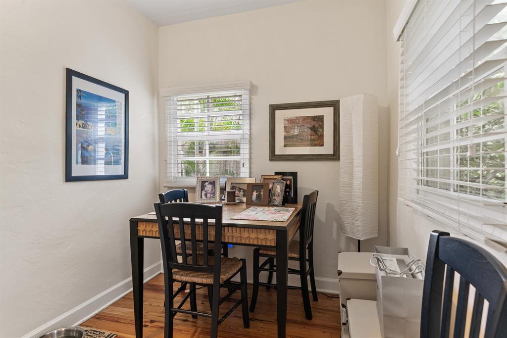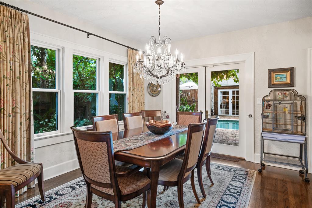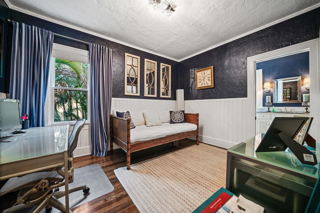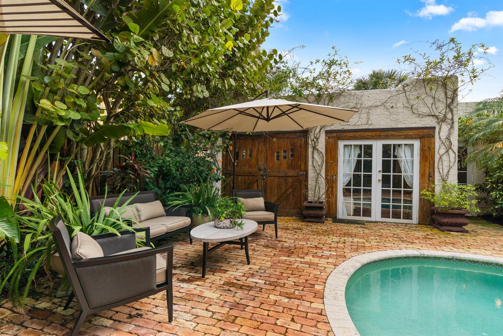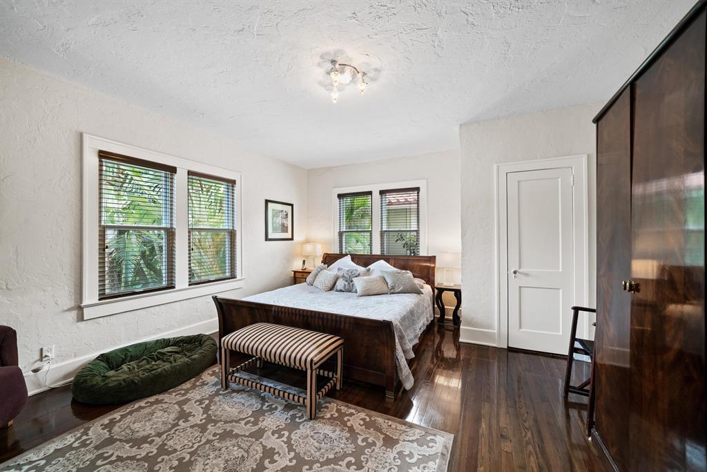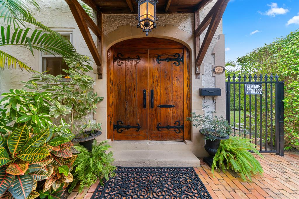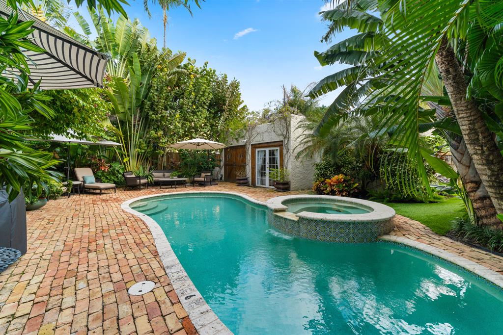 Stunning Mediterranean style home on the Intracostal block. The main house has 3 bedrooms and 2.5 baths with a separate 1 bedroom 1 bath guest house. This Contributing Belair Historic District home has beautiful architectural details arched doorways, fireplace, hardwood floors, high ceilings, beautiful wooded front door. Heated pool and spa that gets very good sunlight with lush mature landscaping. A large dog run at rear of property with Astroturf surrounding the deck. The property is in pristine condition with a large open living area and a beautiful entry room looking out to the hedged courtyard in front. There is a covered carport with a Chicago brick driveway entrance.