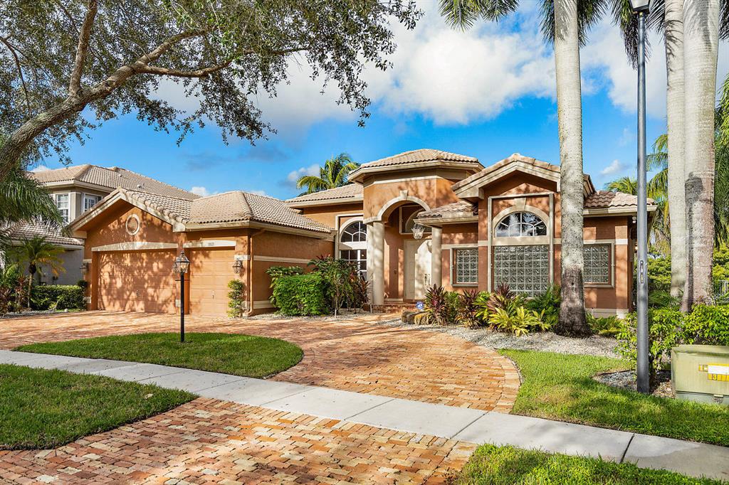 Sited in the elegant Saturnia, this one story Da Vinci model boasts 4 bedrooms, 3 full bathrooms, and a 3 car garage. Situated on an oversized lot, backing to the Natures Preserve offering a private oasis for entertaining. Relax by the heated pool and tropical landscaping with no rear neighbors. Features of this home include Chicago brick pavers, Accordion shutters, newer ACs, new interior paint, marble floors throughout, walk-in-closets, Dry Bar, split floor plan, wood cabinets, center island and granite counter tops in the kitchen. The community offers several amenities featuring a clubhouse, gym, tennis courts, and more. Enjoy proximity to A rated schools, shopping, restaurants, and parks.