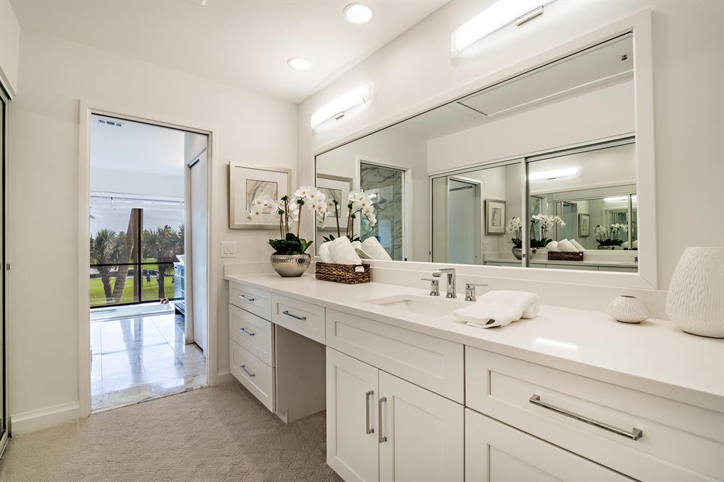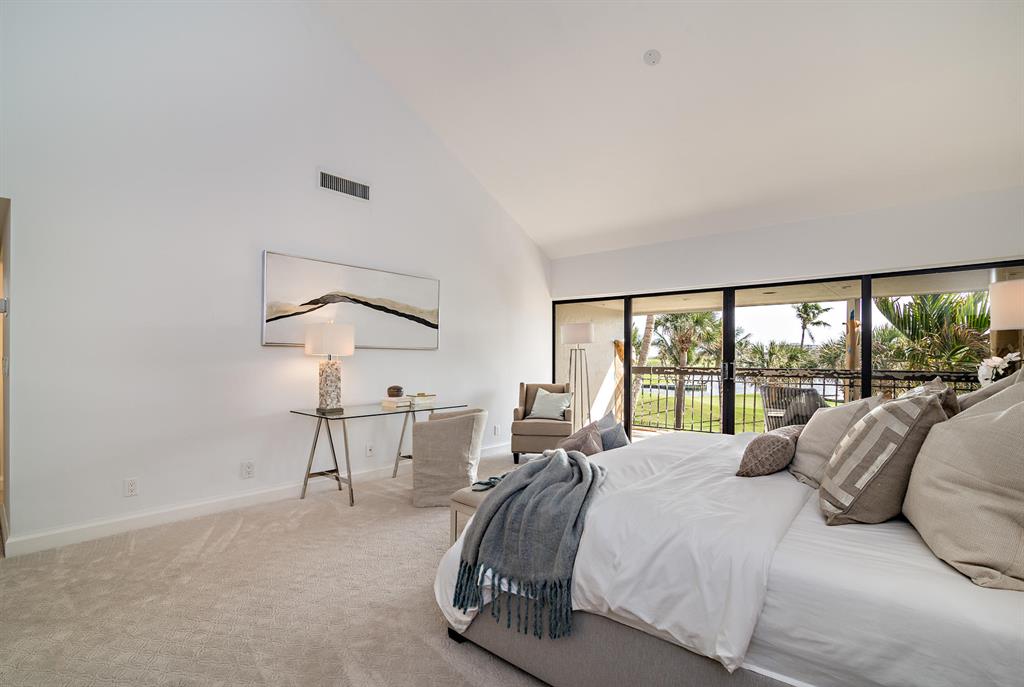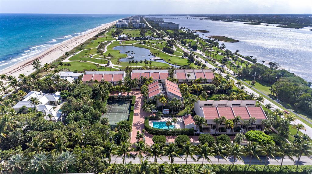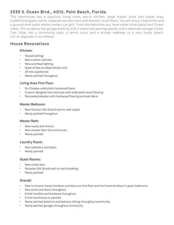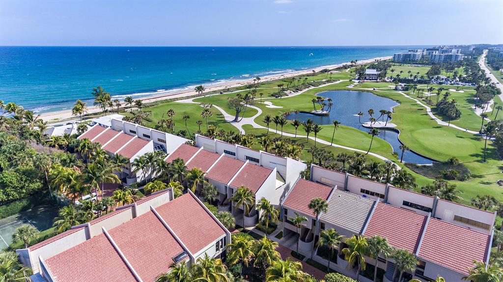 Direct Golf Course views as you enter this attractively renovated and carefully maintained townhouse at Tres Vidas as well as Intracoastal views from the balcony. There is a small patio with attractive landscaping on the ground level. A rare opportunity to purchase this large 3BR, 2.5BA townhouse featuring a spacious Living Room, eat in kitchen, large master suite and closet area and 2 additional guest bedrooms. Renovations include: new hardwood floors, redesigned staircase, renovated kitchen, upgraded baths and elevator. Two parking spaces in the garage below and a private storage area. Tres Vidas, has a community pool, a tennis court and a private walkway to a very lovely beach.