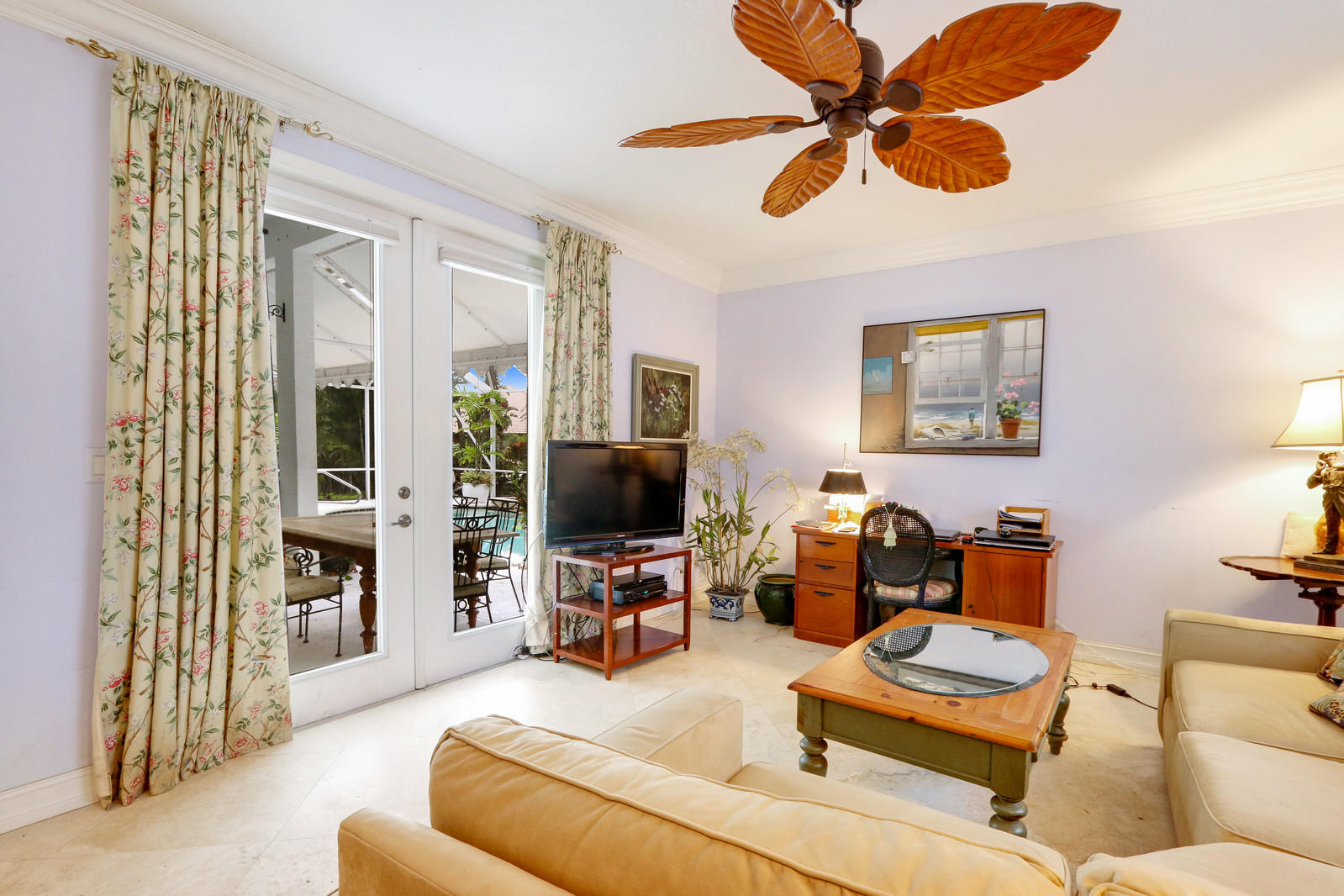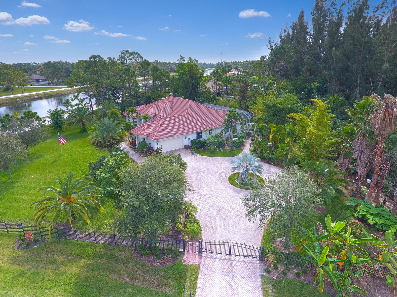 Quality built home on a beautifully landscaped 2.16 acre lot. Plantings include Canary Island Date Palms, Mango and Cocoa trees, rare Bamboo, Macadonia Nut and many others. Circular tumbled brick driveway. Recently remodeled Chef's gourmet kitchen features mahogany and marble counter tops, Miele burner range, Bosche dishwasher and subzero built in refrigerator. Grey, Black & natural wood cabinetry. The entire home has 24'' travertine top grade, diagonal marble. On suite bedroom offers an 18ft double shower, separate water closet with bidet, double vanity and tub. Front entrance features marble floor and custom designed hand wrought chandelier. Total home generator. Pool has built in pet safety ledge and sheet water fall. Many more extras to mention.