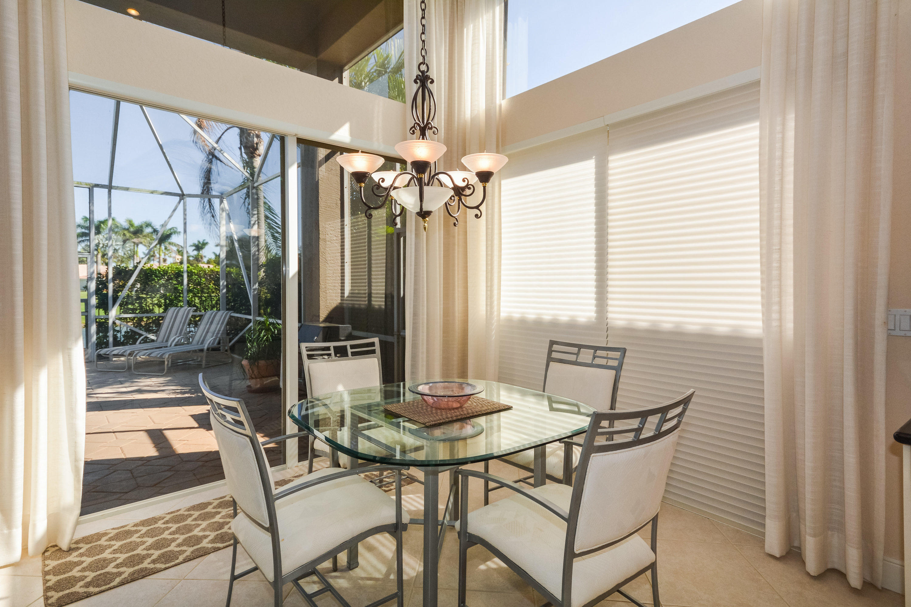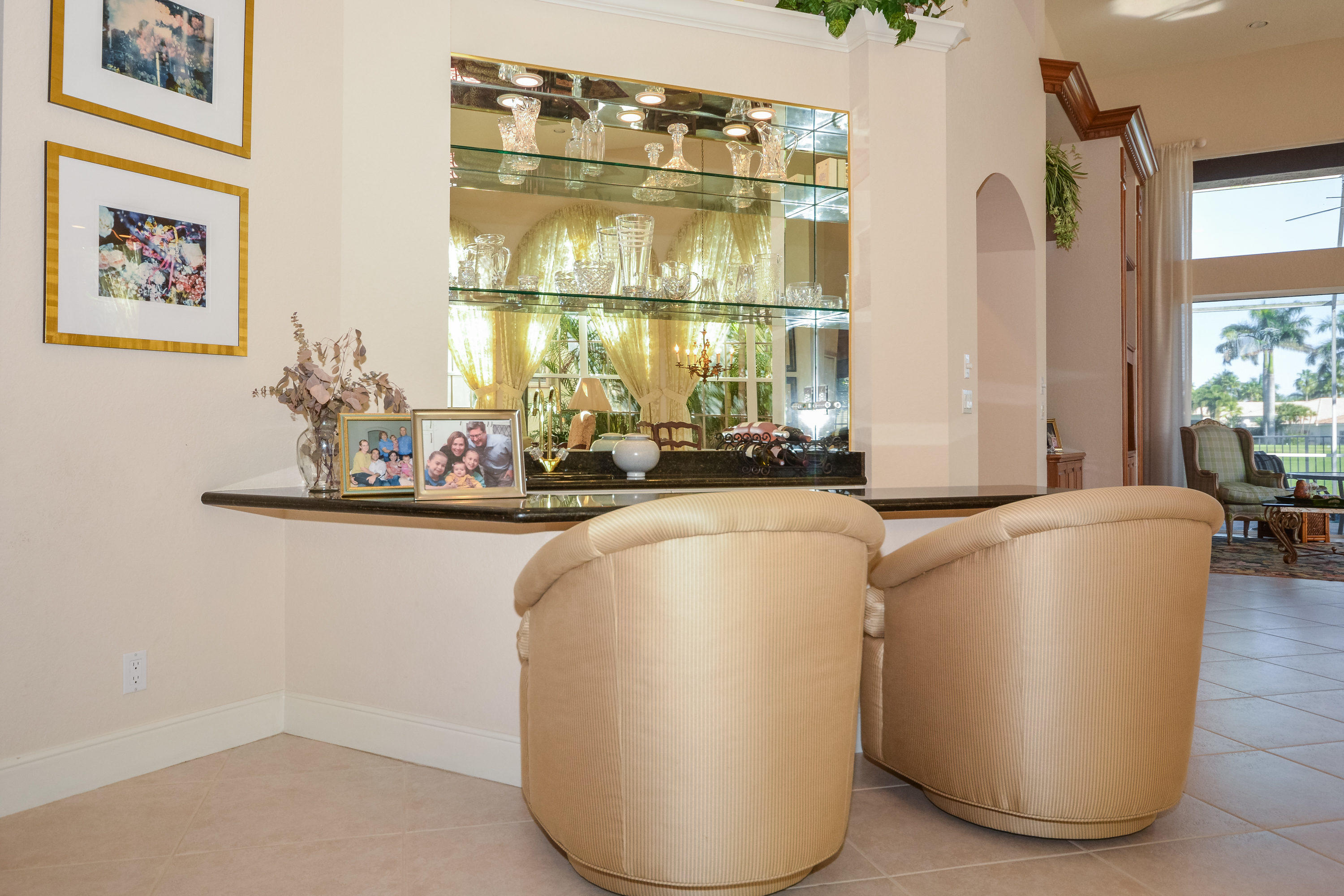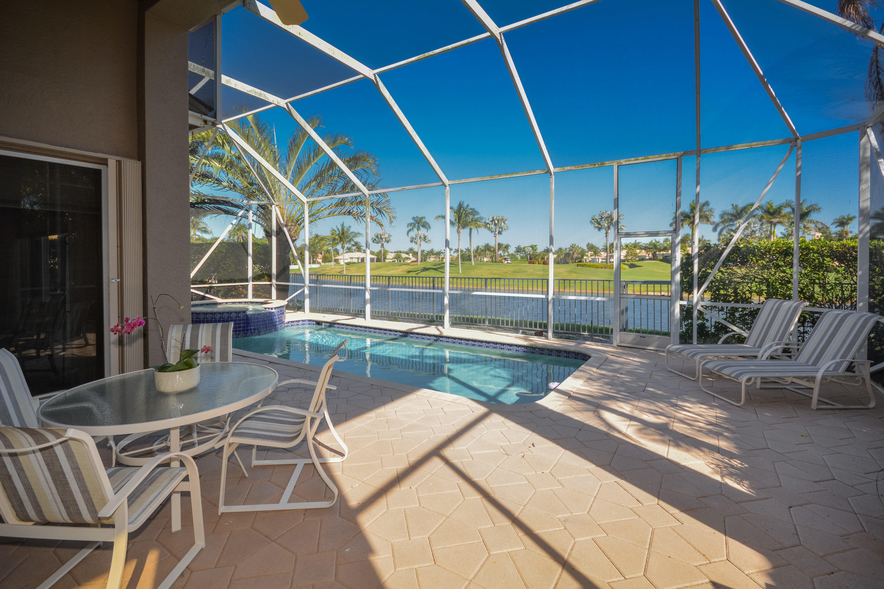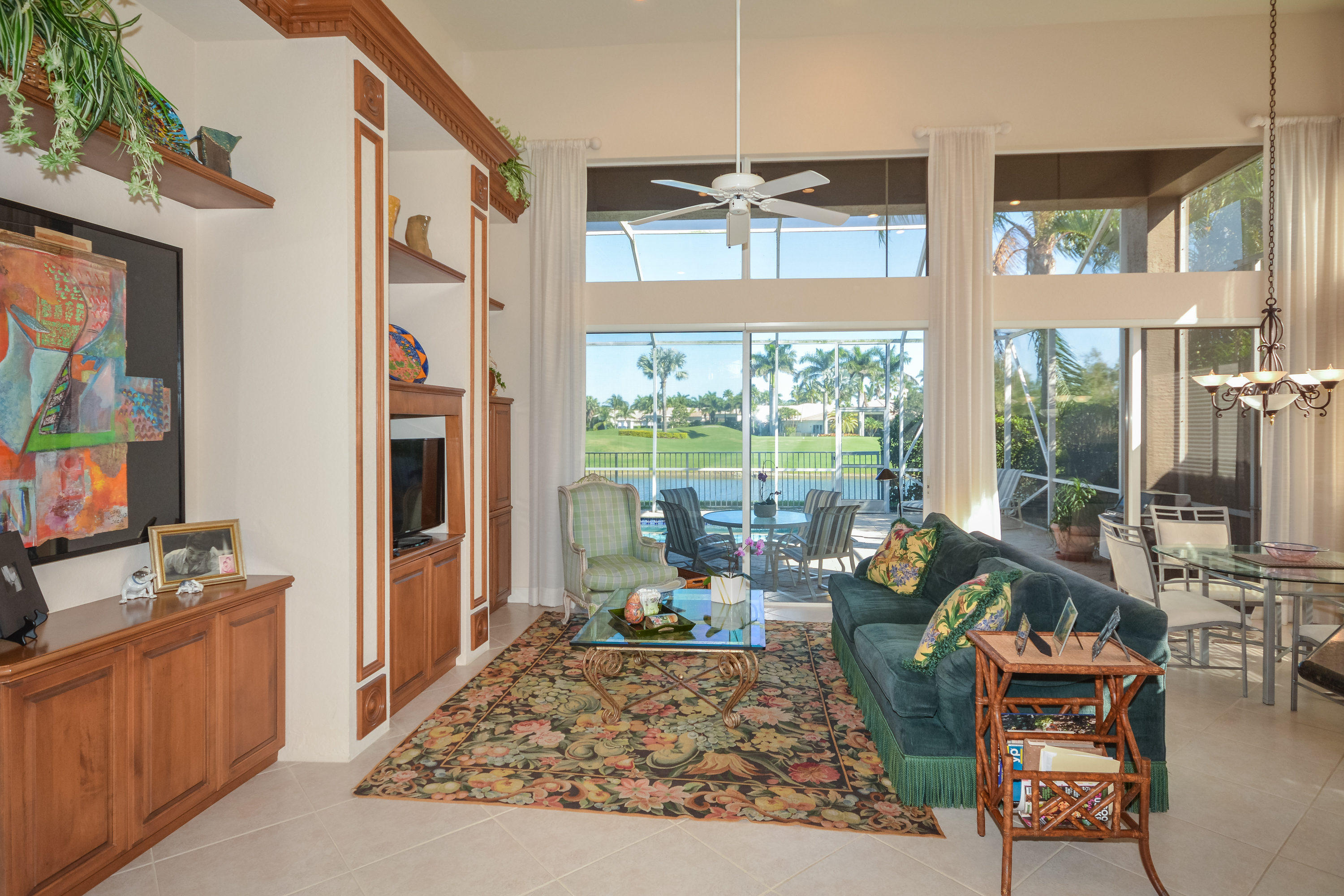 Spectacular lake and golf views from this one-story home. Immaculate 3 bedroom, 3 bath residence with volume ceilings and a spacious open plan. Tile floors in the main living areas and carpet in the bedrooms. Accordion hurricane shutters. Charming wet bar with granite counter & glass shelves. Breathtaking views from the lovely screened-in patio with pool & spa. 2 zone A/C replaced in summer 2014. *Dining room fixture is excluded