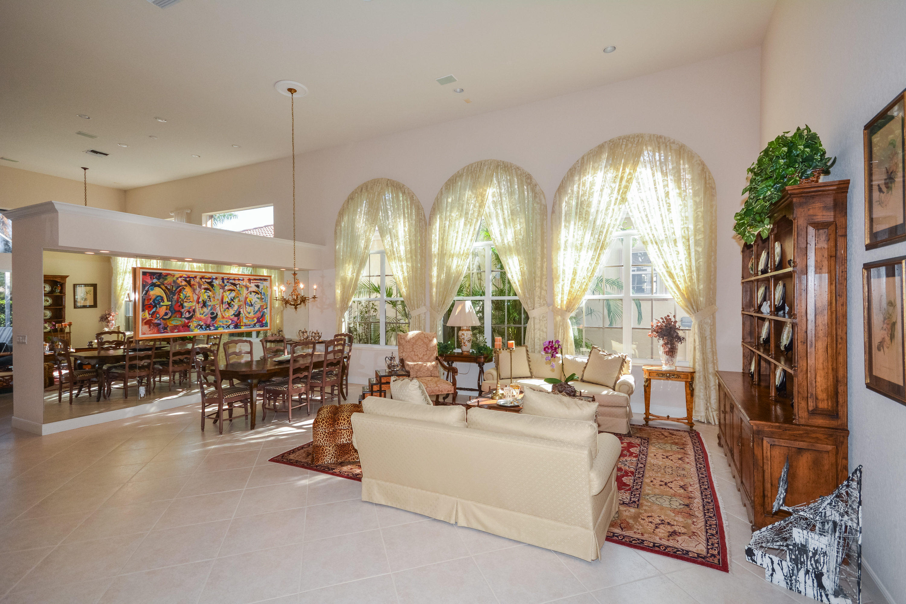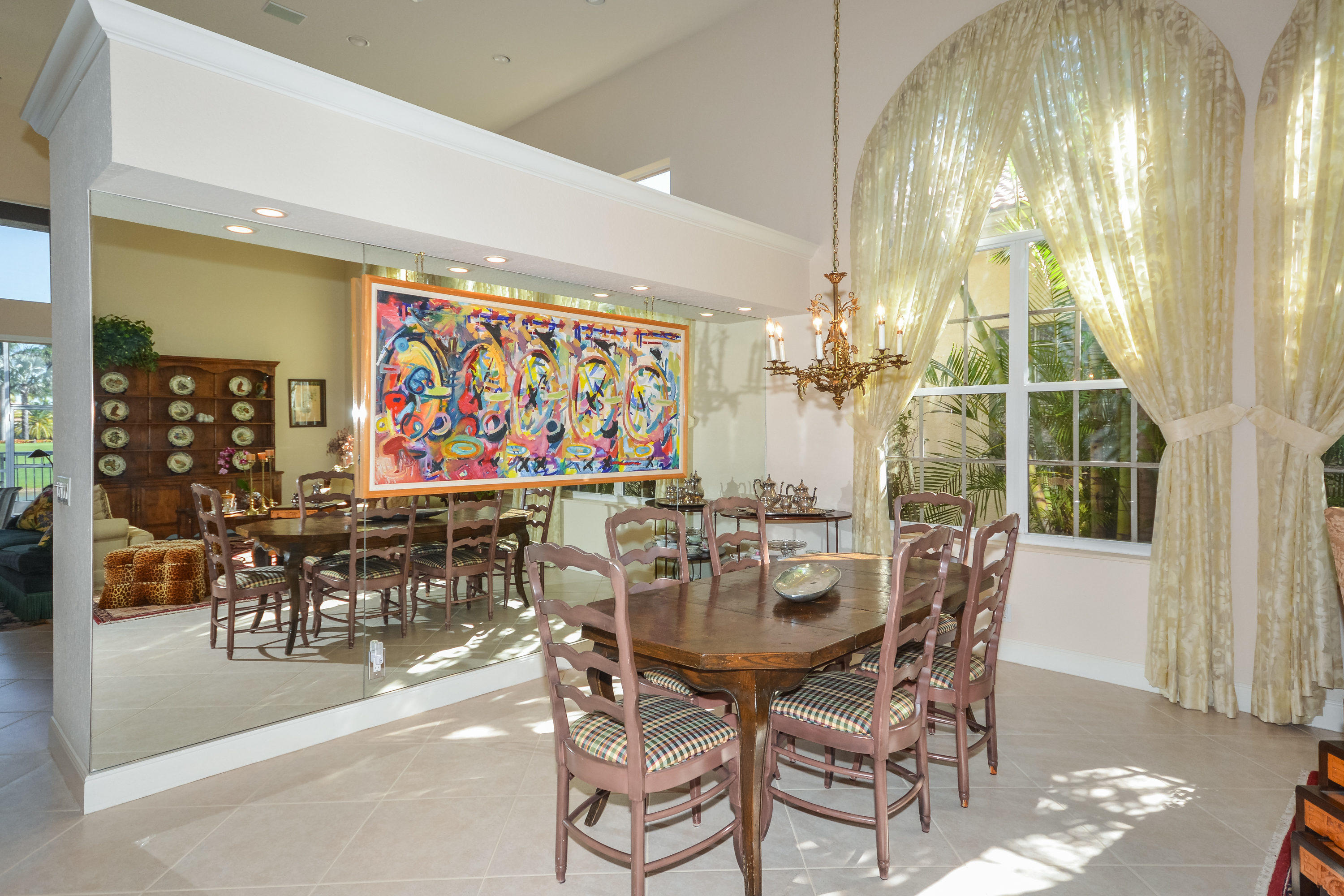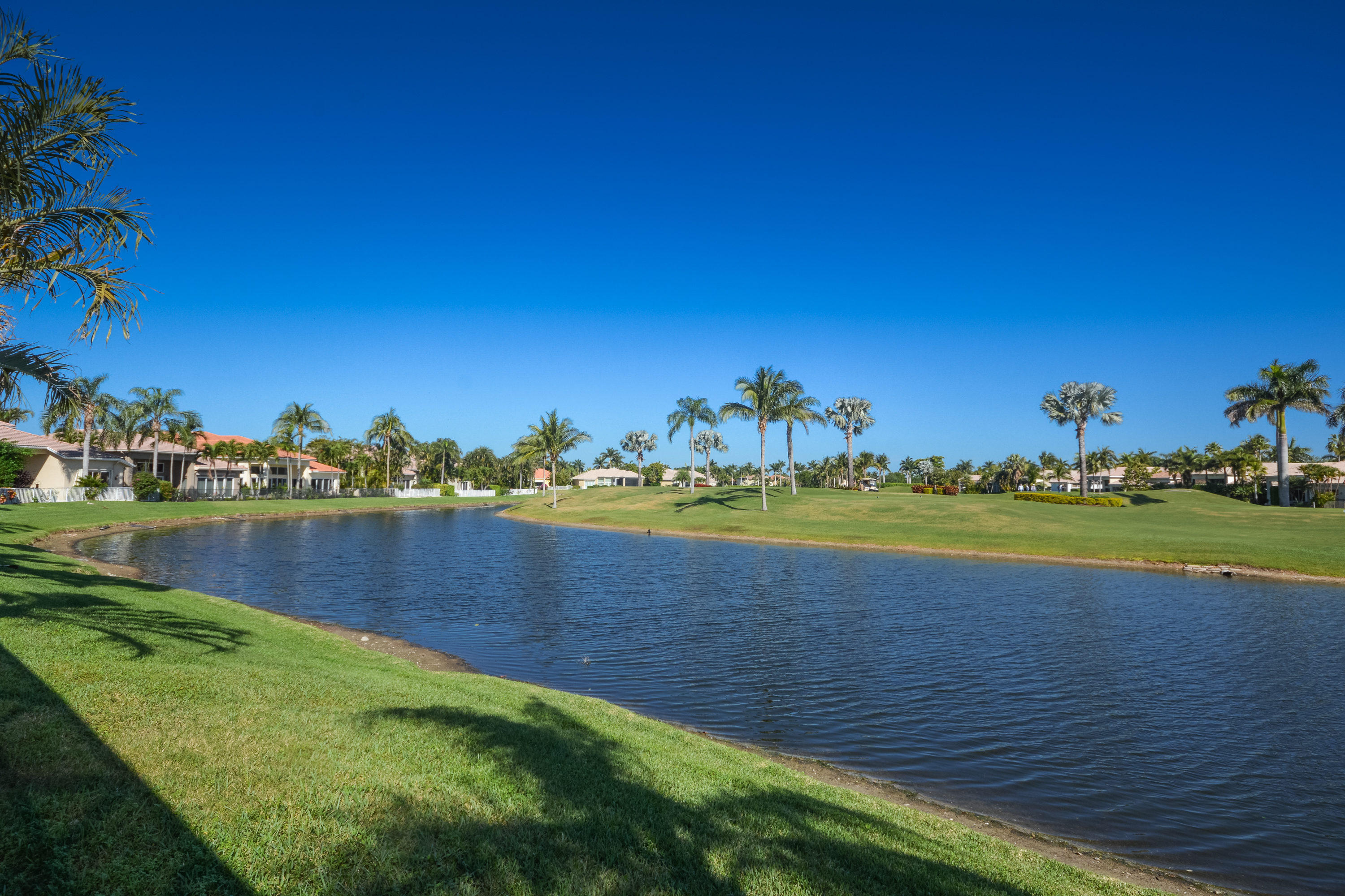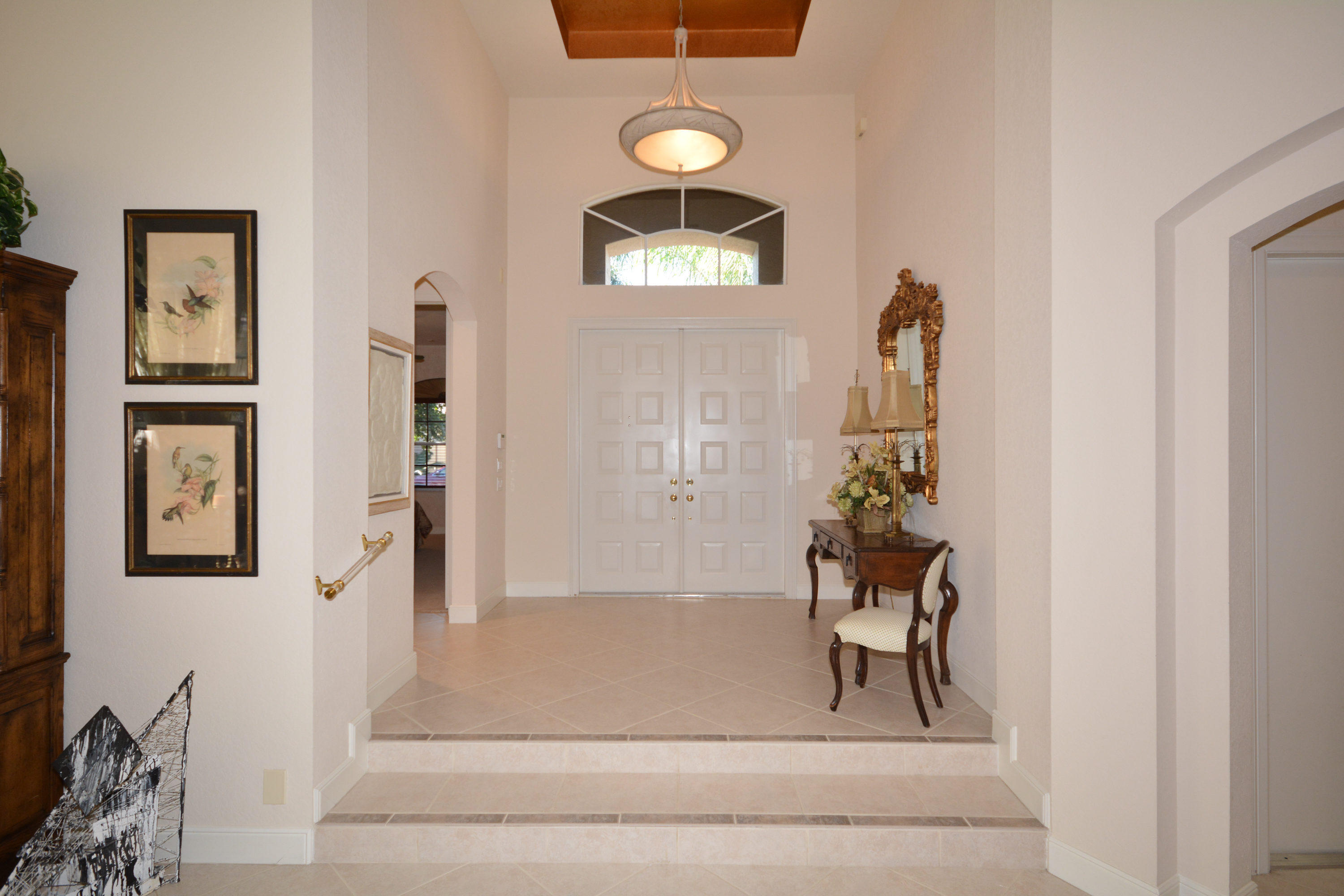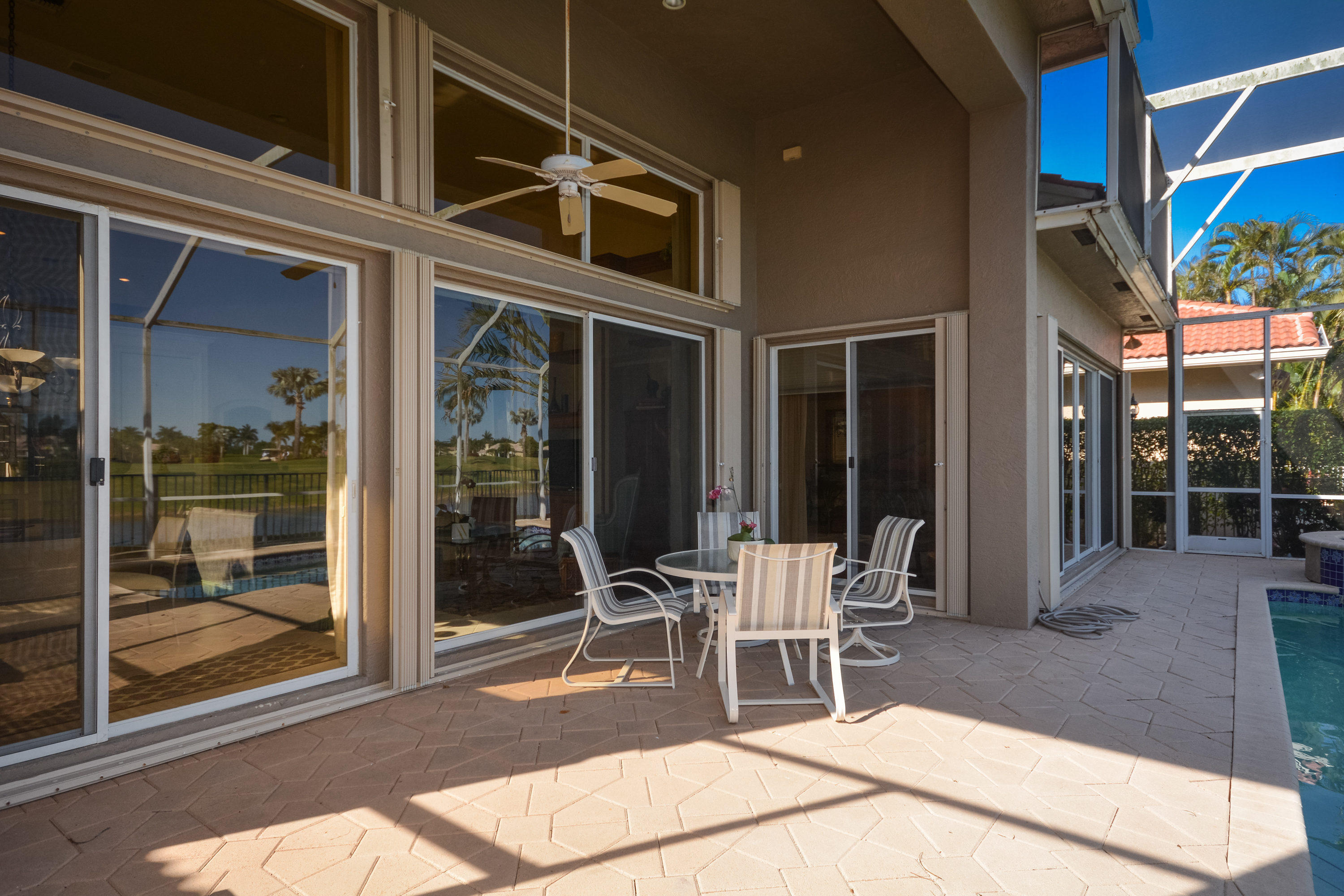 Spectacular lake and golf views from this one-story home. Immaculate 3 bedroom, 3 bath residence with volume ceilings and a spacious open plan. Tile floors in the main living areas and carpet in the bedrooms. Accordion hurricane shutters. Charming wet bar with granite counter & glass shelves. Breathtaking views from the lovely screened-in patio with pool & spa. 2 zone A/C replaced in summer 2014. *Dining room fixture is excluded