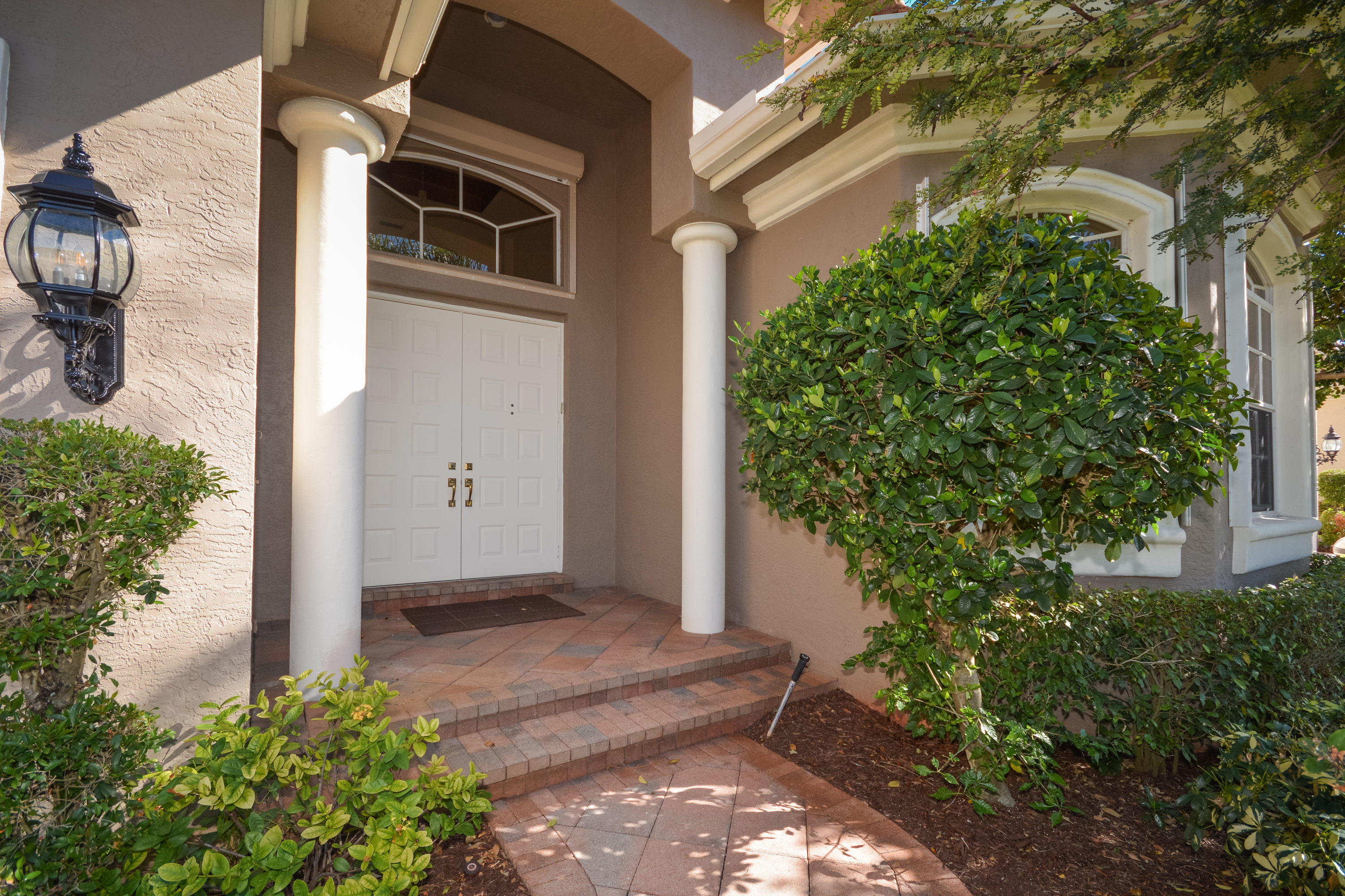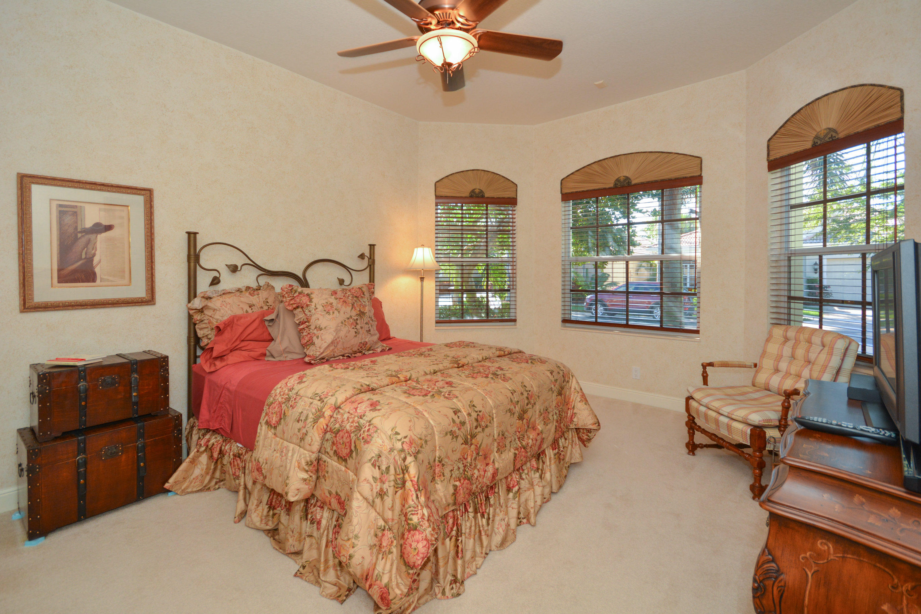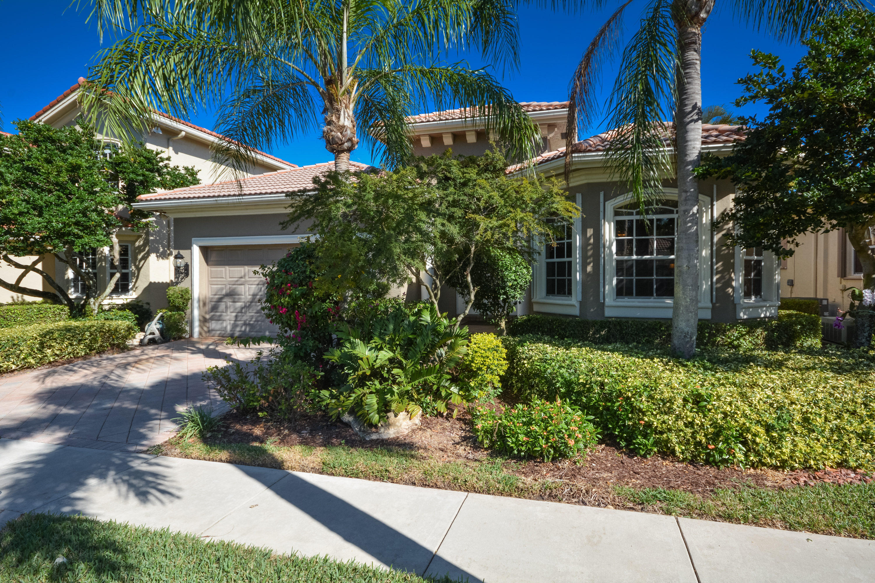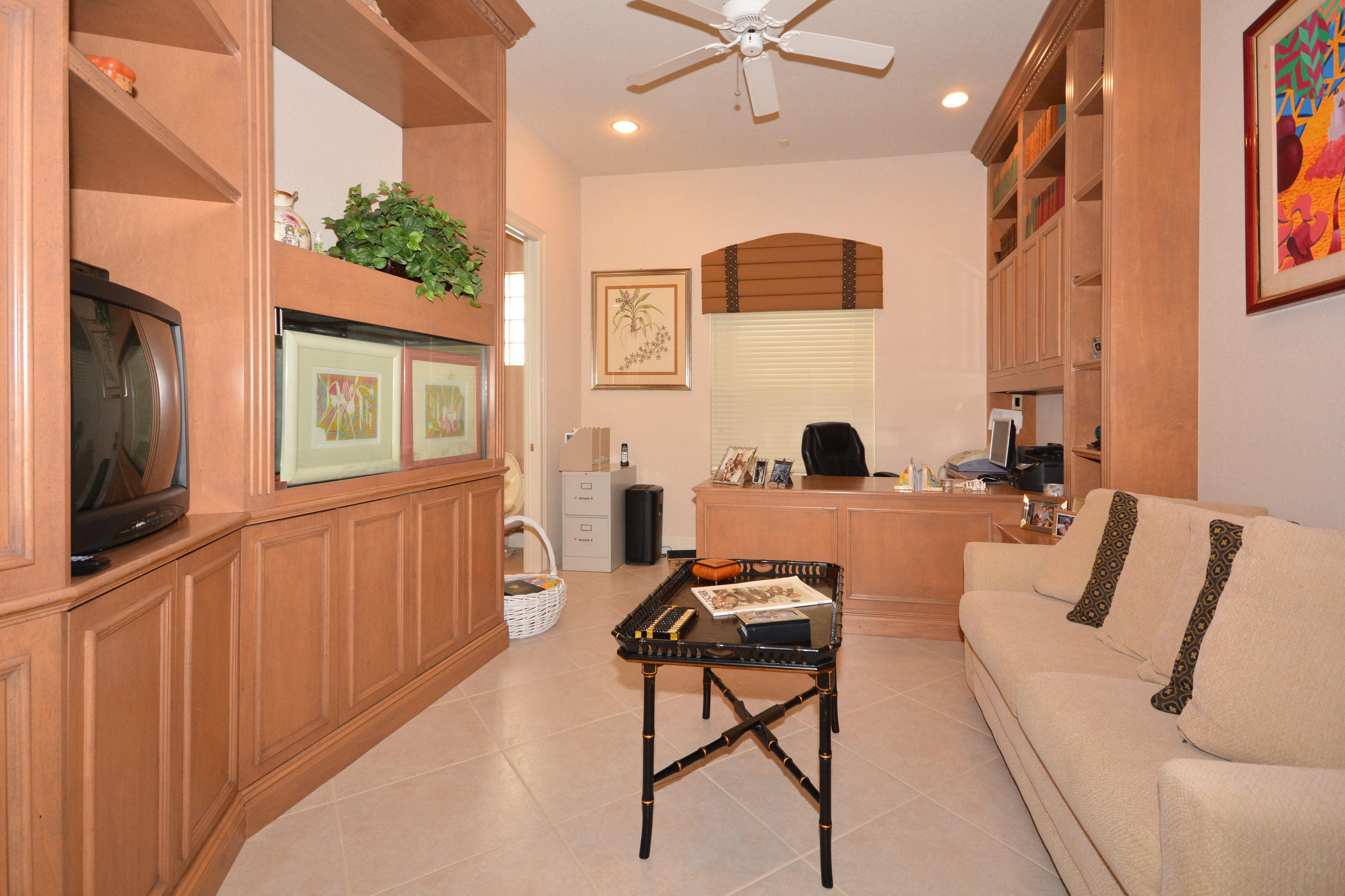 Spectacular lake and golf views from this one-story home. Immaculate 3 bedroom, 3 bath residence with volume ceilings and a spacious open plan. Tile floors in the main living areas and carpet in the bedrooms. Accordion hurricane shutters. Charming wet bar with granite counter & glass shelves. Breathtaking views from the lovely screened-in patio with pool & spa. 2 zone A/C replaced in summer 2014. *Dining room fixture is excluded