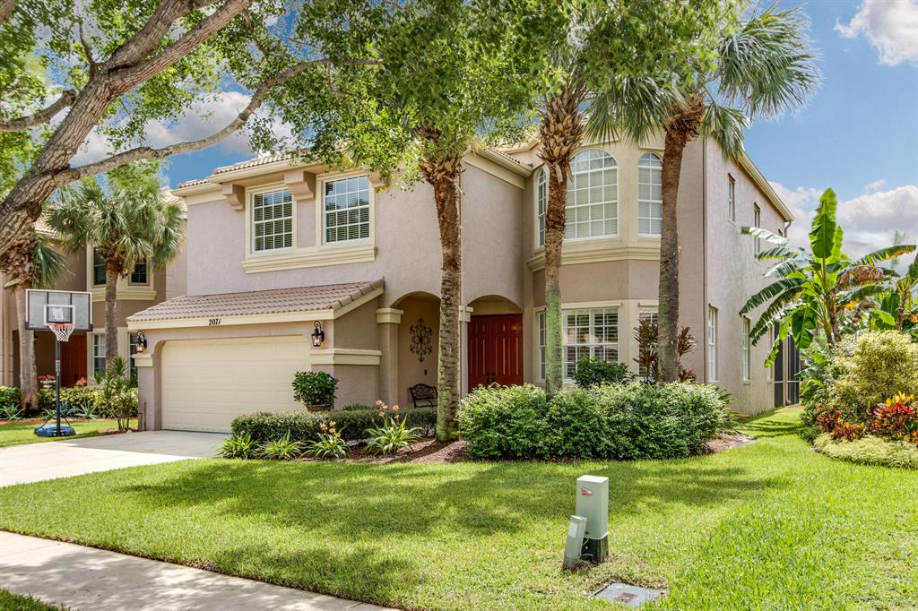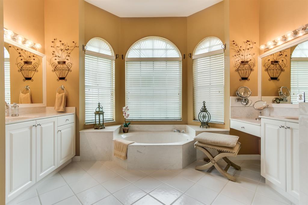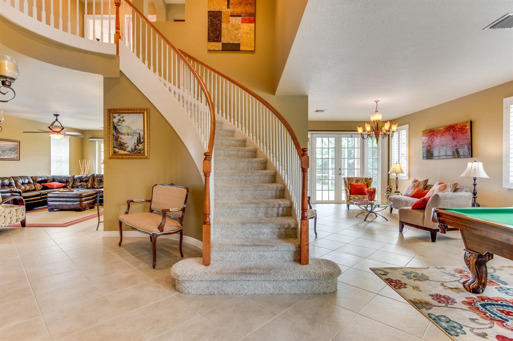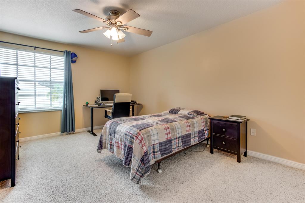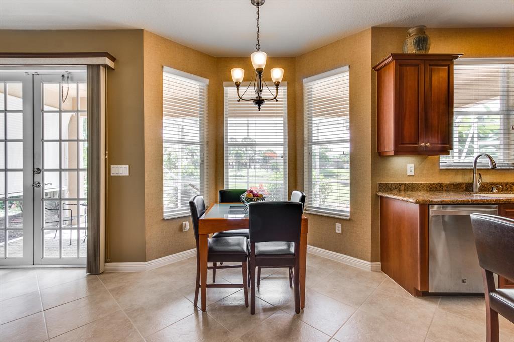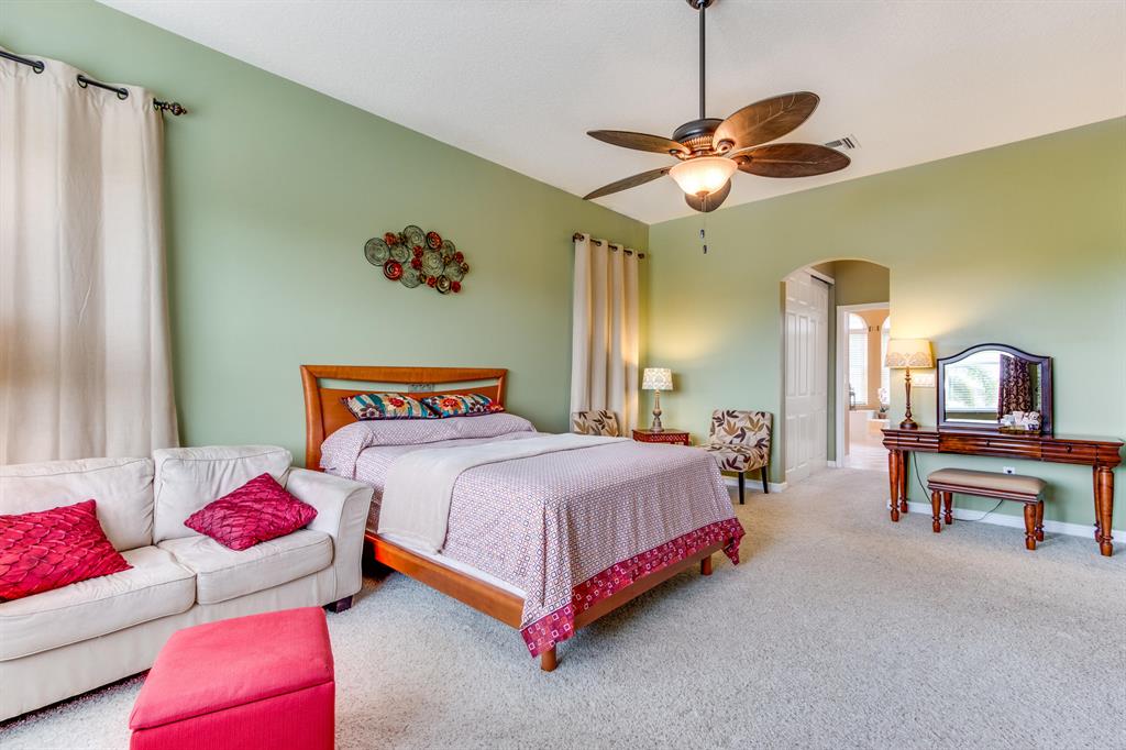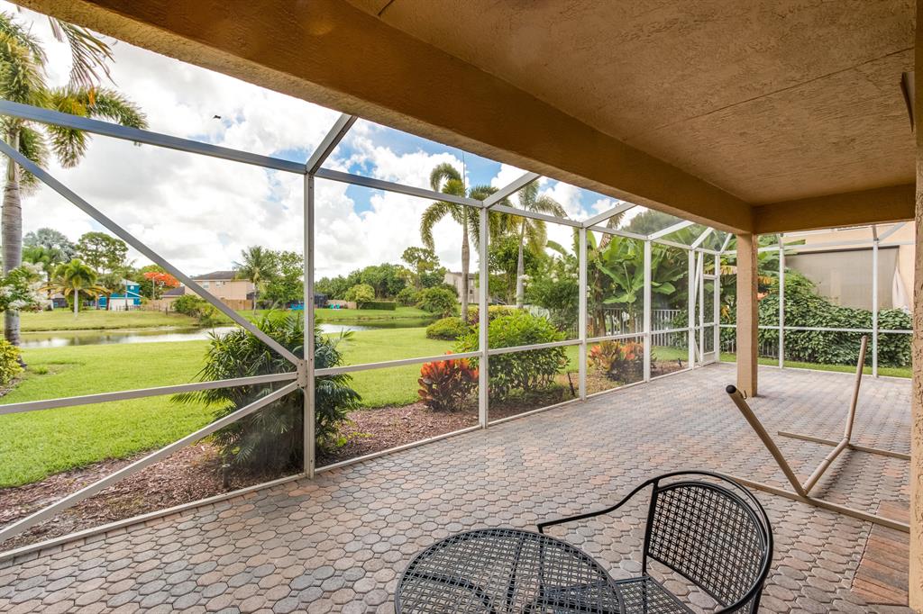 MOTIVATED SELLER! Amazing 5 bed, 2.1 bath waterfront home with 2 car garage in the gated community Fairfax at Madison Green. Eye catching curb appeal including lush landscaping & covered double door entry welcome you inside where you will be wowed by the spacious layout & stunning architectural details as you enter the grand foyer. Neutral oversized tile on the diagonal continues throughout downstairs. The formal living room has plantation shutters & is open to the dining room which is elegant with French doors that lead out to a screened, covered patio & provide panoramic lake views! The chef's dream kitchen features granite counters & island with barstool seating, upgraded cabinets with crown molding & under cabinet lighting, NEW stainless steel appliances, walk-in pantry, &, breakfast