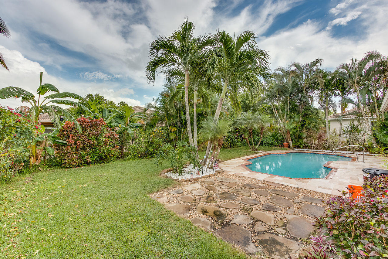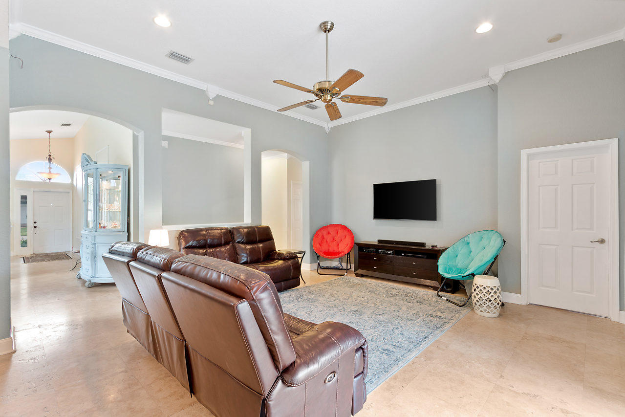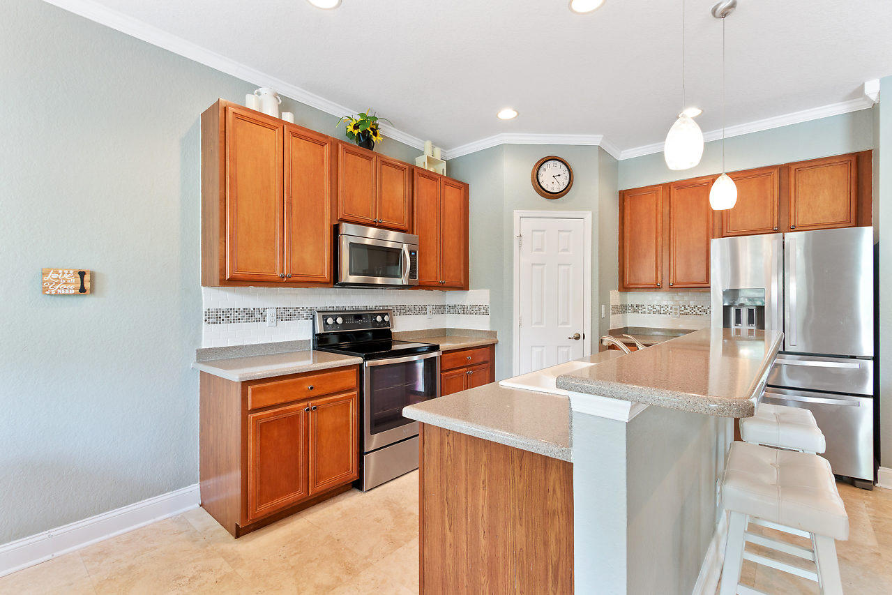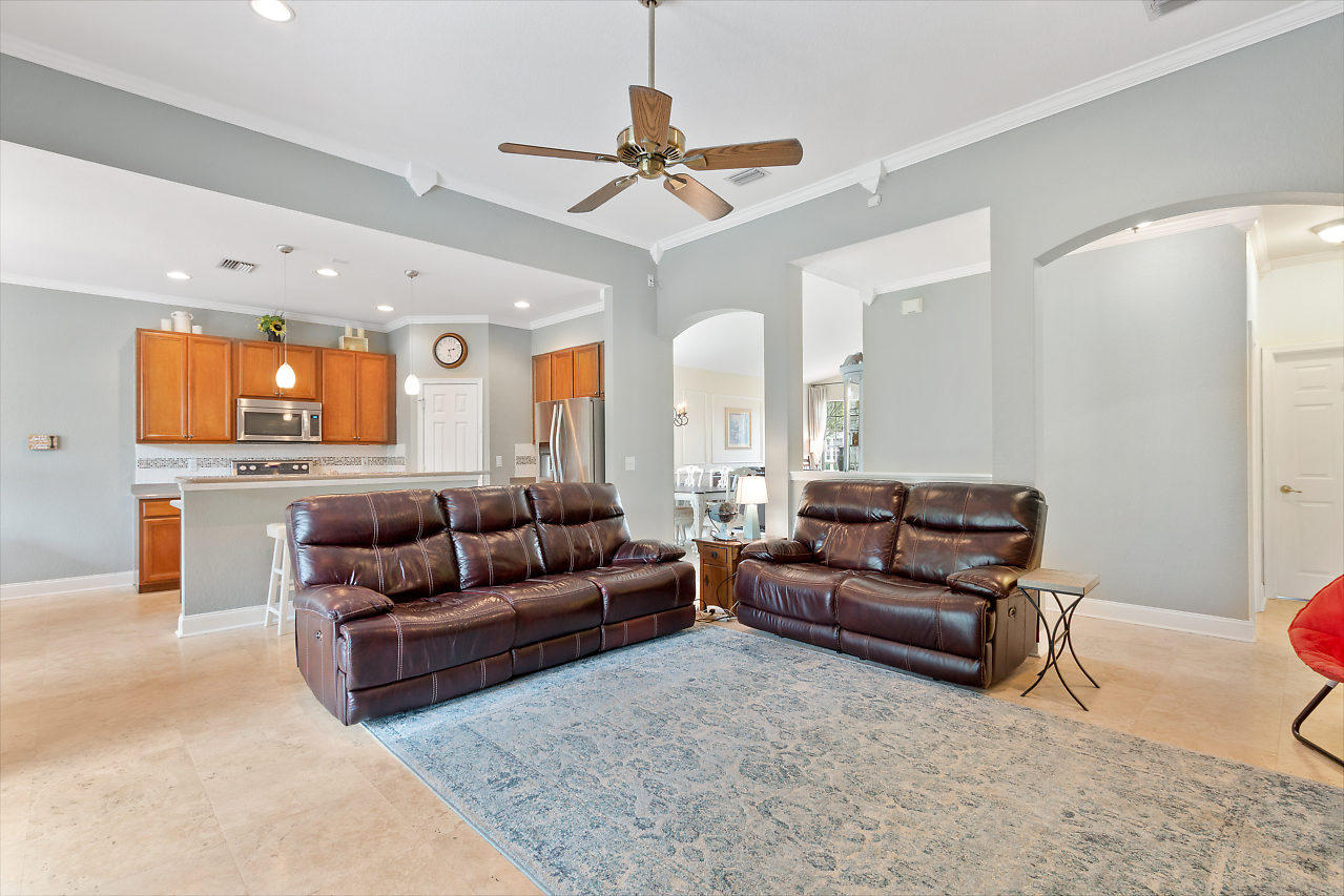 BEAUTIFUL! 3 bed plus den, 2 bath POOL home with 2 car garage & large fenced in yard in the highly desirable gated community Stonehaven! Eye catching curb appeal welcomes you insides where you will be impressed by the spacious layout & upgraded travertine flooring that accentuates the open-flowing floor plan. Beyond the elegant formal living & dining rooms is a chef's dream kitchen featuring newer stainless steel appliances, 42'' cabinets with pull out shelves, large pantry, & breakfast area overlooking the pool. The upgraded kitchen is open to the family room which is bright with natural light from sliders that lead out to a covered patio & provide beautiful views of the pool! The crown molding is another stunning detail! The master suite offers upgraded flooring,