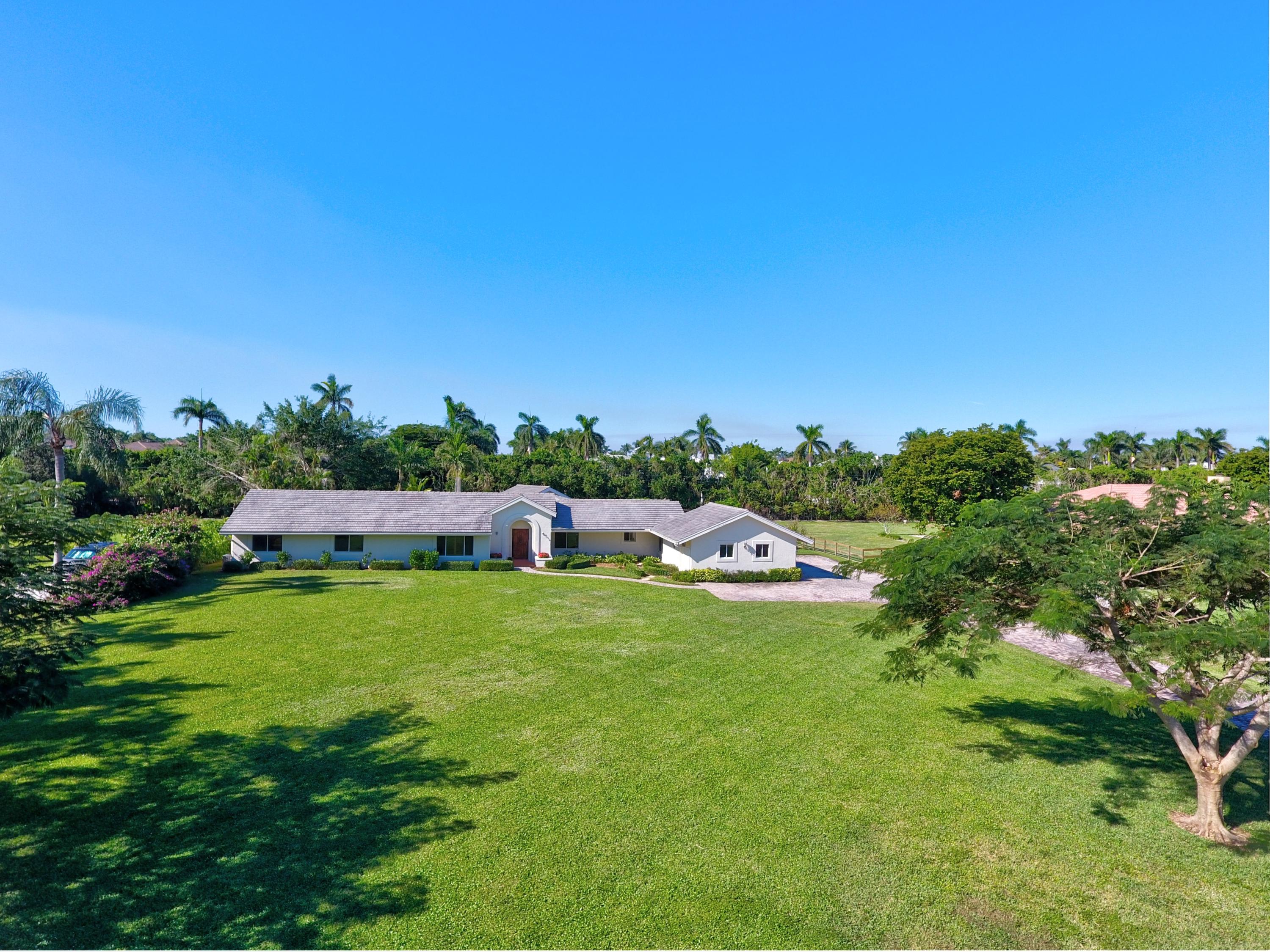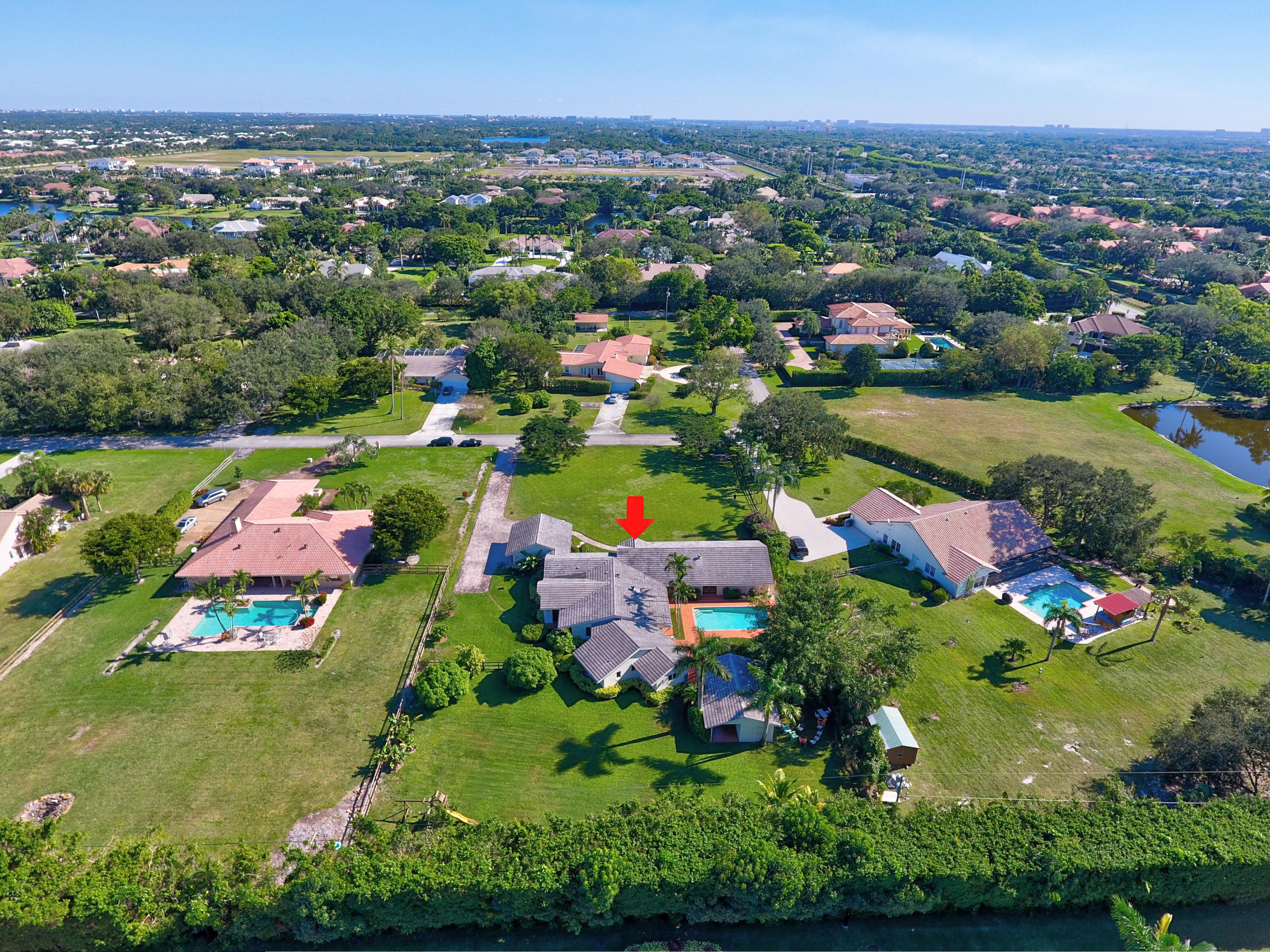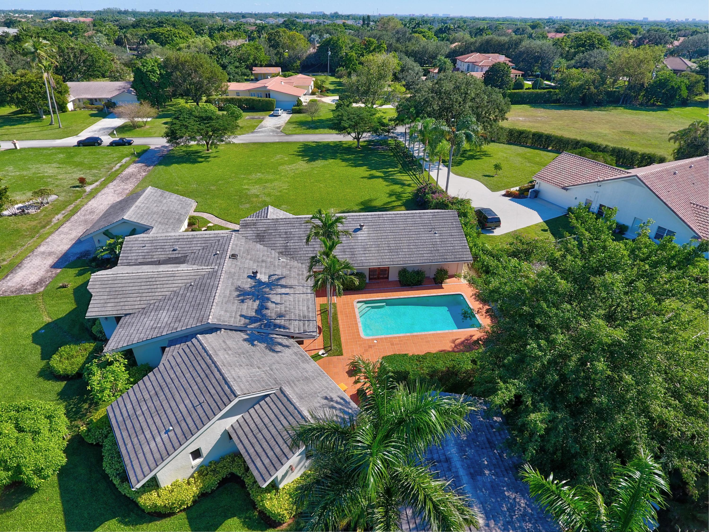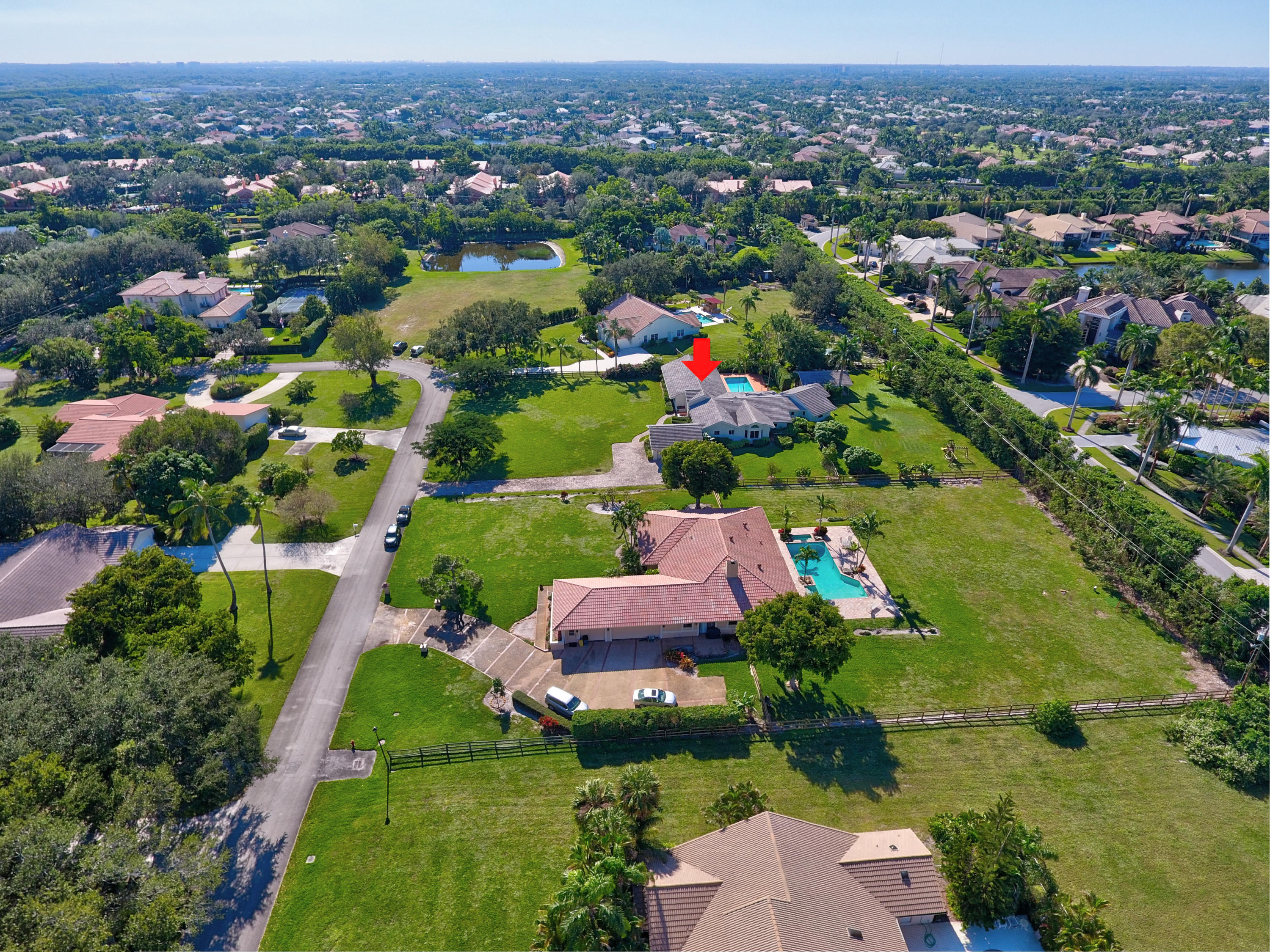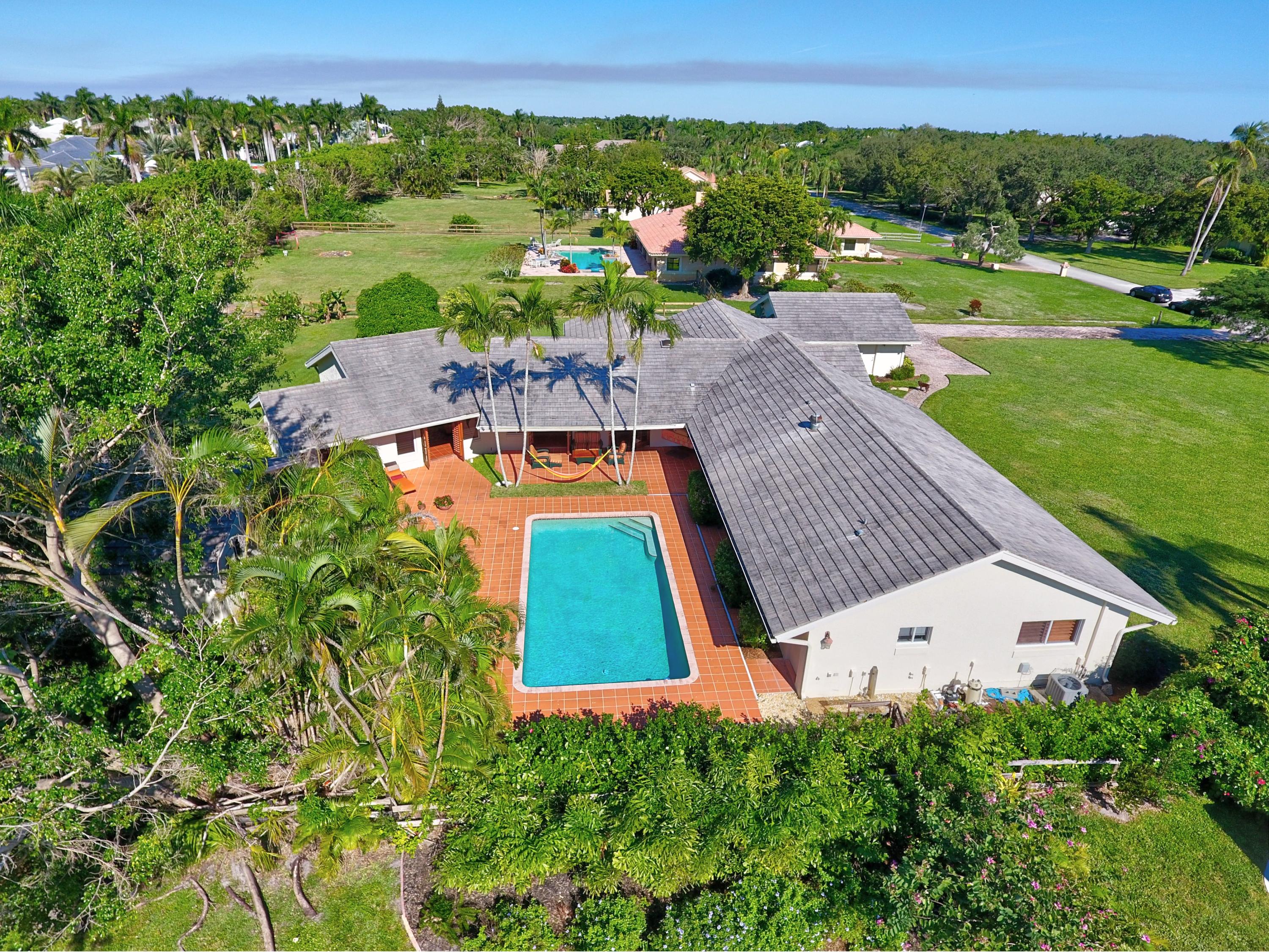 This rare 1 story 5 bdrm, 31/2 bth (plus office) home sits on over 1 acre of stunning greenery. The oversized kitchen features 2 islands, a generous amount of cabinetry, gourmet appliances & a wine refrigerator. This home offers a split bedroom plan with the master bedroom & office on one side & the auxiliary bedrooms each with a large walk in closet on the other side. Extra features include plantation shutters & crown molding throughout, central vacuum, a large laundry room & hurricane panels for the windows. French doors, along the back of the home, open to the very sunny pool which is south facing. There is an abundance of covered & uncovered outdoor patio for eating vignettes all around the pool. Adjacent to the pool is a smaller structure which can be used for a gym, office or storage