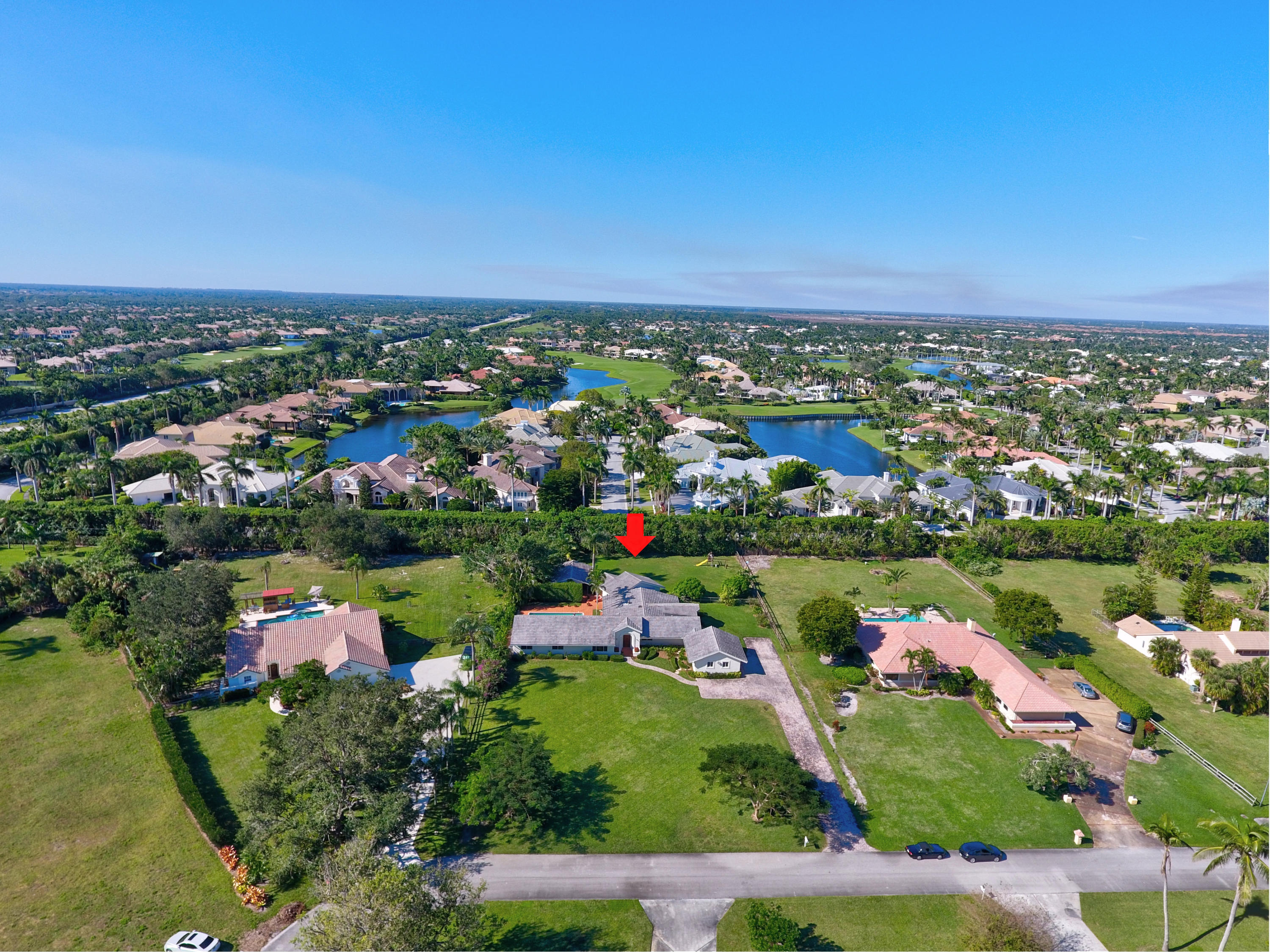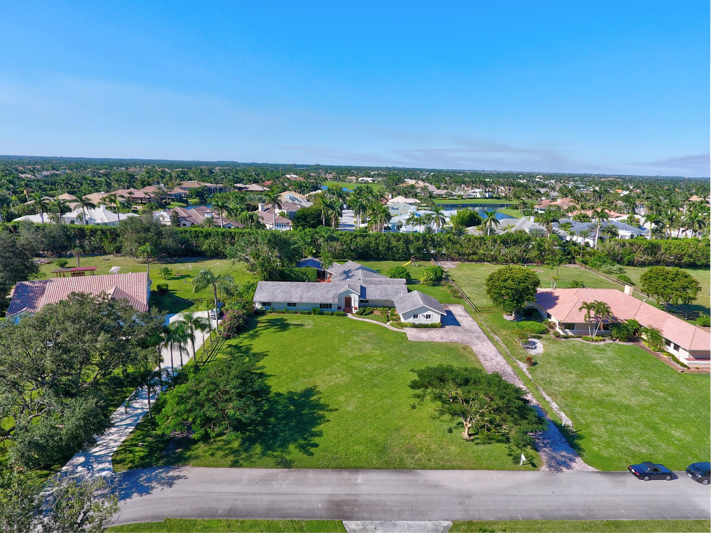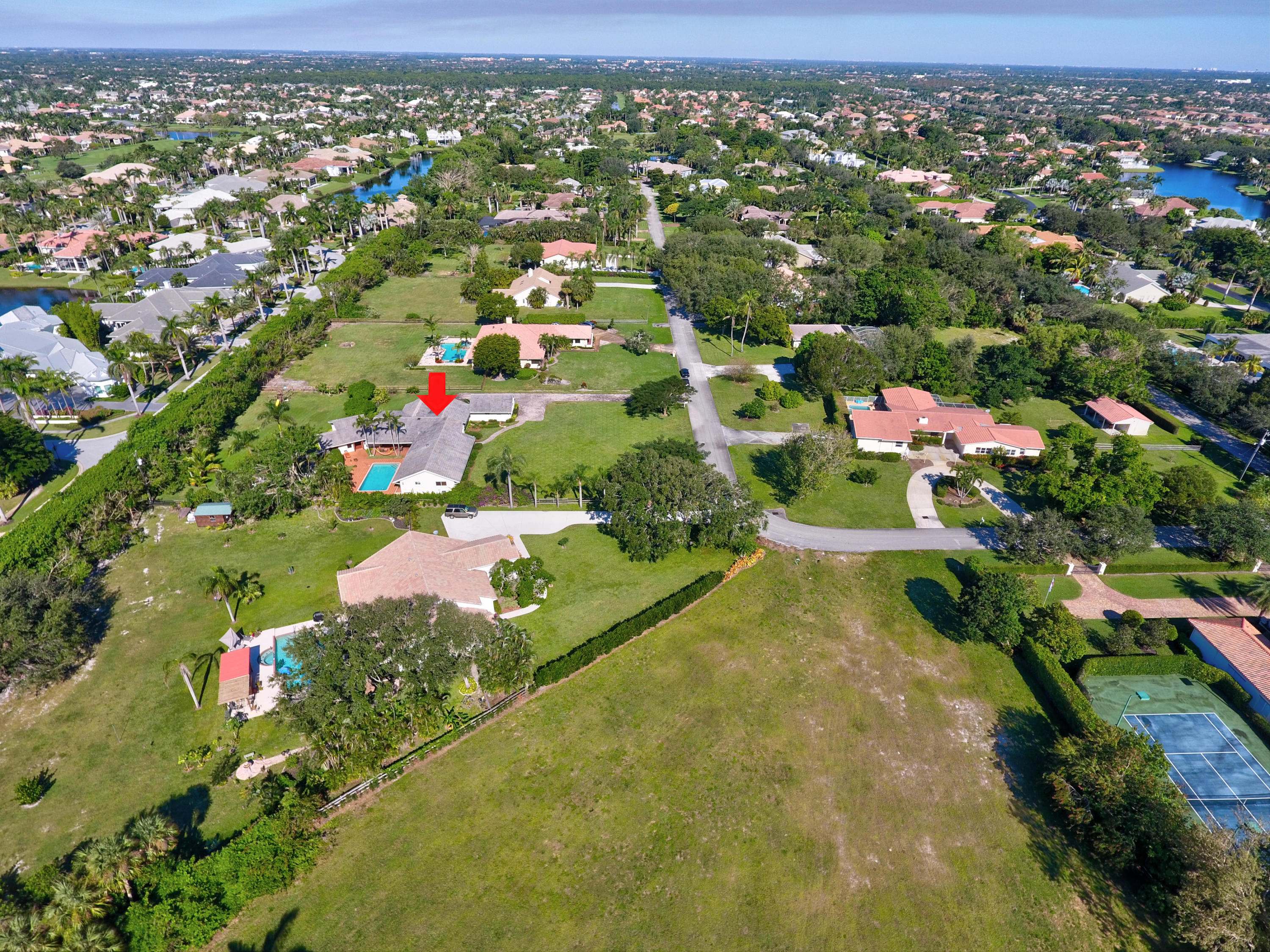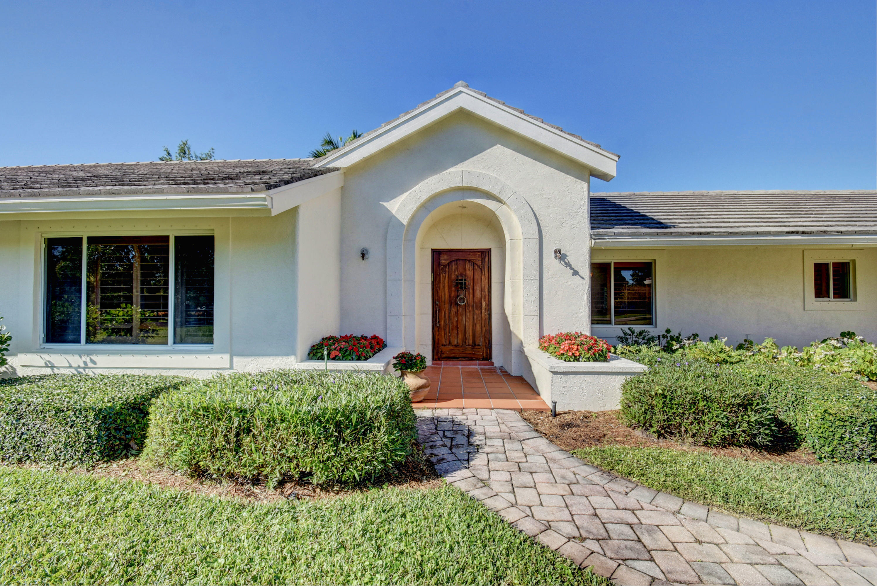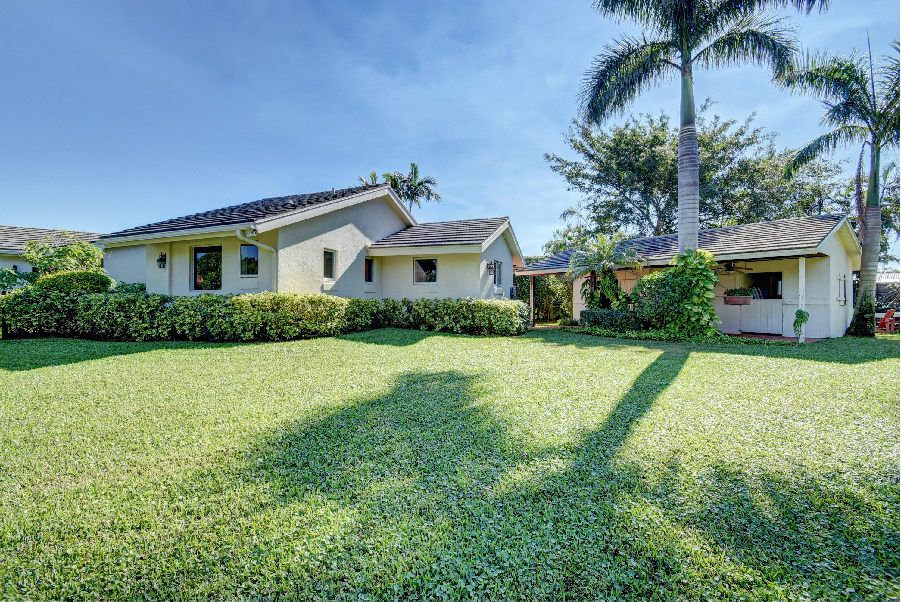 This rare 1 story 5 bdrm, 31/2 bth (plus office) home sits on over 1 acre of stunning greenery. The oversized kitchen features 2 islands, a generous amount of cabinetry, gourmet appliances & a wine refrigerator. This home offers a split bedroom plan with the master bedroom & office on one side & the auxiliary bedrooms each with a large walk in closet on the other side. Extra features include plantation shutters & crown molding throughout, central vacuum, a large laundry room & hurricane panels for the windows. French doors, along the back of the home, open to the very sunny pool which is south facing. There is an abundance of covered & uncovered outdoor patio for eating vignettes all around the pool. Adjacent to the pool is a smaller structure which can be used for a gym, office or storage