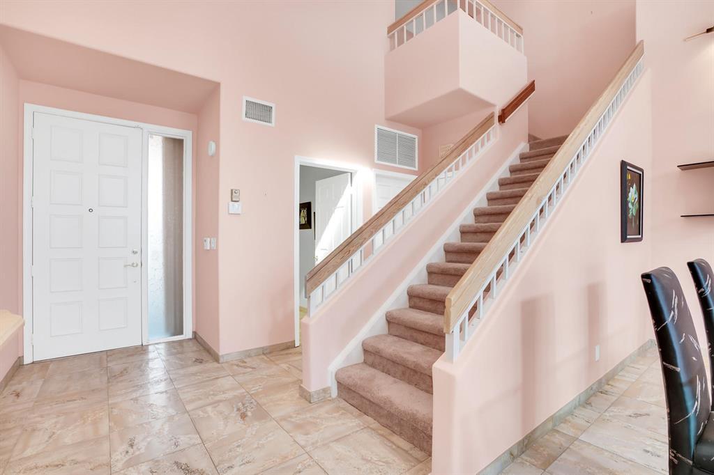 Let the sun shine in! So much natural light flows in through the clerestory windows and sliding glass doors giving this open, dramatic home such a cheery feel. High volume ceilings, sparkling lake view, oversized screened patio + fenced area for pets or playset. Updated eat-in kitchen w/modern motif features white glossy cabinets w/stainless handles, granite counters & backsplash, stainless steel appliances, pantry w/pullouts, pot drawers & large stainless sink. Master suite on 1st floor w/high ceilings, laminate floor, walk-in closet + secondary linear closet, large shower w/Grohe body sprays & a soaking tub. NO POPCORN on ceilings! All living areas are tiled. New carpet upstairs & on stairway. 2 Zone AC. Newer roof & 65 gallon water heater. Club membership NOT mandatory. Manned security.