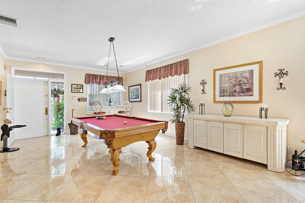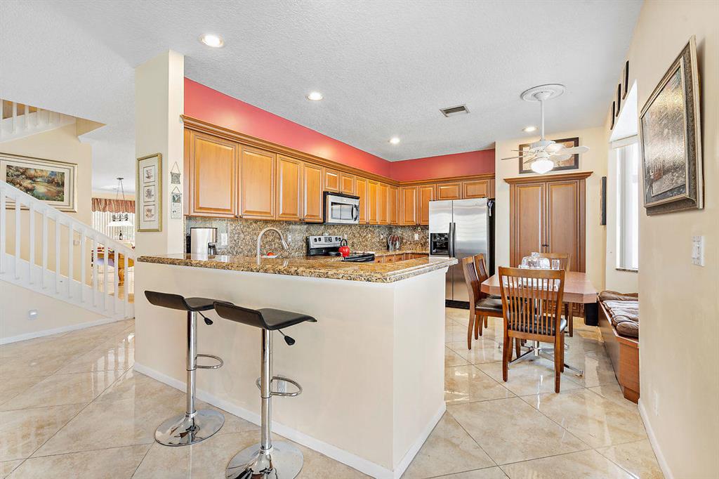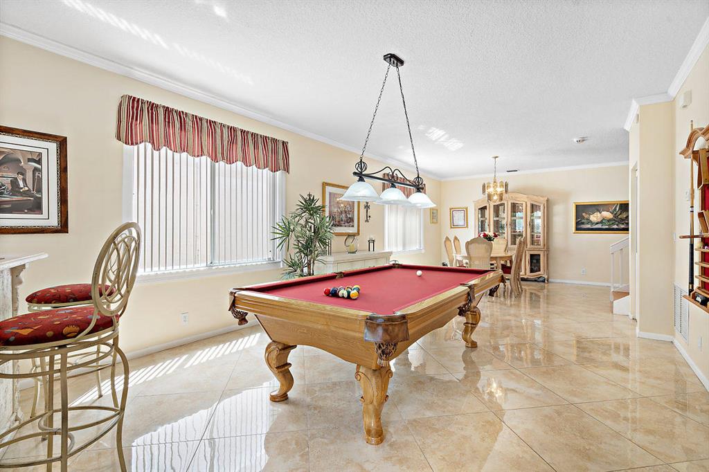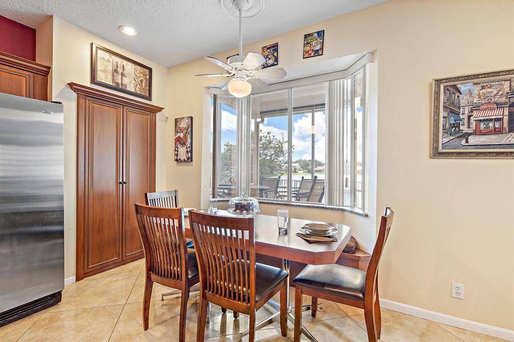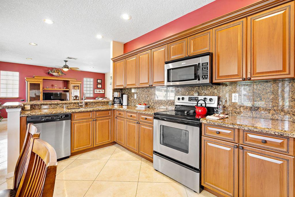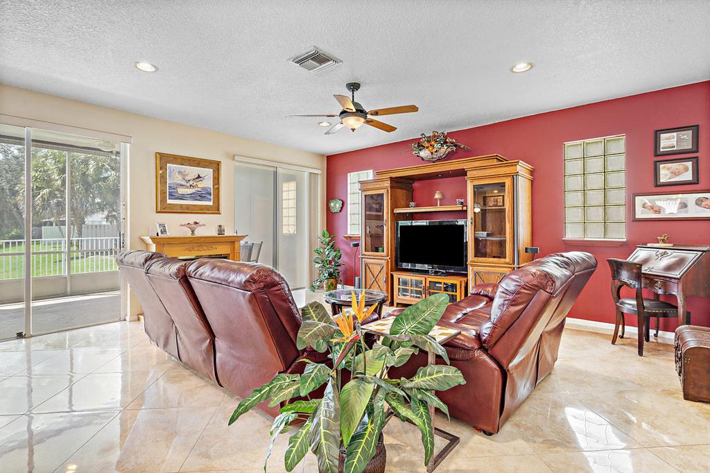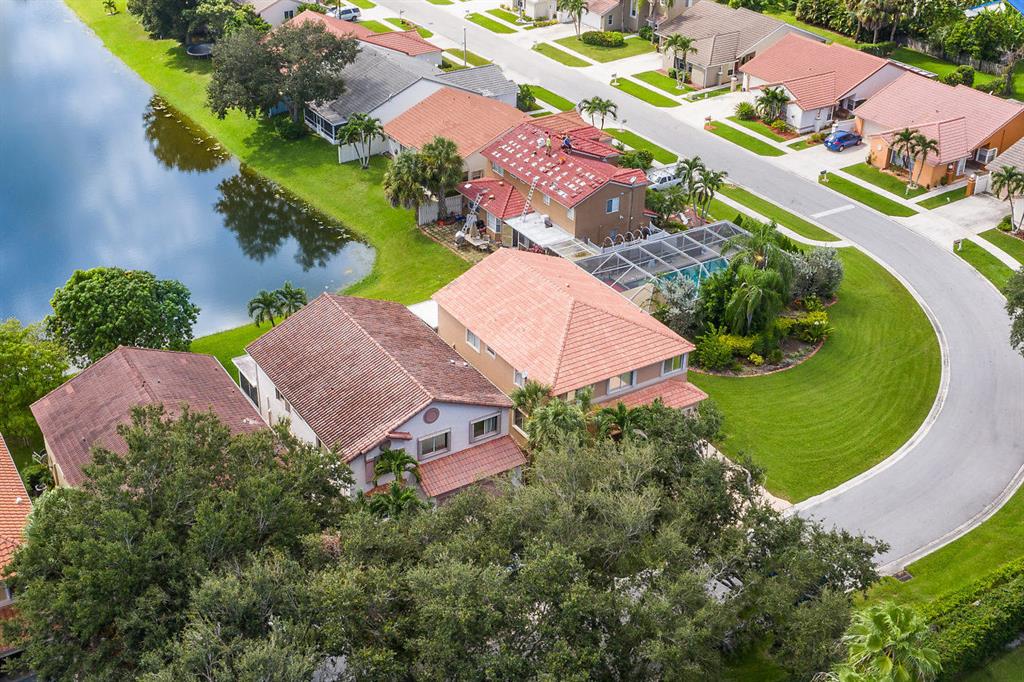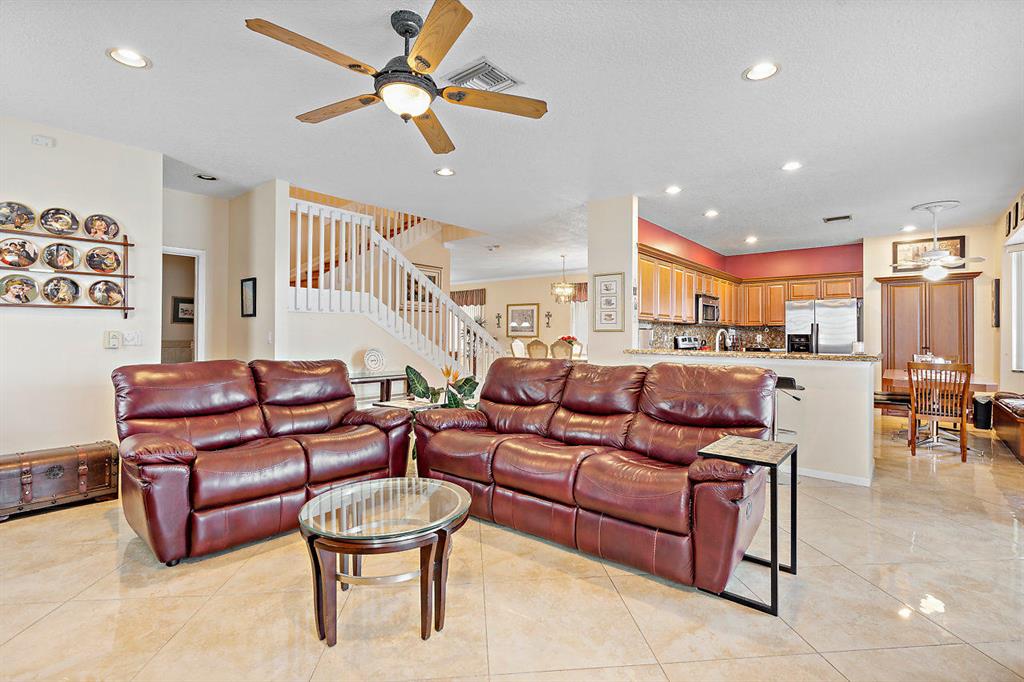 Fabulous 5 bedroom home with gorgeous long lakeside sunset views. This generous 2801 living sf home has updated large diagonal faux marble floors downstairs, updated kitchen with granite counter tops and backsplash, custom pantry and kitchen dining area with lake views, stainless steel appliances, crown molding, large windows with plenty of light and lake views. Relish the sunset views every day from the large covered and screened in patio area. Enjoy this comfortable home with wood floors trailing upstairs to the landing area embracing 5 generous bedrooms with ceiling fans, accordion hurricane shutters and window tinting for energy savings on all windows. Elegant crown molding decor. This gracious home sits next to a garden like corner lot with no front neighbors in a ...click more